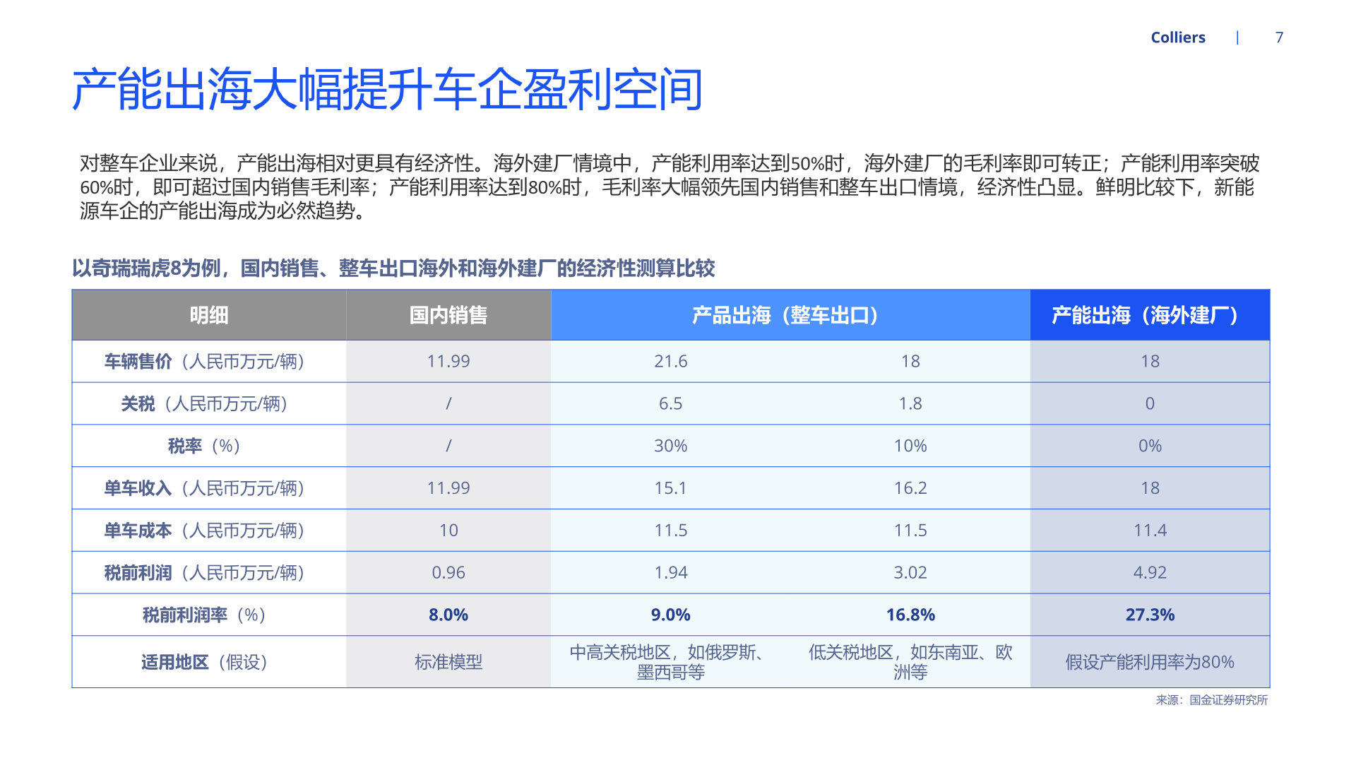 对整车企业来说,产能出海相对更具有经济性。海外建厂情境中,产能利用率达到50%时,海外建厂的毛利率即可转正;产能利用率突破 60%时,即可超过国内销售毛利率;产能利用率达到80%时,毛利率大幅领先国内销售和整车出口情境,经济性凸显。鲜明比较下,新能 源车企的产能出海成为必然趋势。