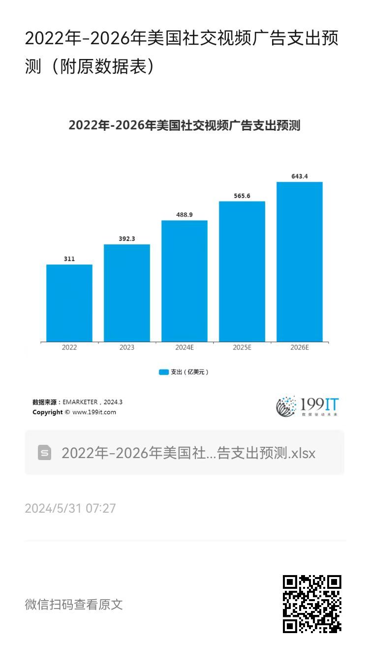 2022年-2026年美国社交视频广告支出预测(附原数据表) ​​​