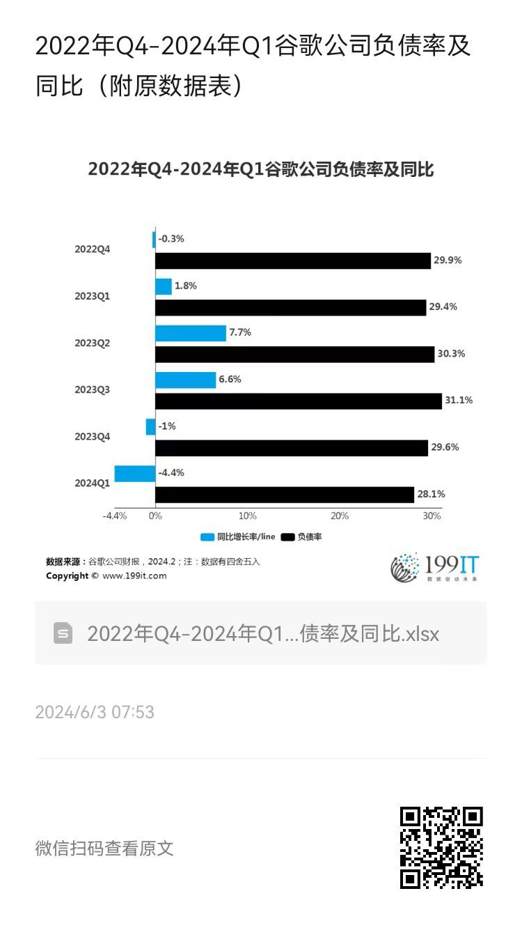 2022年Q4-2024年Q1谷歌公司负债率及同比(附原数据表) ​​​