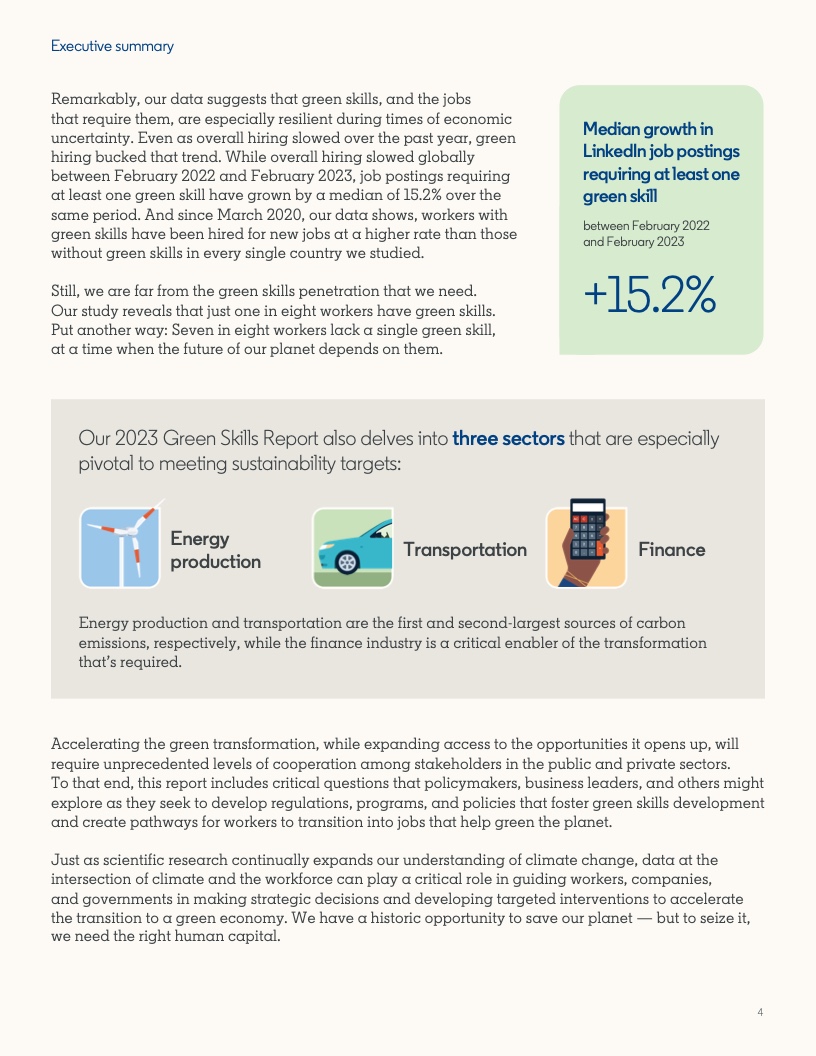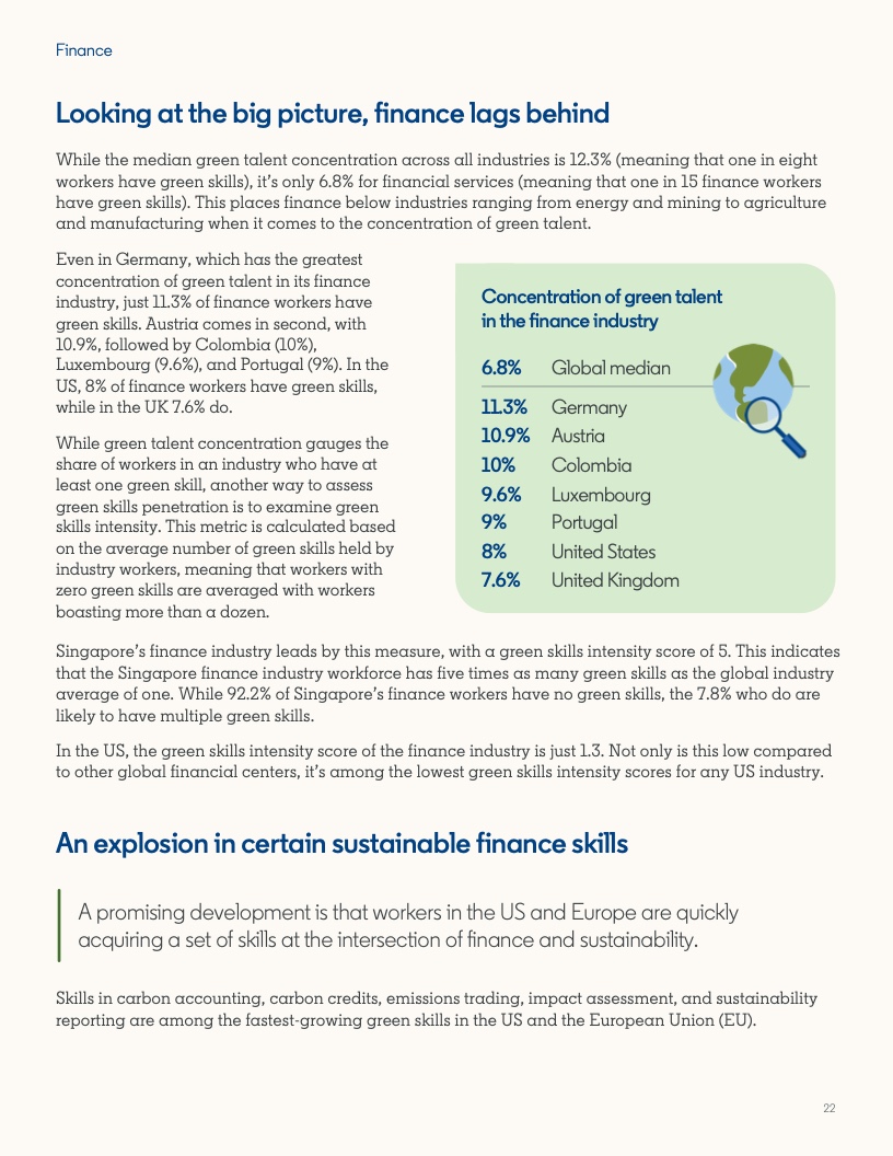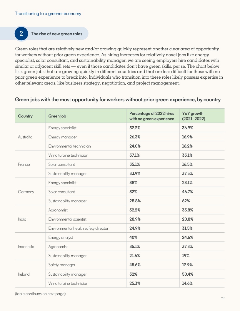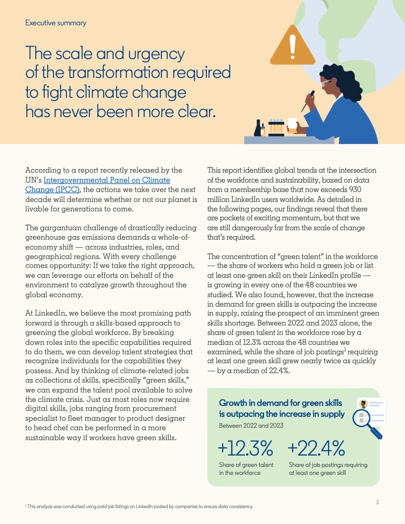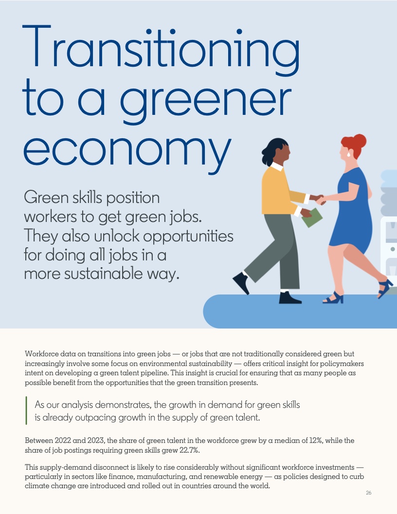 2022年至2023年期间,具备应对气候危机的技能的人才比例增长了12.3%。然而,同期发布的岗位中,要求至少具备一项绿色技能的工作岗位的增速几乎是前者的两倍,达到22.4%。拥有绿色技能的求职者被录用的可能性(29%)比平均水平高出近三分之一。
