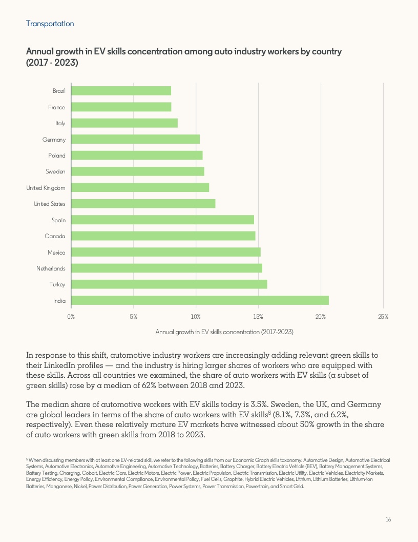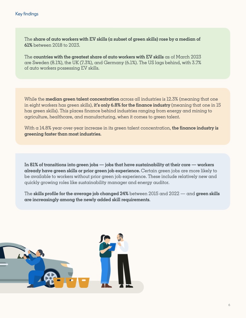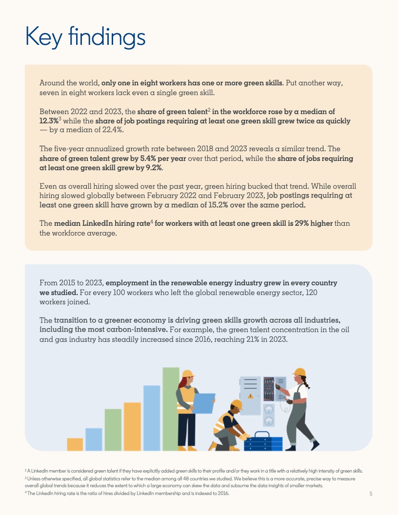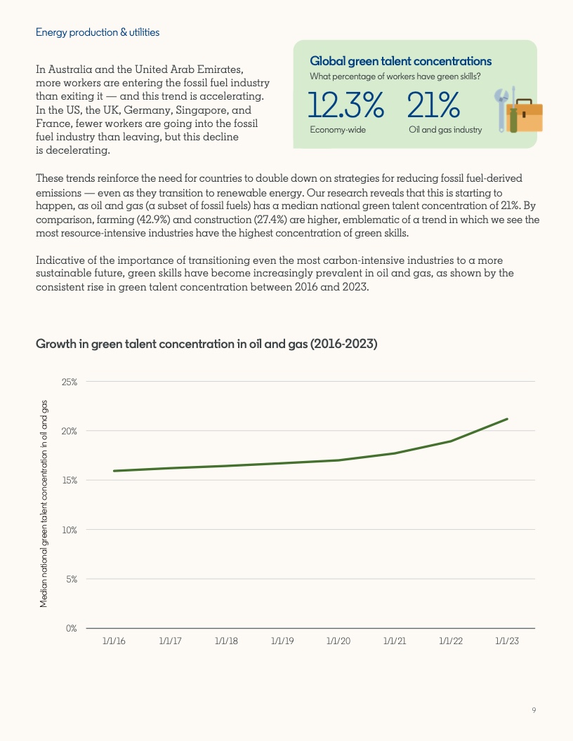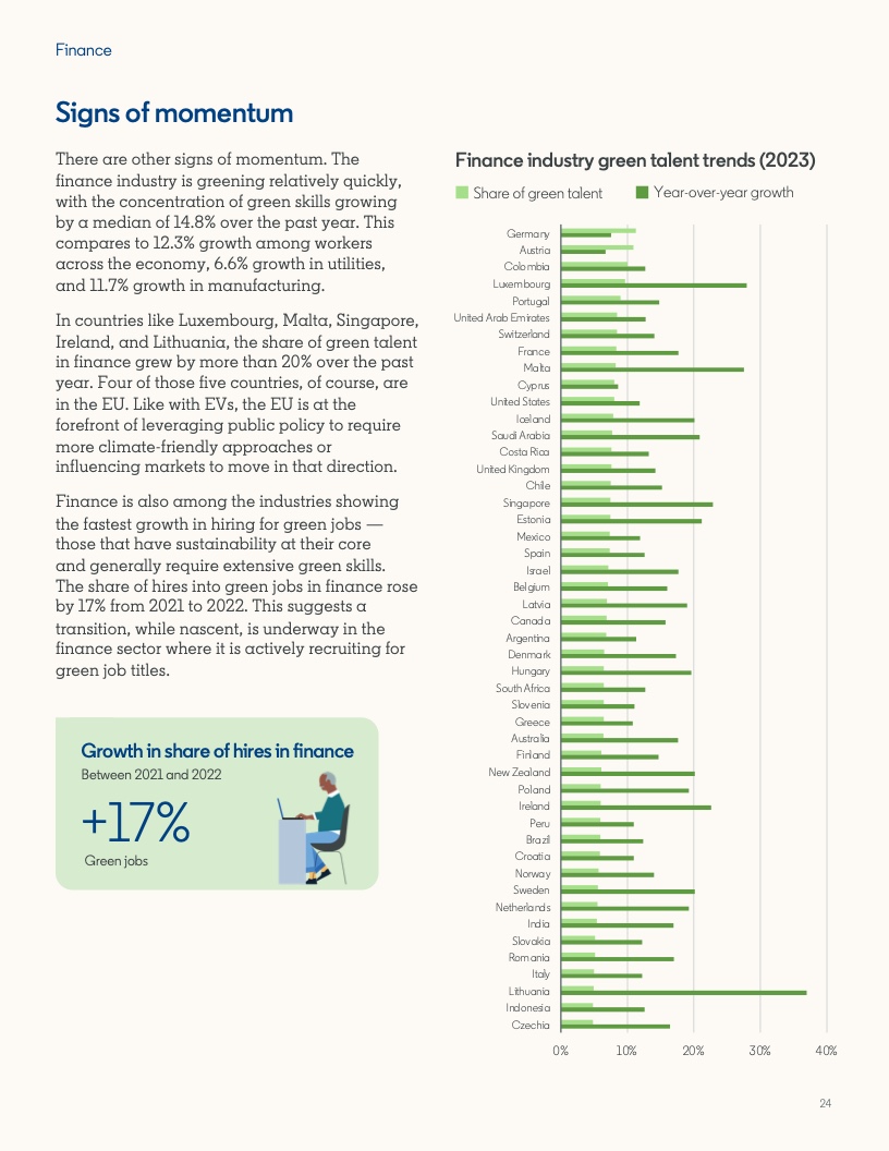 2022年至2023年期间,具备应对气候危机的技能的人才比例增长了12.3%。然而,同期发布的岗位中,要求至少具备一项绿色技能的工作岗位的增速几乎是前者的两倍,达到22.4%。拥有绿色技能的求职者被录用的可能性(29%)比平均水平高出近三分之一。