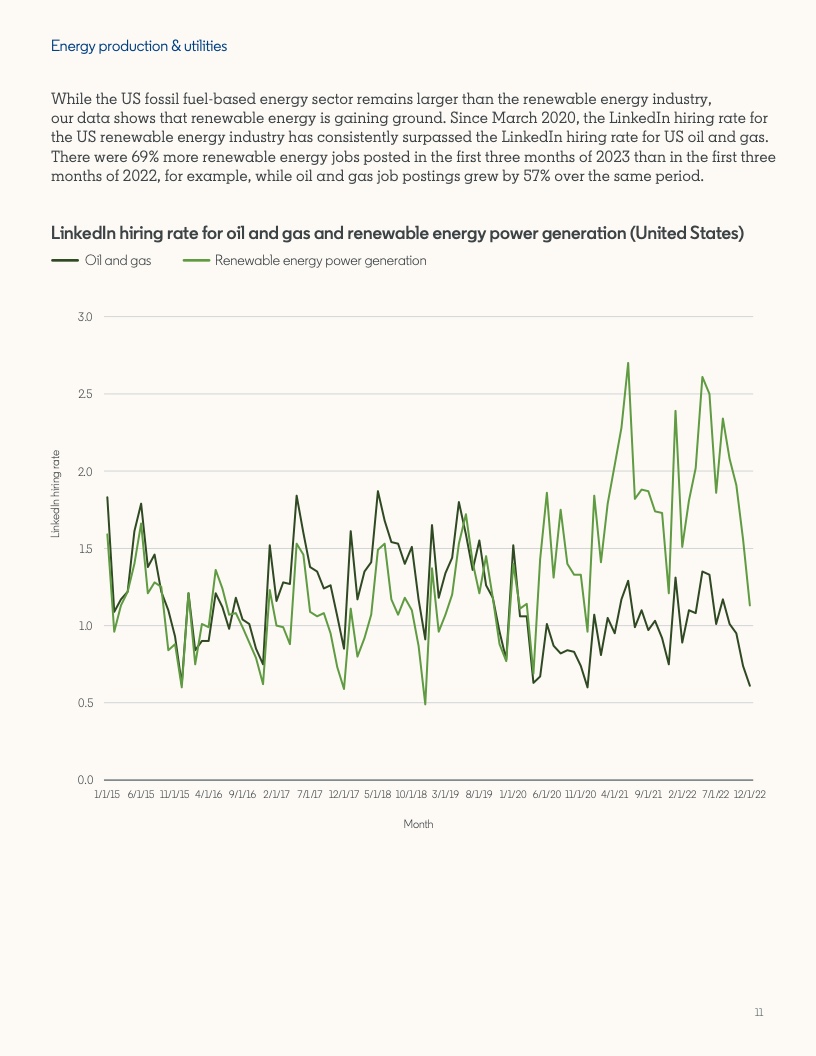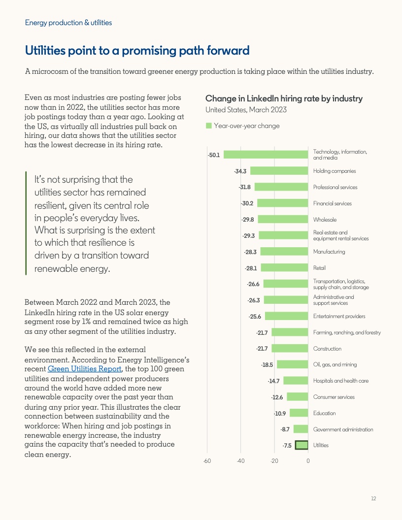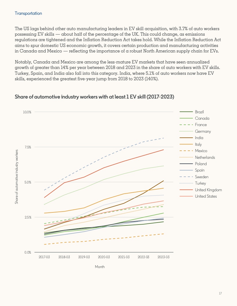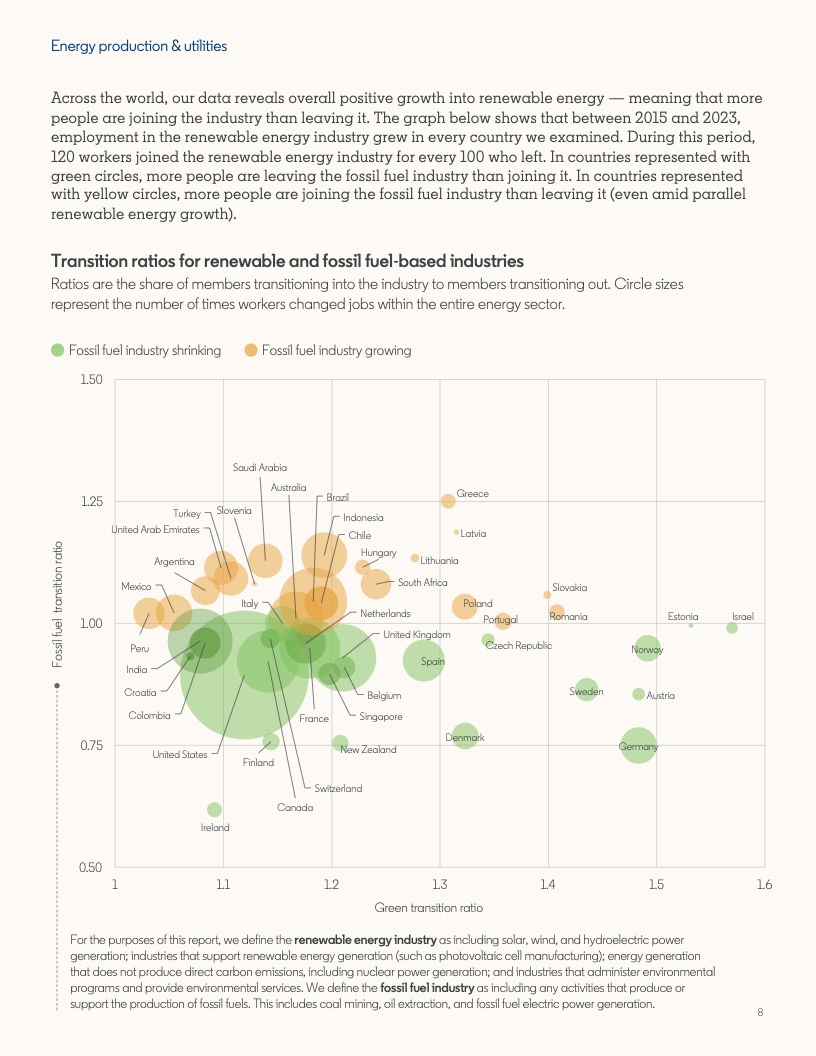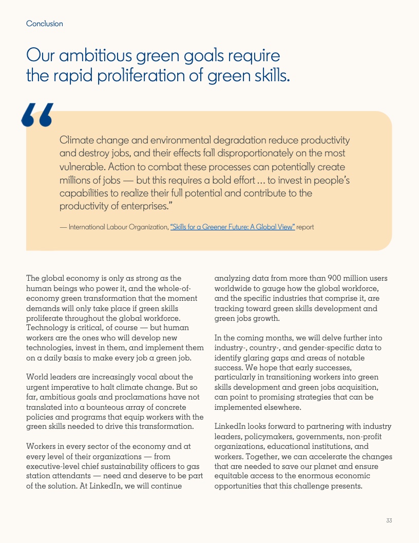 2022年至2023年期间,具备应对气候危机的技能的人才比例增长了12.3%。然而,同期发布的岗位中,要求至少具备一项绿色技能的工作岗位的增速几乎是前者的两倍,达到22.4%。拥有绿色技能的求职者被录用的可能性(29%)比平均水平高出近三分之一。
