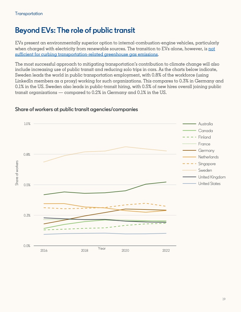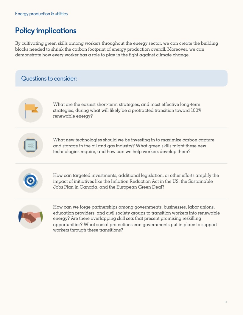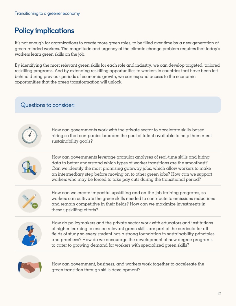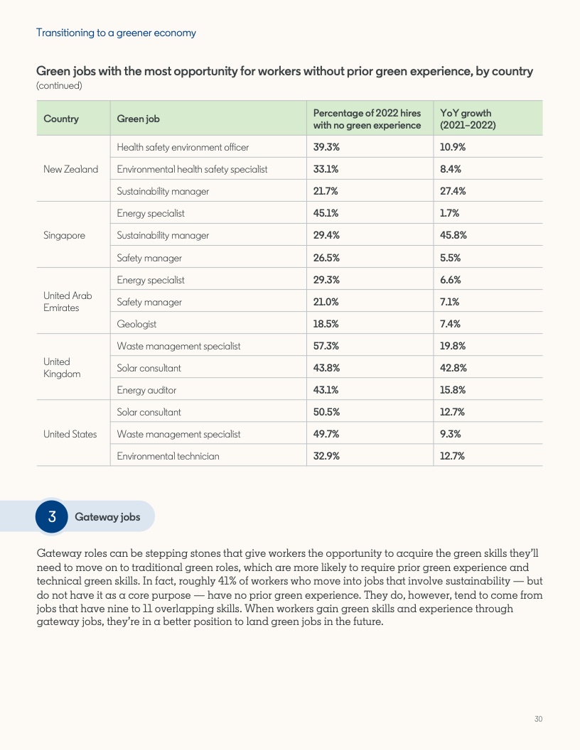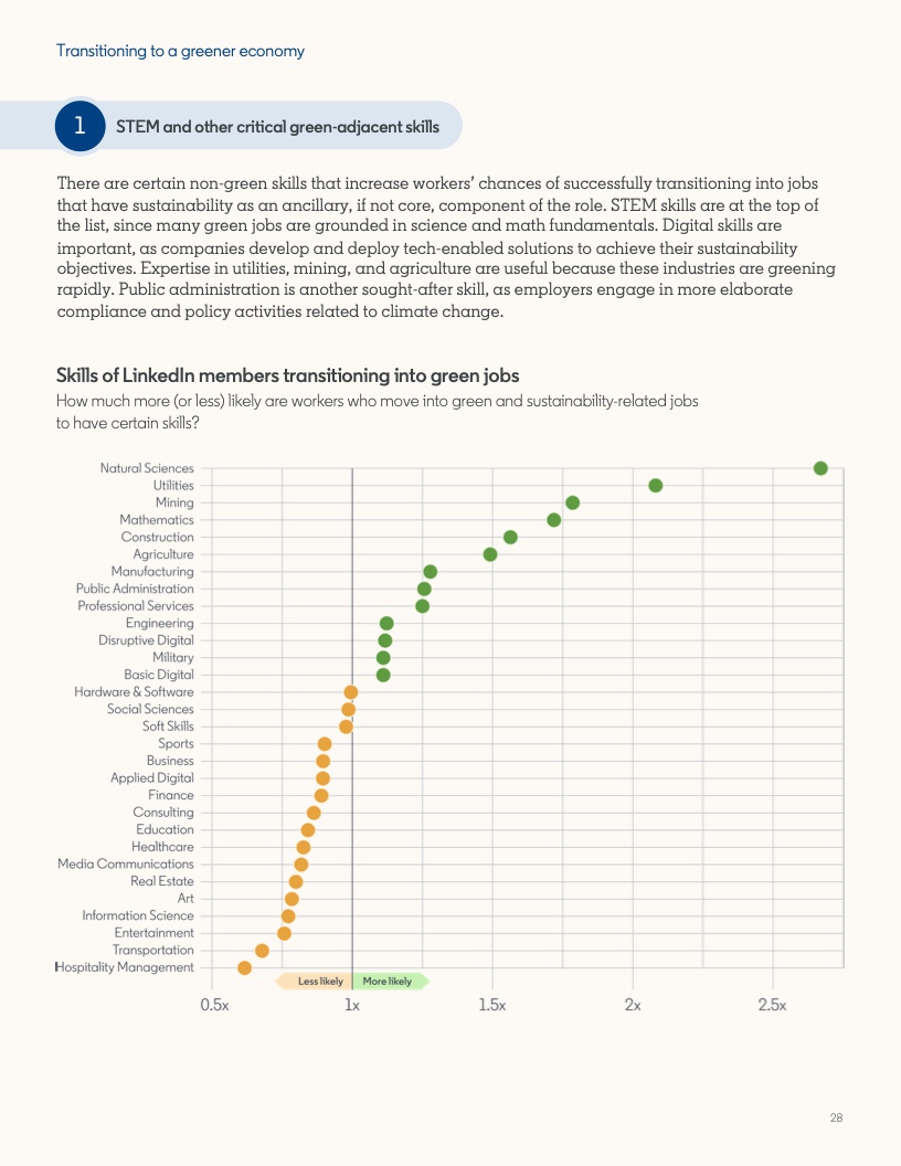 随着对绿色技能需求的增长,让人才的技能跟上时代发展,对于雇主来说是一项艰巨的任务。从建筑到管道工程,除了扩大愈发需要绿色技能的工作中工人的技能组合外,这还意味着优化机会,使工人能够进入完全成熟的绿色经济行业工作。成功进入该行业工作的工人中,有80%通常都掌握了一定程度的绿色技能或拥有相关工作经验。报告发现,STEM、公共管理或专业服务背景也可以成为向绿色职位转型的途径。
