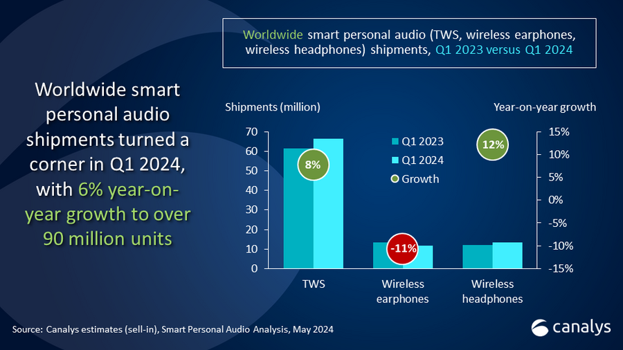 根据Canalys的最新估计,全球智能个人音响市场在2024年第一季度显示出复苏迹象,出货量同比增长6%,达到9000多万台。这种复苏主要是由真无线立体声(TWS)和无线耳机推动的,它们的出货量分别增长了8%和12%。各大厂商积极在各个细分市场寻求新的发展机遇,为行业注入新的活力。
