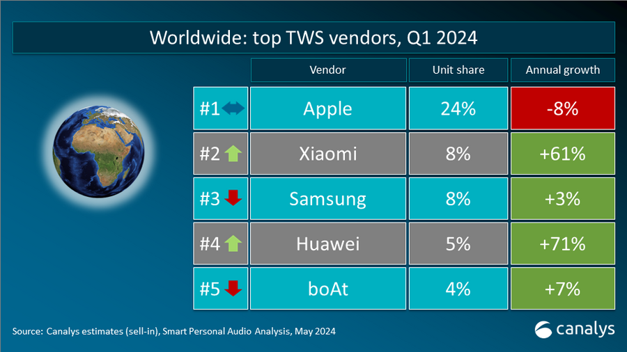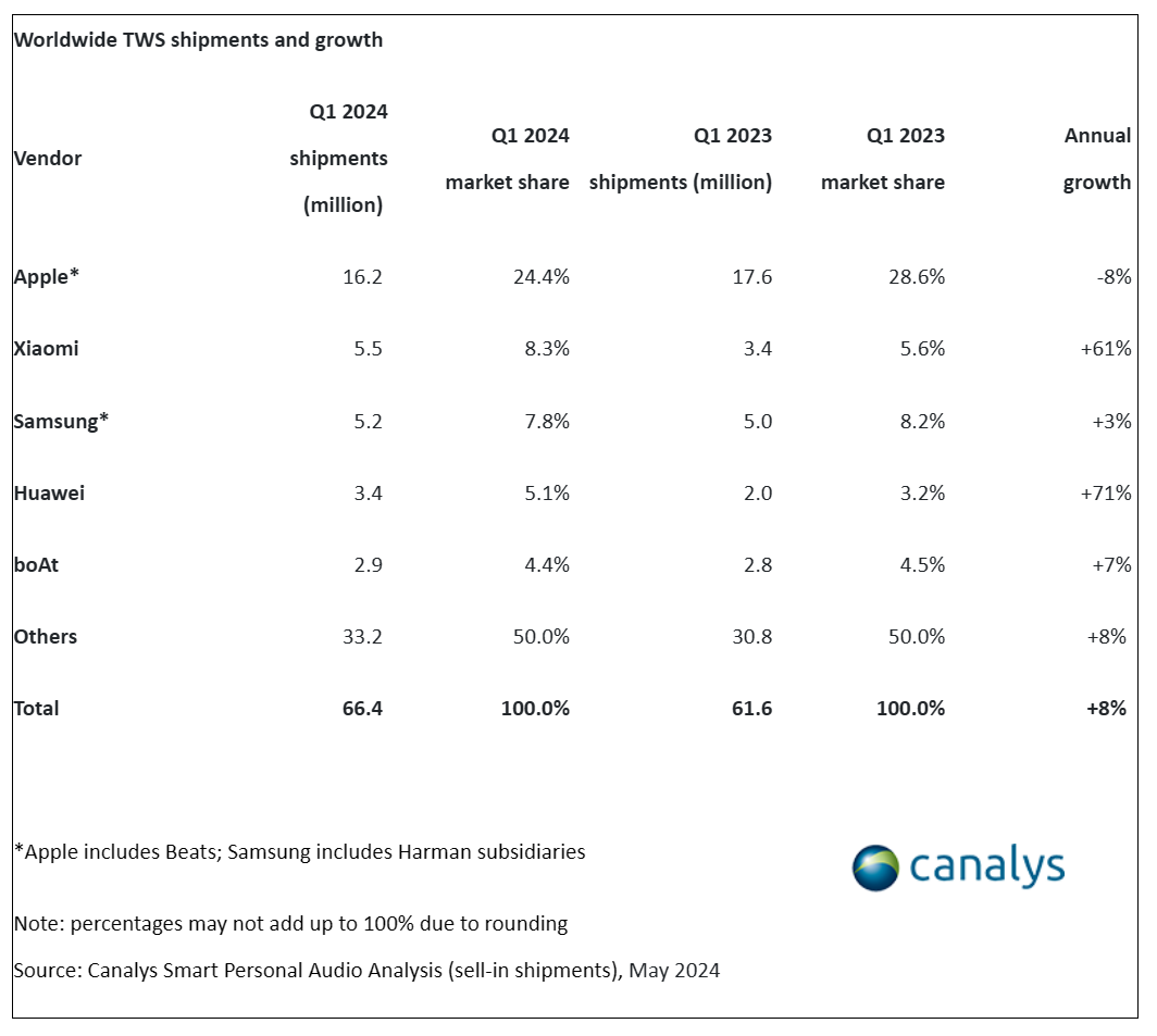 作为智能个人音频市场的关键细分市场,TWS保持了稳定的出货量,尽管面临产品差异化有限和消费者认知度高等挑战。Canalys Research分析师Jack Leathem表示:“随着消费者对TWS的熟悉程度越来越高,TWS市场已经趋于稳定,导致供应商更多地依靠定价策略来实现增长。”例如,小米以低至15美元的产品进入中低端市场,扩大了市场份额,成功超越三星,成为第二大品牌,增长率为61%。同时,华为推出了首款30美元以下的产品,并扩大了海外市场,实现了71%的显著增长。三星电子将高端的主动降噪(ANC)功能整合到初级产品中,保持了竞争力。随着TWS市场的饱和,厂商开始转向新兴的开放式可穿戴立体声(OWS)市场寻找新的机会。