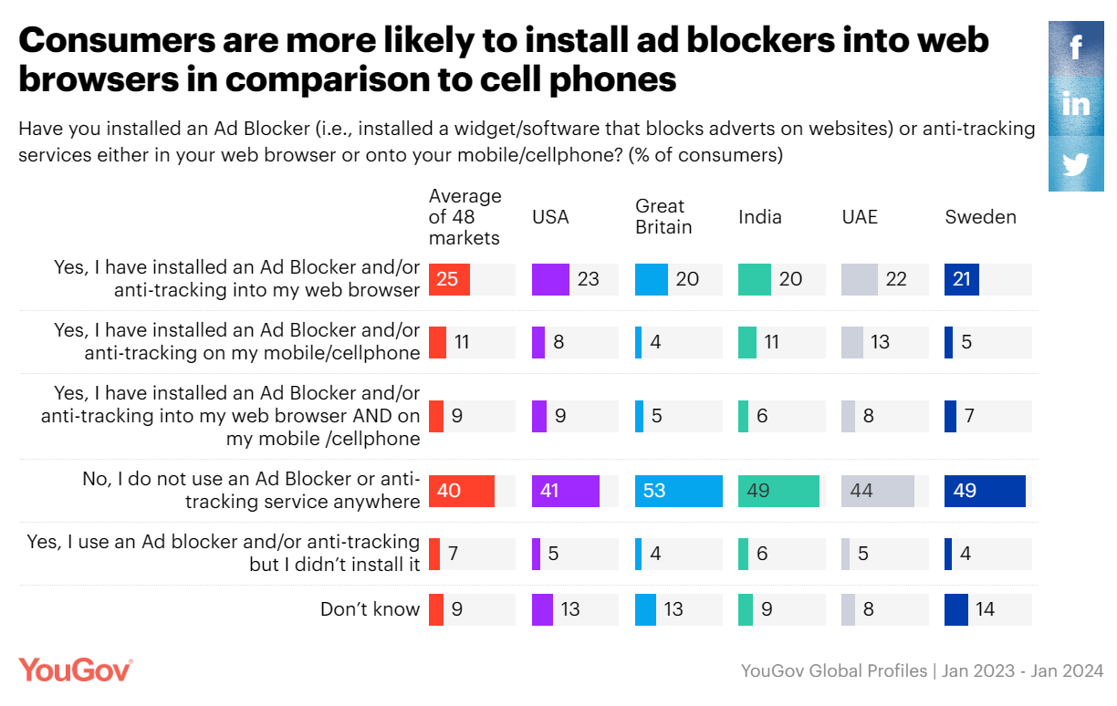 YouGov的新数据提供了对48个市场广告拦截器和反跟踪软件采用情况的洞察。