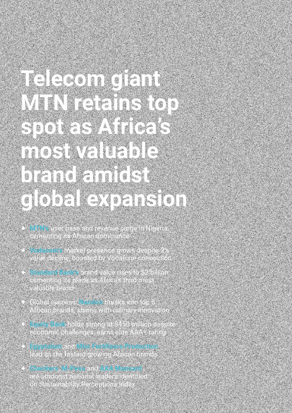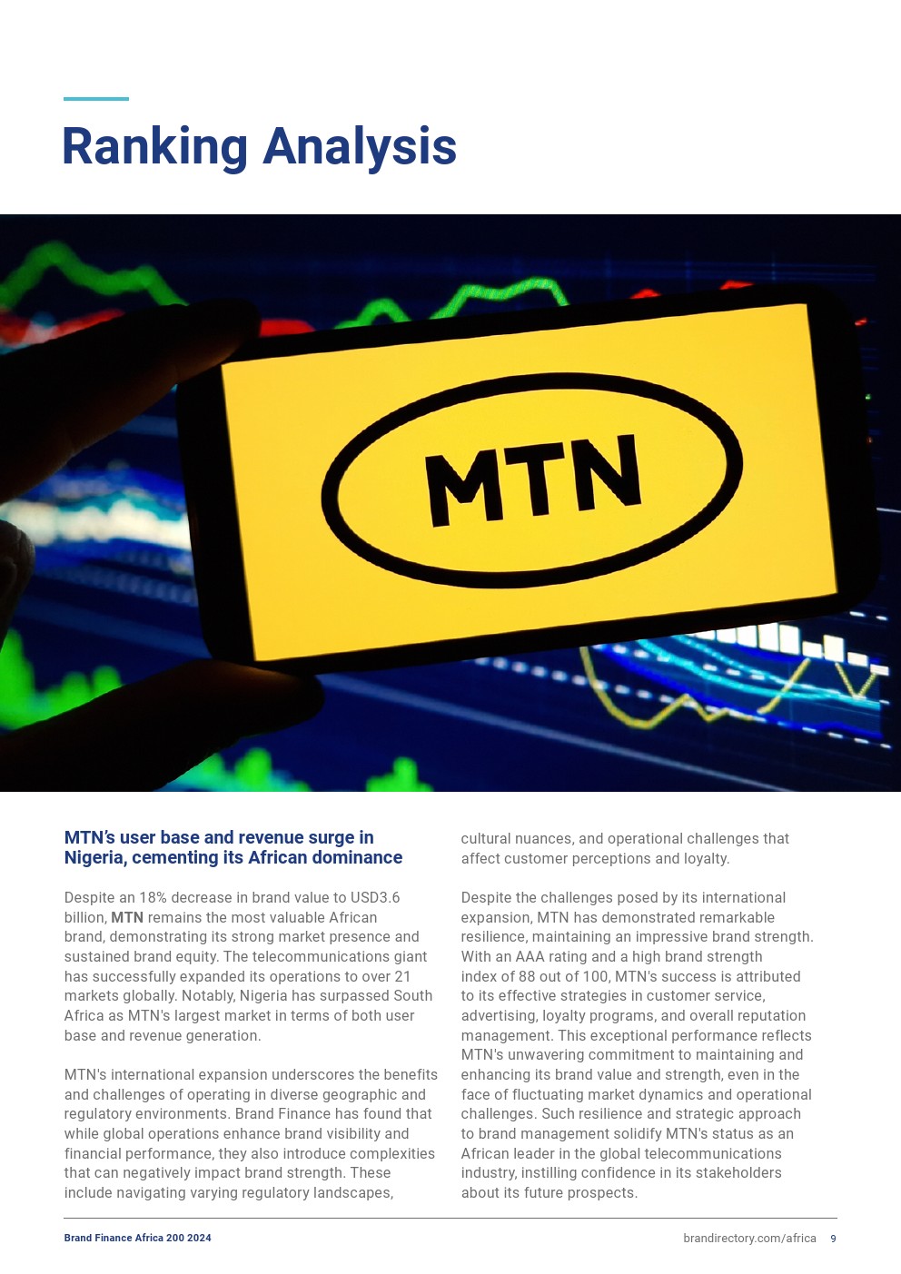 根据Brand Finance的新报告“2024年非洲品牌200强”,尽管品牌价值下降了18%,降至36亿美元,但电信巨头MTN仍保持着非洲大陆最有价值品牌的地位。这一估值凸显了MTN强劲的市场占有率和持续的品牌资产,得益于尼日利亚庞大的用户群和收入增长。尼日利亚目前已超过南非,成为MTN最大的市场。