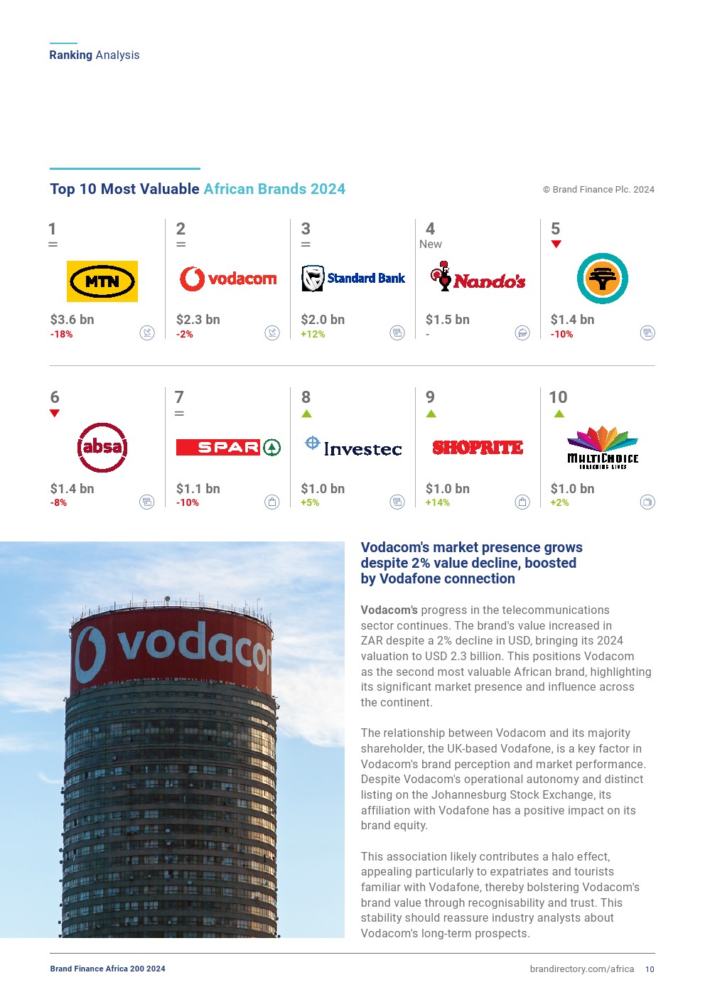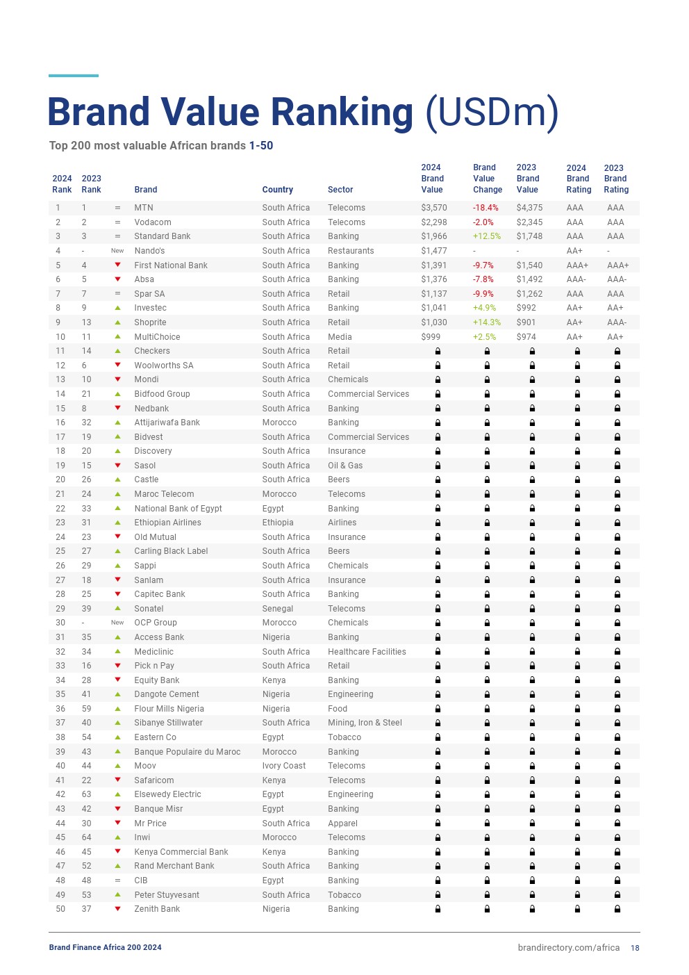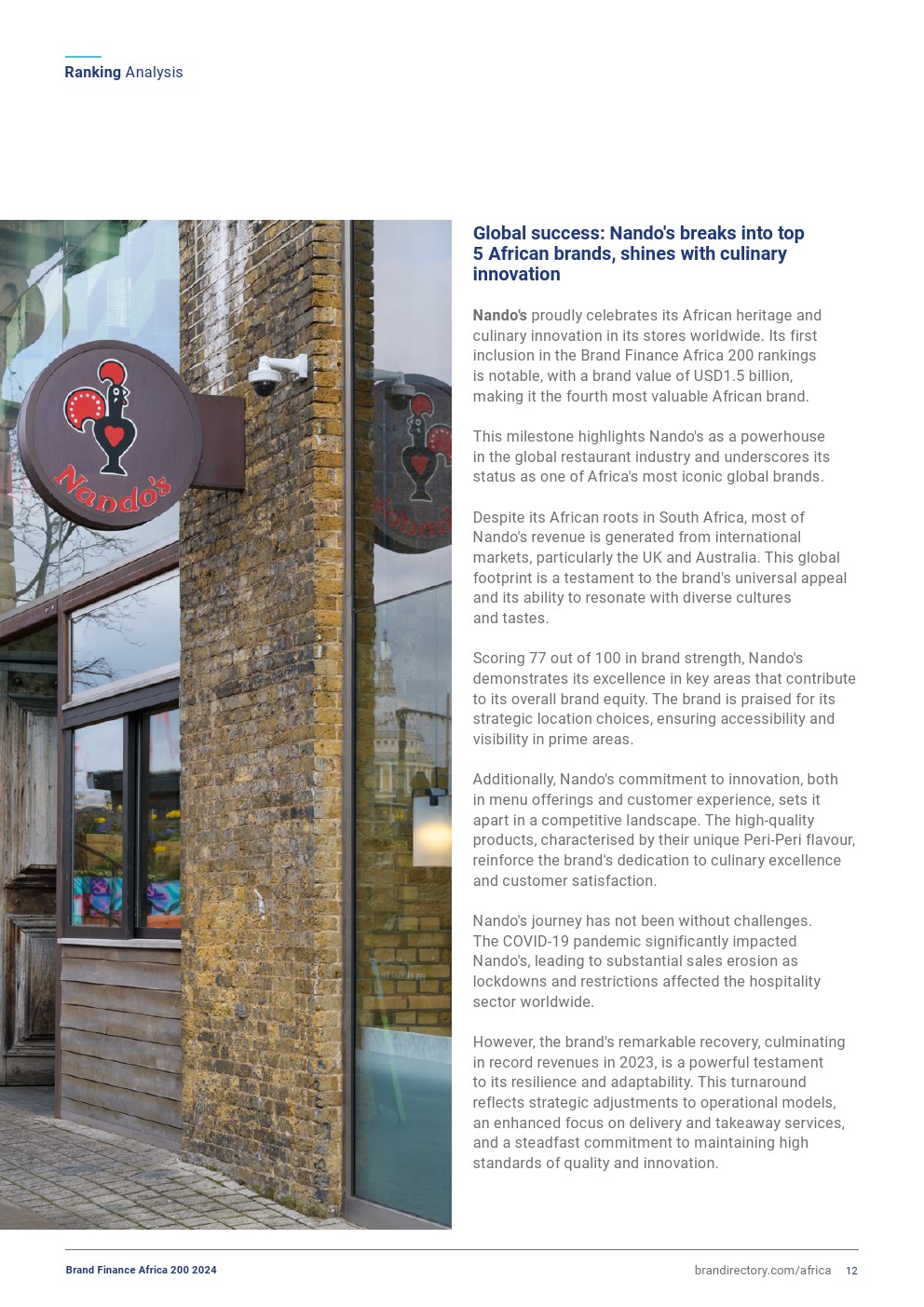 Nando’s以15亿美元的价值进入了排名,成为非洲第四大最有价值品牌。Nando’s以其非洲传统和烹饪创新而闻名,已在全球扩张,英国和澳大利亚的收入贡献巨大。