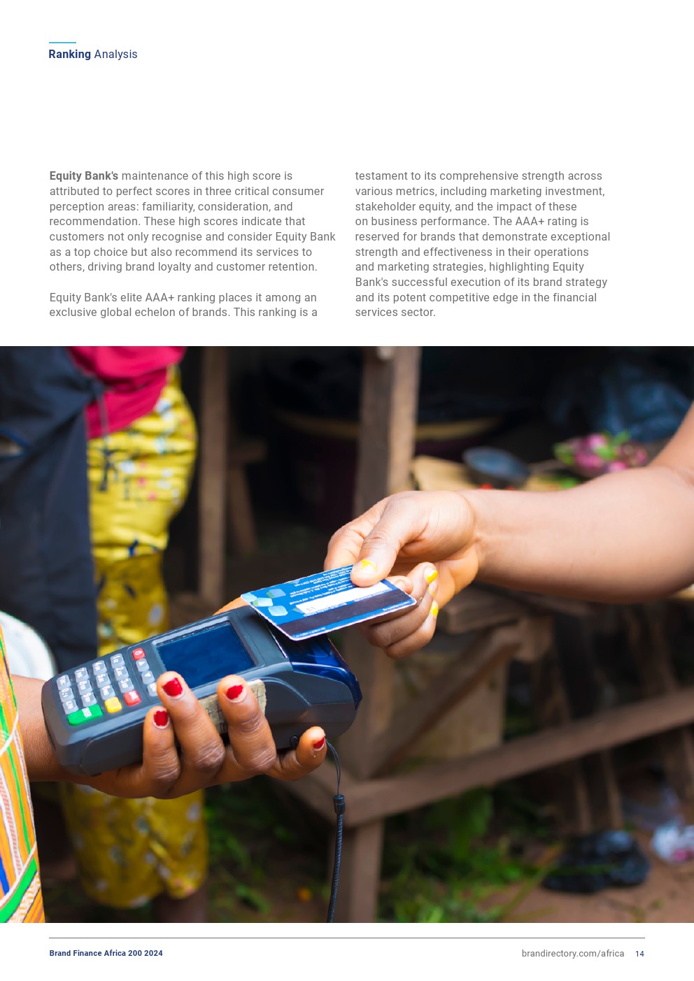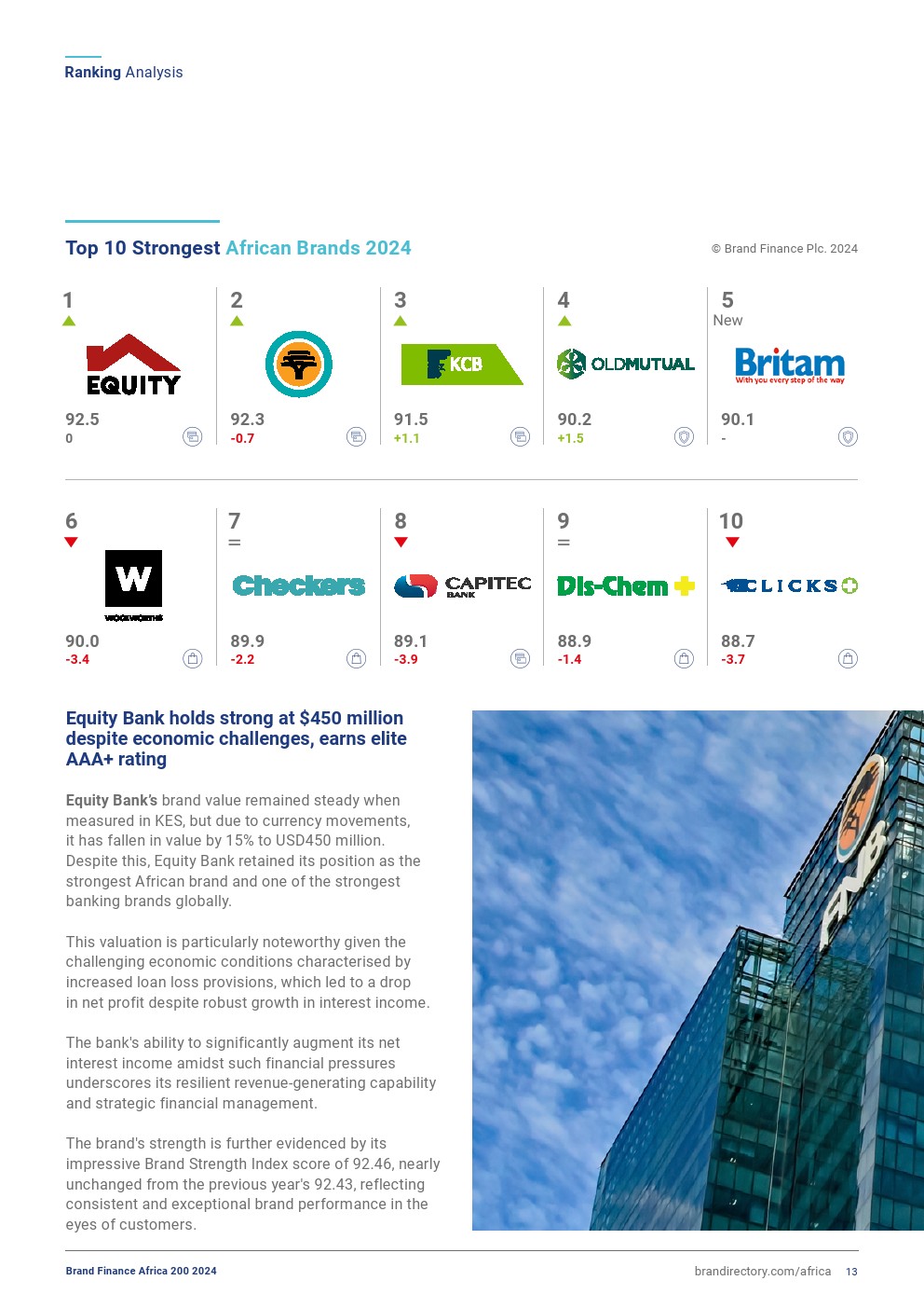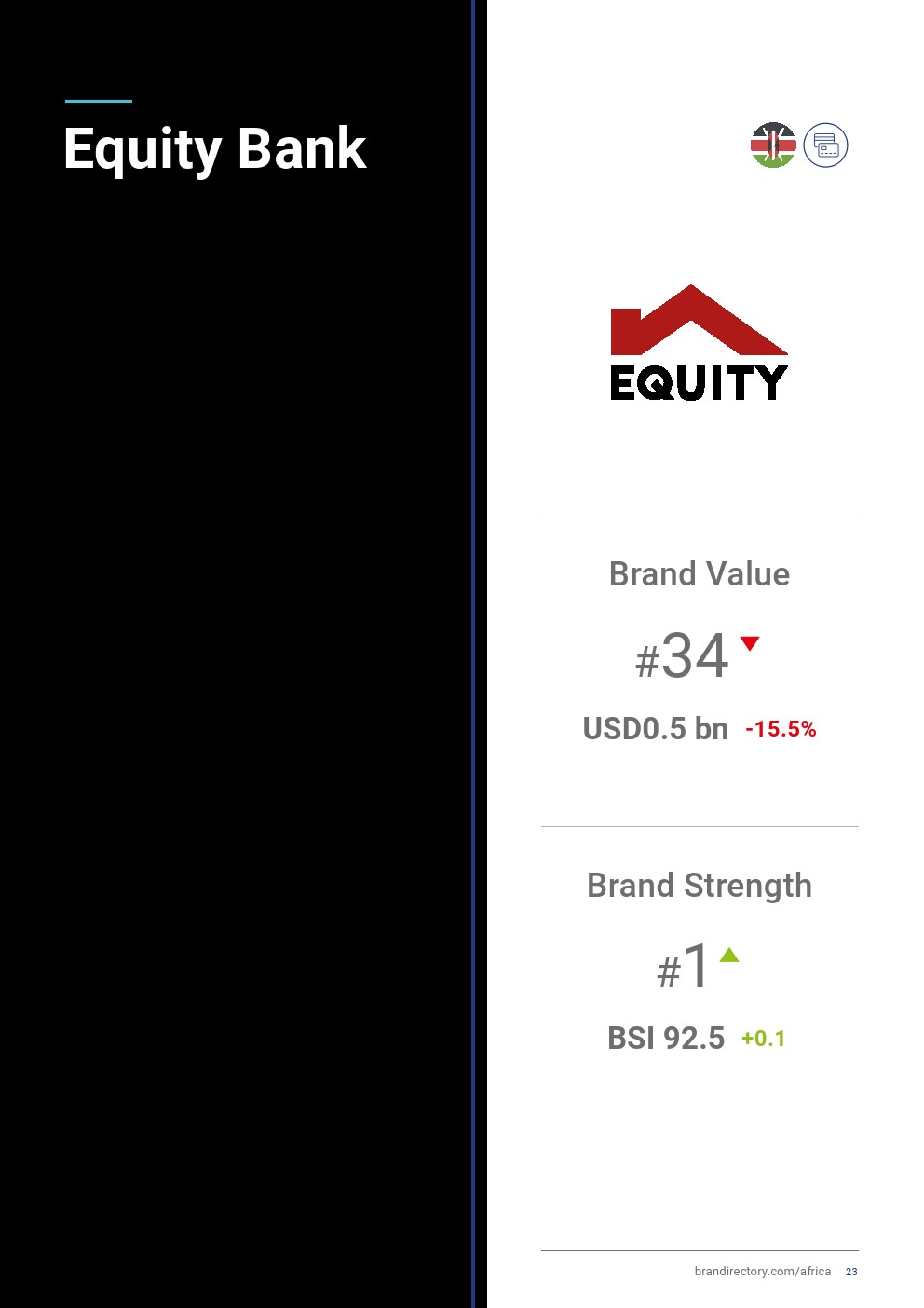 尽管面临经济挑战,股权银行仍保持了4.5亿美元的品牌价值。其强大的创收能力和战略财务管理为其赢得了AAA+的精英评级。股权银行的品牌实力指数为93分,客户熟悉度、考虑度和推荐度高,反映了其卓越的品牌绩效和忠诚度。