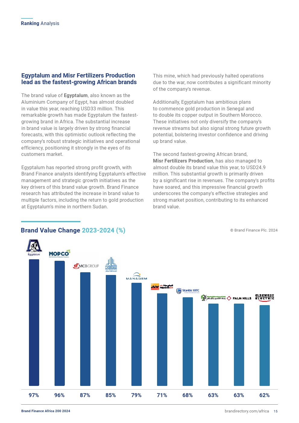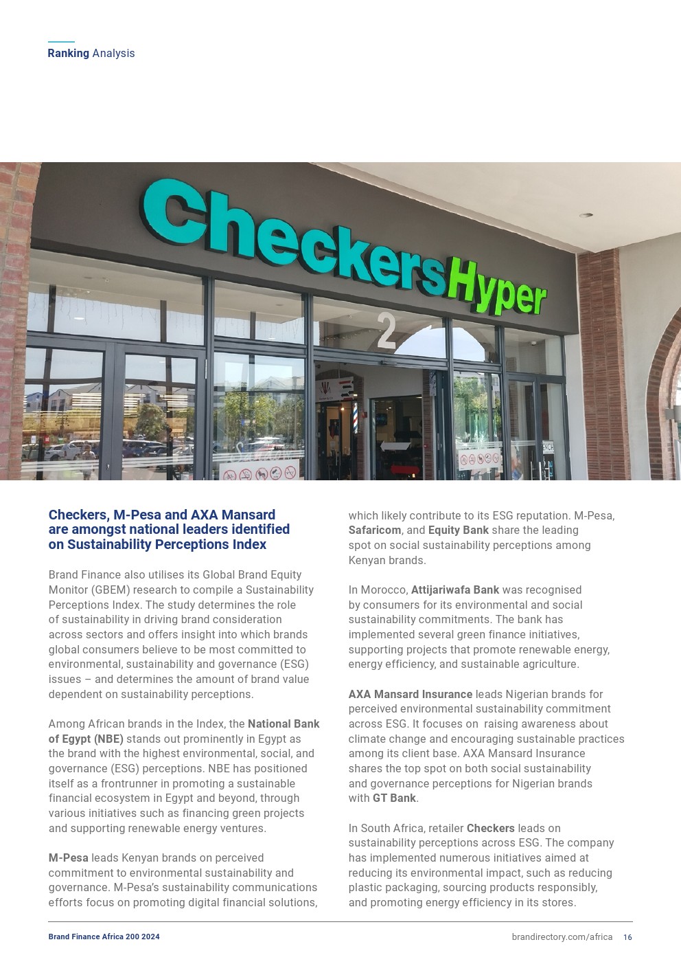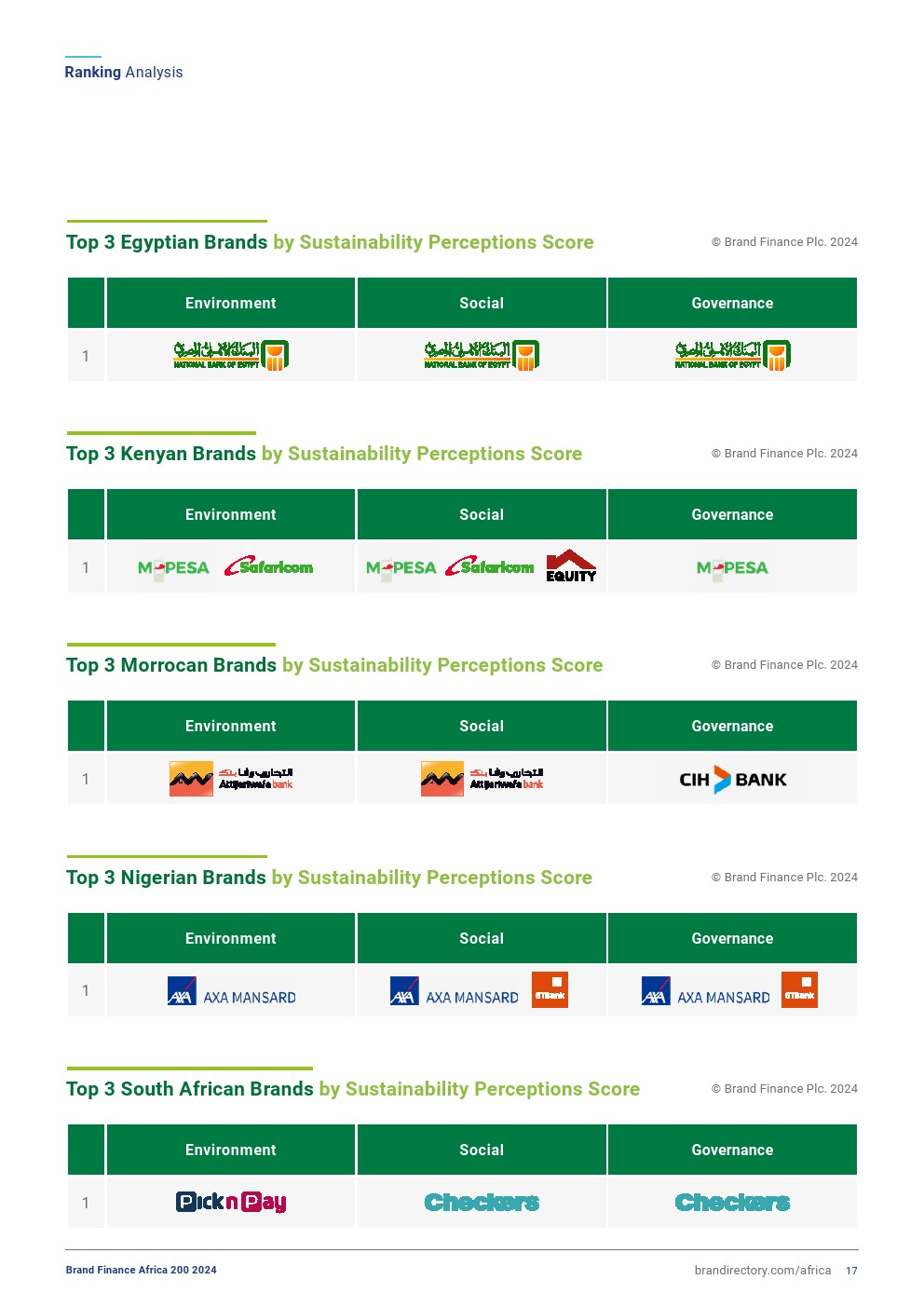 Brand Finance的可持续发展感知指数突出了致力于ESG问题的领先品牌。值得一提的有埃及国家银行、肯尼亚的M-Pesa和南非的Checkers,它们在环境、社会和治理方面的努力得到了认可。