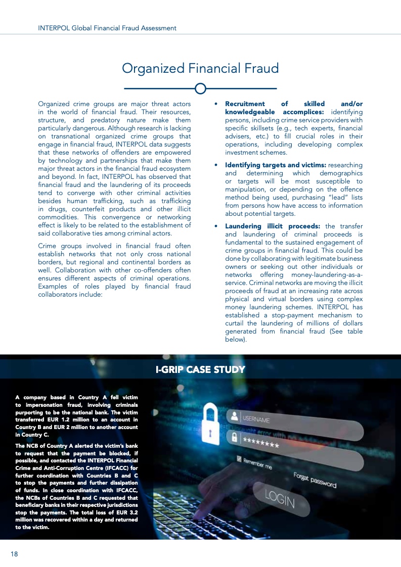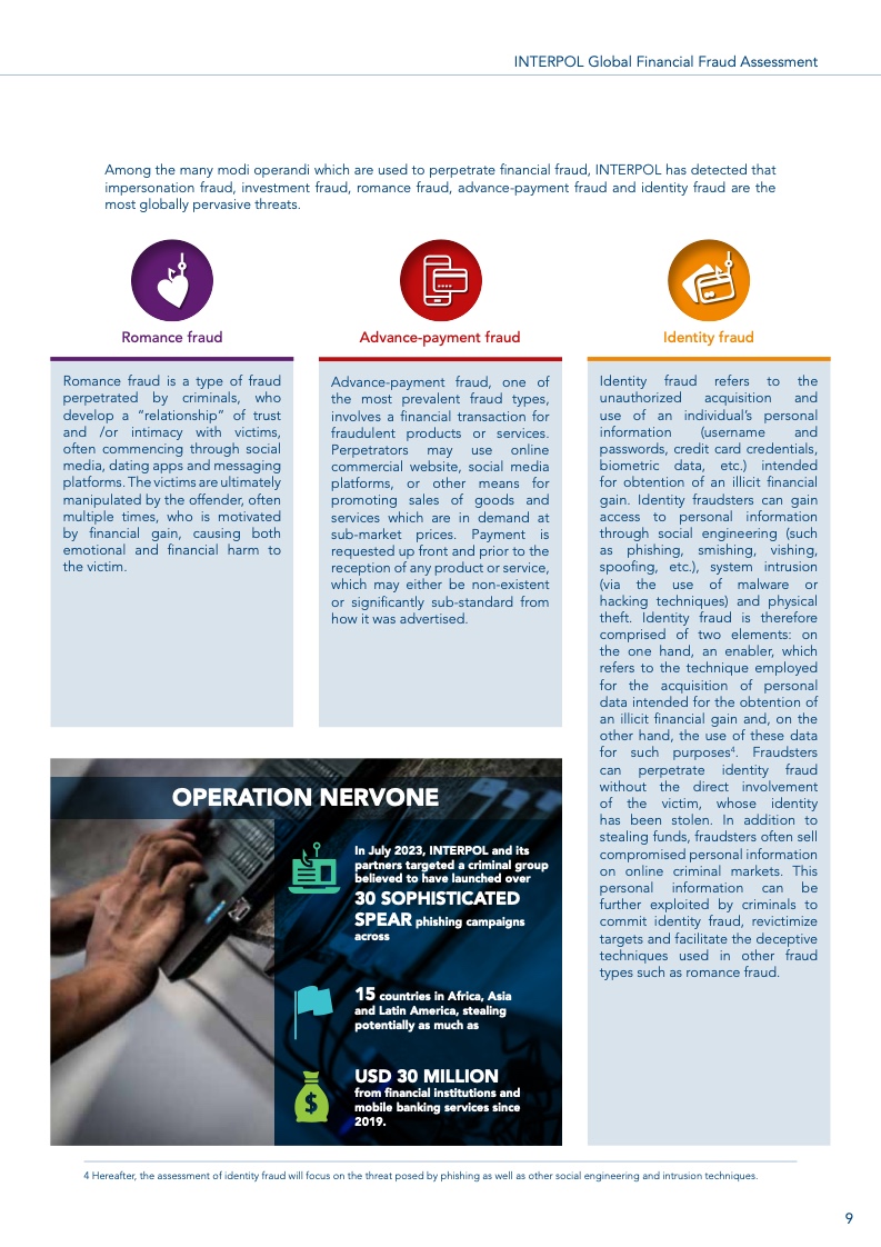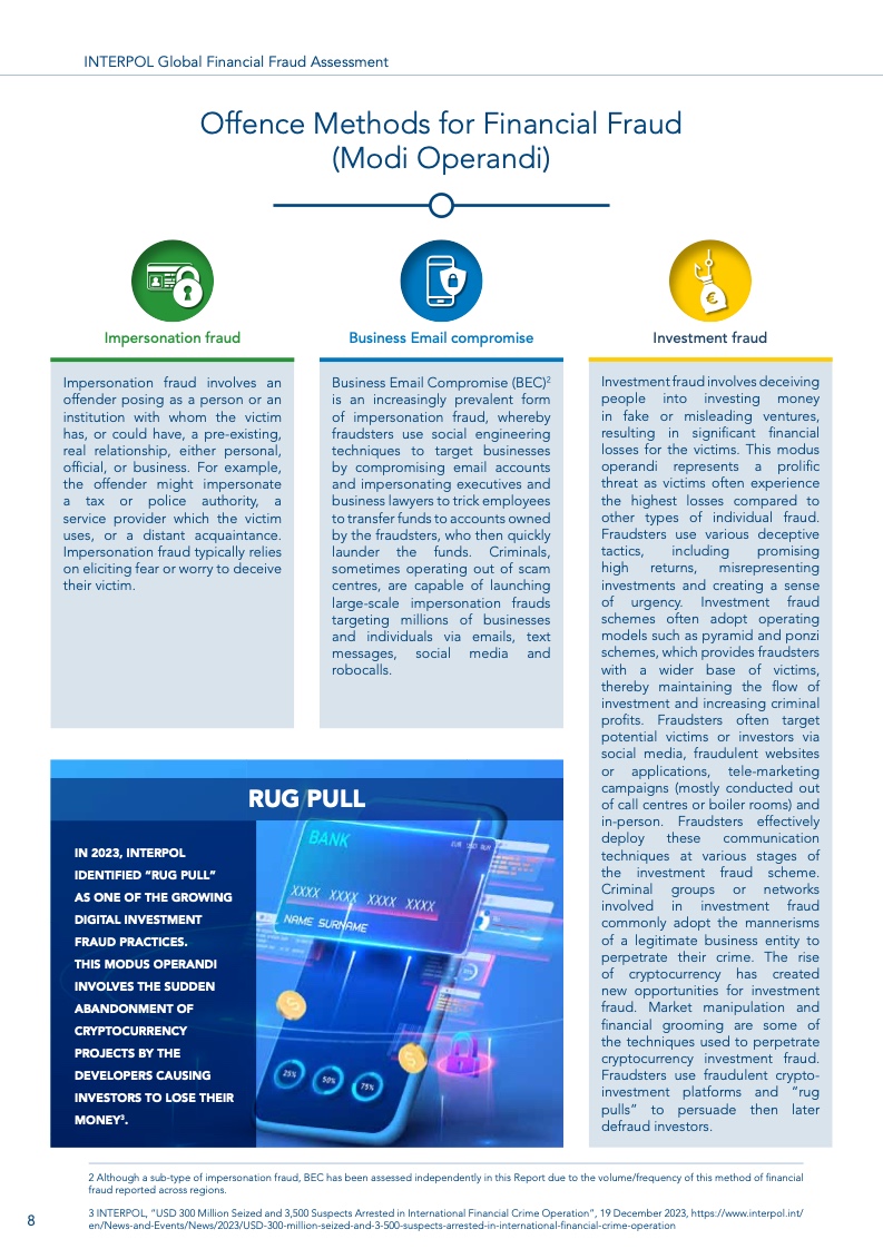 金融欺诈类型: 最常见的全球金融欺诈类型包括投资欺诈、预付款欺诈、浪漫欺诈和商业电子邮件妥协(BEC)。