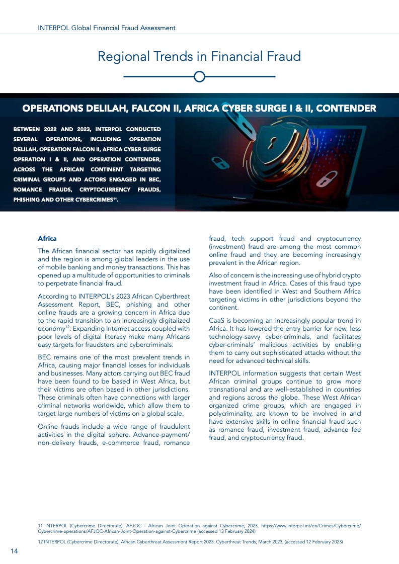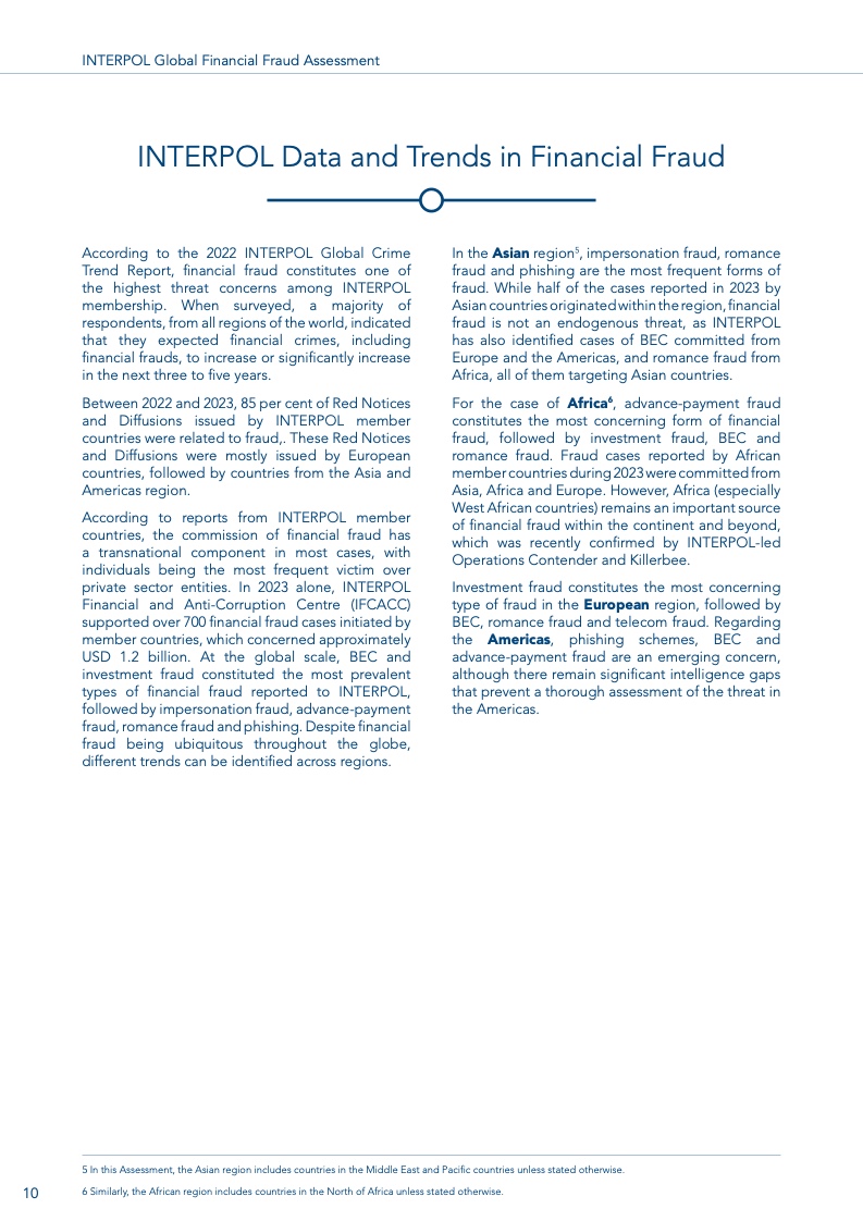 地区趋势: 不同地区的金融欺诈形式有所不同。例如,在亚洲,冒充欺诈、浪漫欺诈和网络钓鱼是最常见的欺诈形式;而在非洲,则是预付款欺诈和投资欺诈;在美洲,网络钓鱼和BEC是新兴的关注点。