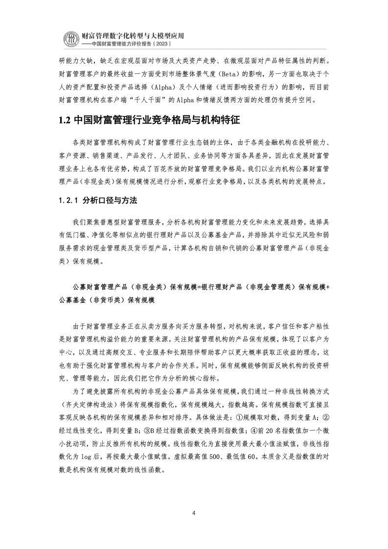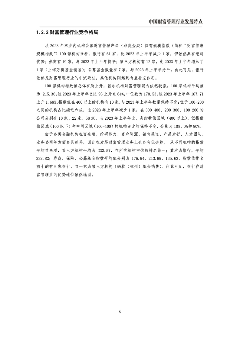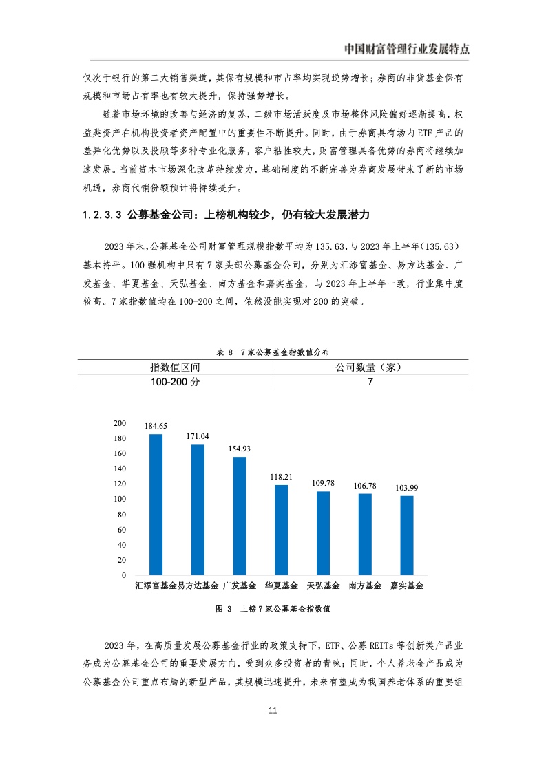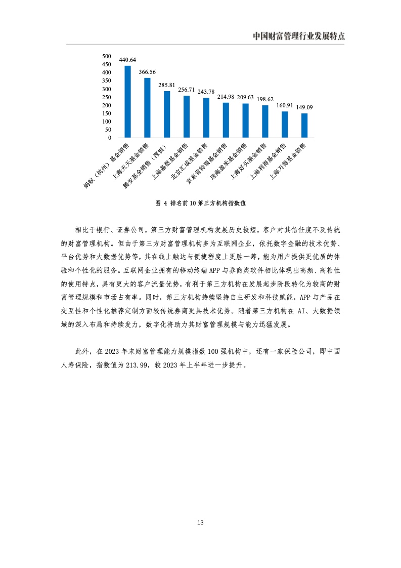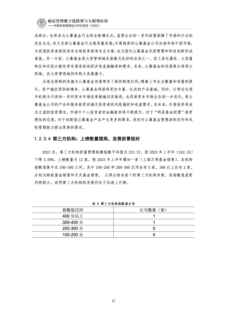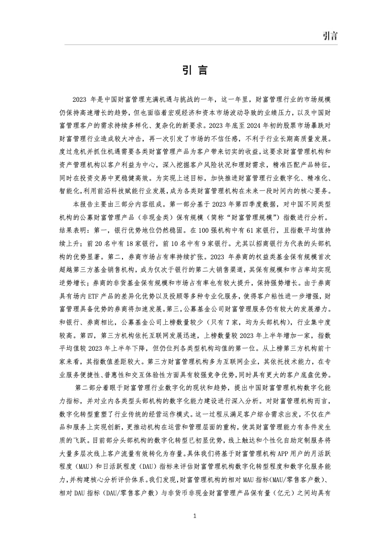 本报告主要由三部分内容组成。第一部分基于 2023 年第四季度数据,对中国不同类型 机构的公募财富管理产品(非现金类)保有规模(简称“财富管理规模”)指数进行分析。结果表明:第一,银行优势地位仍然稳固。在 100 强机构中有 61 家银行,且指数平均值持 续上升;前 20 名中有 18 家银行,前 10 名中有 9 家银行。尤其以招商银行为代表的头部机 构的优势显著。第二,券商市场占有率持续扩张。2023 年券商的权益类基金保有规模首次 超越第三方基金销售机构,成为仅次于银行的第二大销售渠道,其保有规模和市占率均实现 逆势增长;券商的非货基金保有规模和市场占有率也有较大提升,保持强势增长。由于券商 具有场内 ETF 产品的差异化优势以及投顾等多种专业化服务,使得客户粘性进一步增强,财 富管理具备优势的券商将加速发展。第三,公募基金公司财富管理服务仍有较大的发展潜力。和银行、券商相比,公募基金公司上榜数量较少(只有 7 家,均为头部机构),行业集中度 较高。第四,第三方机构依托互联网发展迅速,上榜数量较 2023 年上半年增加一家,指数 平均值较 2023 年上半年下降,但仍位列各类型机构均值的第一位。从上榜第三方机构前十 家来看,其指数值差距较大。第三方财富管理机构多为互联网企业,其依托技术能力,在专 业服务便捷性、普惠性和交互体验性方面具有较强竞争优势,同时具有更大的客户底盘优势。