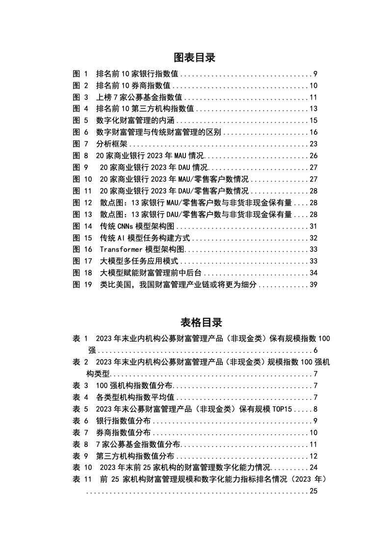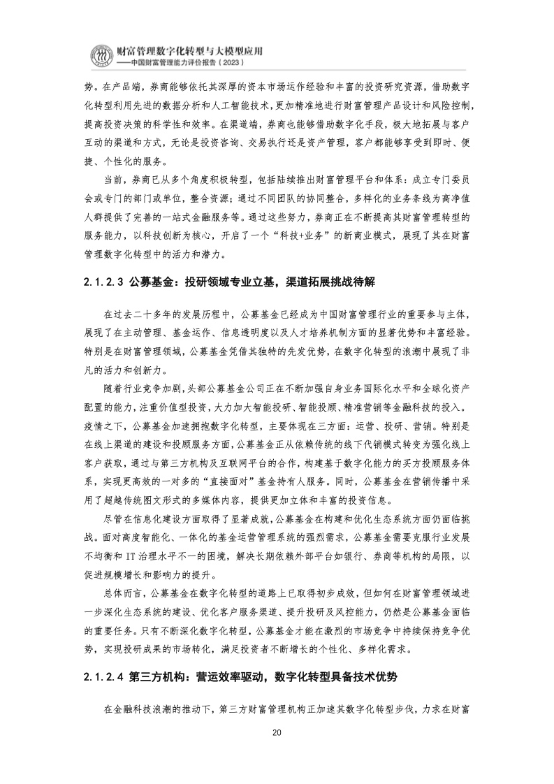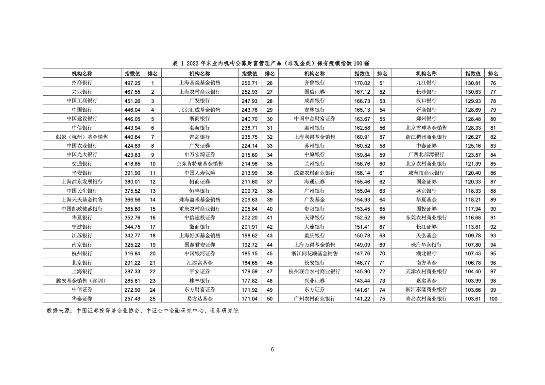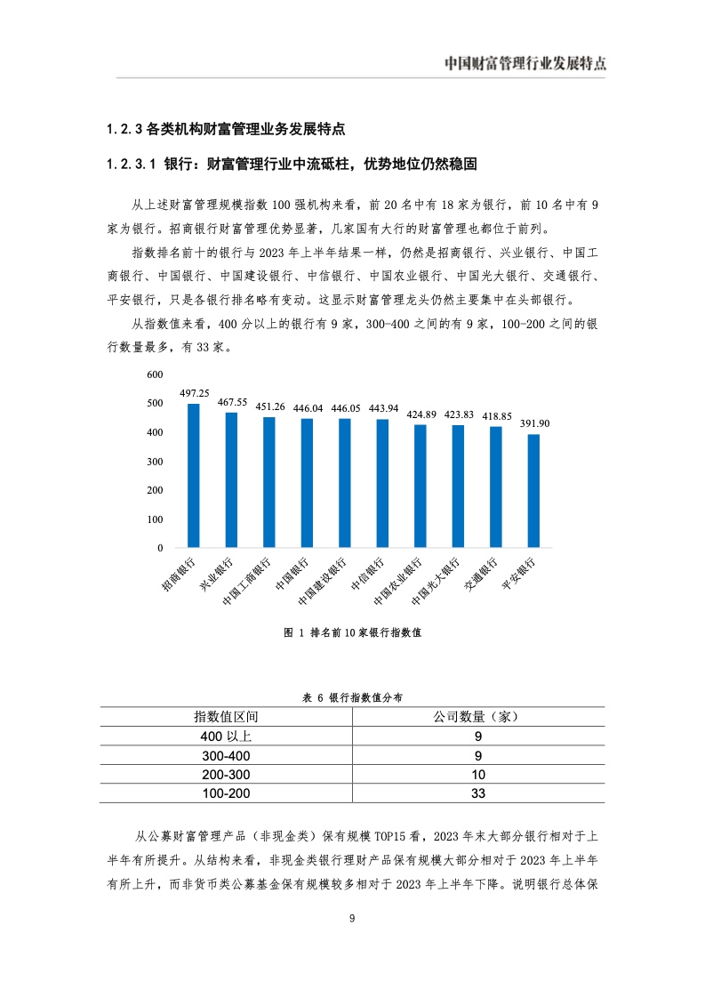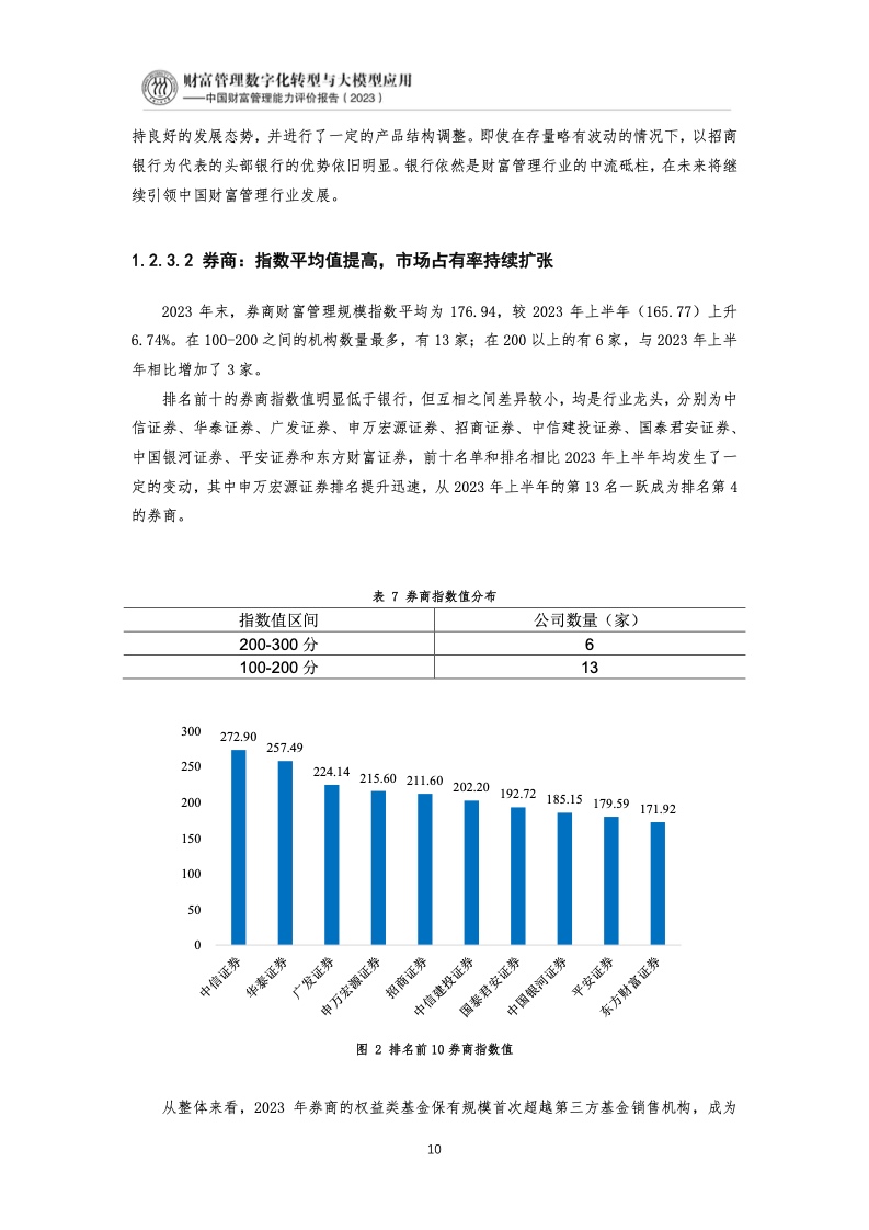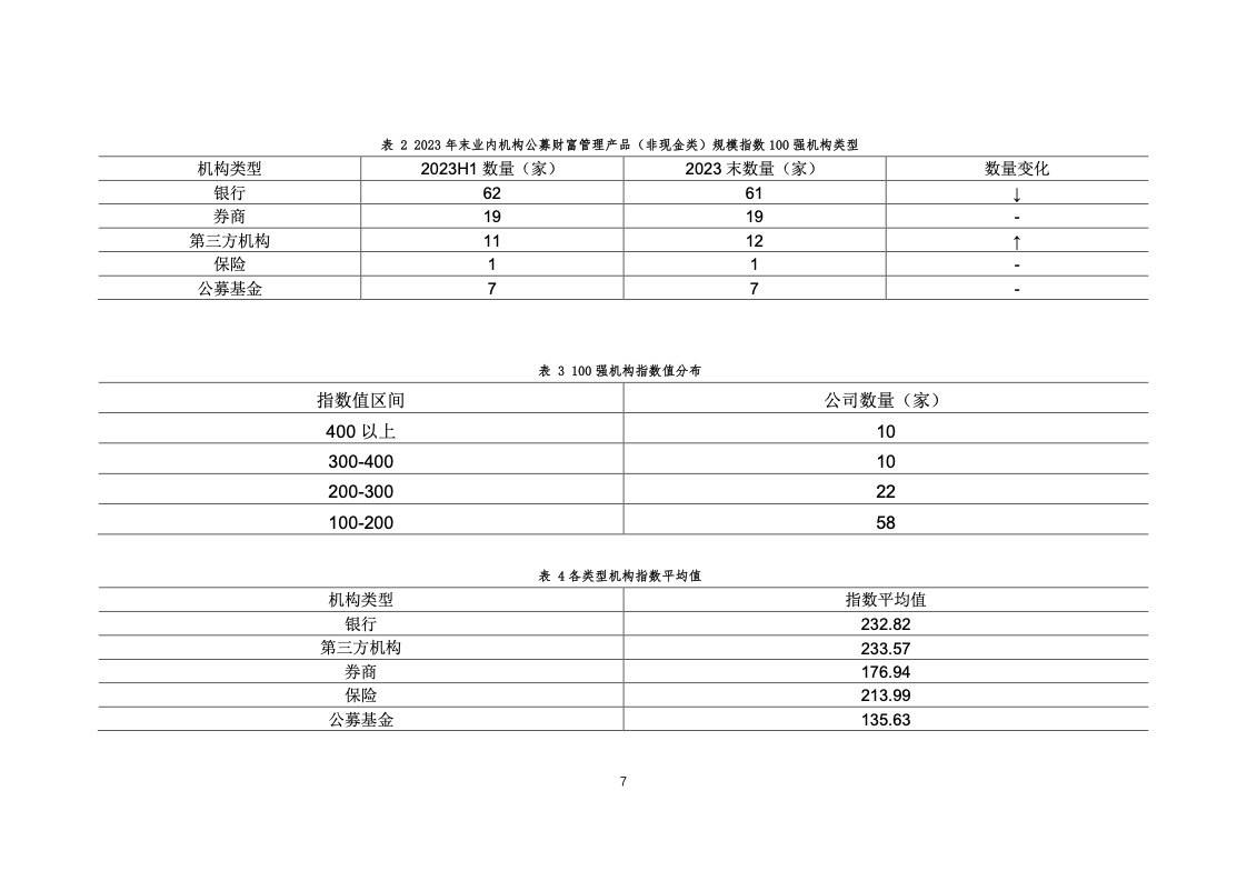 本报告主要由三部分内容组成。第一部分基于 2023 年第四季度数据,对中国不同类型 机构的公募财富管理产品(非现金类)保有规模(简称“财富管理规模”)指数进行分析。结果表明:第一,银行优势地位仍然稳固。在 100 强机构中有 61 家银行,且指数平均值持 续上升;前 20 名中有 18 家银行,前 10 名中有 9 家银行。尤其以招商银行为代表的头部机 构的优势显著。第二,券商市场占有率持续扩张。2023 年券商的权益类基金保有规模首次 超越第三方基金销售机构,成为仅次于银行的第二大销售渠道,其保有规模和市占率均实现 逆势增长;券商的非货基金保有规模和市场占有率也有较大提升,保持强势增长。由于券商 具有场内 ETF 产品的差异化优势以及投顾等多种专业化服务,使得客户粘性进一步增强,财 富管理具备优势的券商将加速发展。第三,公募基金公司财富管理服务仍有较大的发展潜力。和银行、券商相比,公募基金公司上榜数量较少(只有 7 家,均为头部机构),行业集中度 较高。第四,第三方机构依托互联网发展迅速,上榜数量较 2023 年上半年增加一家,指数 平均值较 2023 年上半年下降,但仍位列各类型机构均值的第一位。从上榜第三方机构前十 家来看,其指数值差距较大。第三方财富管理机构多为互联网企业,其依托技术能力,在专 业服务便捷性、普惠性和交互体验性方面具有较强竞争优势,同时具有更大的客户底盘优势。