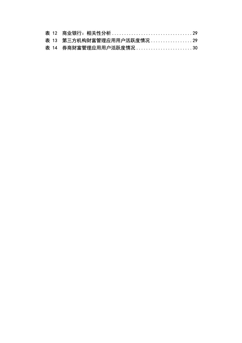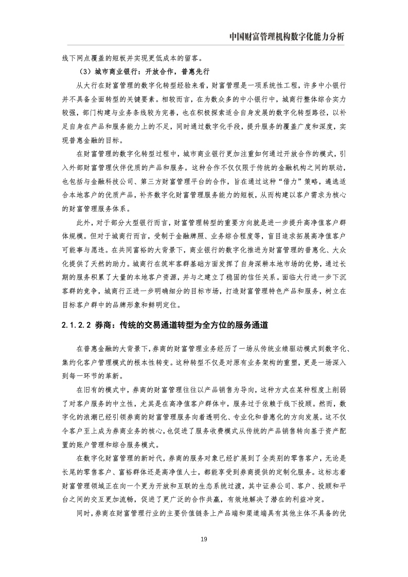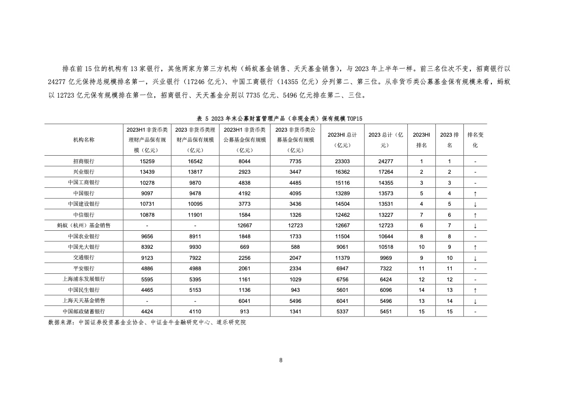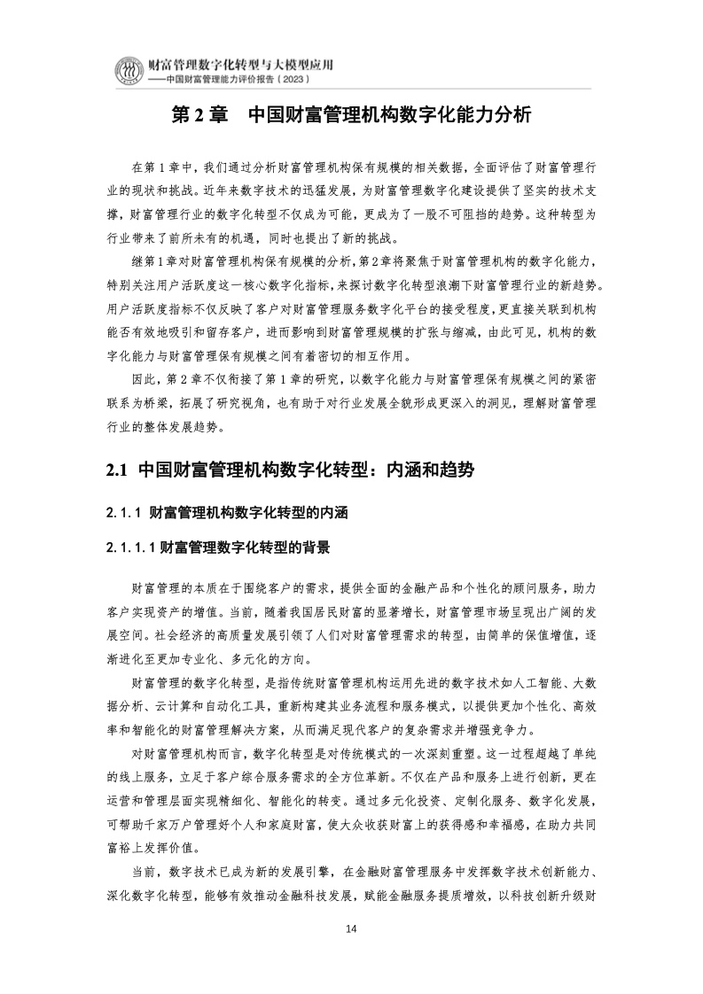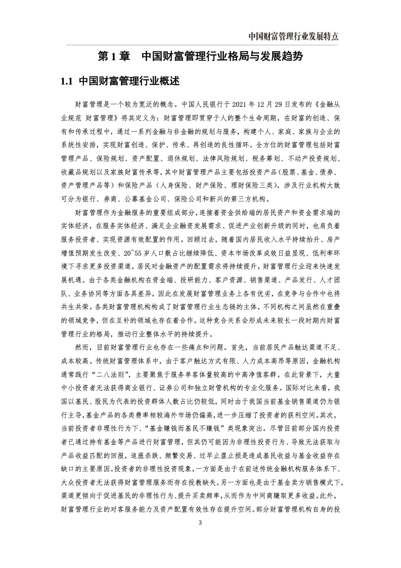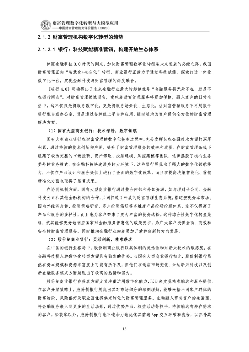 本报告主要由三部分内容组成。第一部分基于 2023 年第四季度数据,对中国不同类型 机构的公募财富管理产品(非现金类)保有规模(简称“财富管理规模”)指数进行分析。结果表明:第一,银行优势地位仍然稳固。在 100 强机构中有 61 家银行,且指数平均值持 续上升;前 20 名中有 18 家银行,前 10 名中有 9 家银行。尤其以招商银行为代表的头部机 构的优势显著。第二,券商市场占有率持续扩张。2023 年券商的权益类基金保有规模首次 超越第三方基金销售机构,成为仅次于银行的第二大销售渠道,其保有规模和市占率均实现 逆势增长;券商的非货基金保有规模和市场占有率也有较大提升,保持强势增长。由于券商 具有场内 ETF 产品的差异化优势以及投顾等多种专业化服务,使得客户粘性进一步增强,财 富管理具备优势的券商将加速发展。第三,公募基金公司财富管理服务仍有较大的发展潜力。和银行、券商相比,公募基金公司上榜数量较少(只有 7 家,均为头部机构),行业集中度 较高。第四,第三方机构依托互联网发展迅速,上榜数量较 2023 年上半年增加一家,指数 平均值较 2023 年上半年下降,但仍位列各类型机构均值的第一位。从上榜第三方机构前十 家来看,其指数值差距较大。第三方财富管理机构多为互联网企业,其依托技术能力,在专 业服务便捷性、普惠性和交互体验性方面具有较强竞争优势,同时具有更大的客户底盘优势。