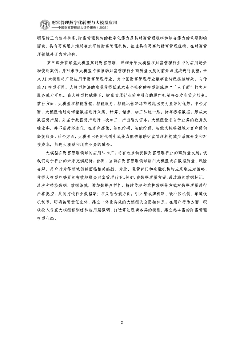 2023 年是中国财富管理充满机遇与挑战的一年,这一年里,财富管理行业的市场规模 仍保持高速增长的趋势,但也面临着宏观经济和资本市场波动导致的业绩压力,以及中国财 富管理客户的需求持续多样化、复杂化的新要求。2023 年底至 2024 年初的股票市场暴跌对 财富管理行业造成较大冲击,再一次引发了市场的不信任感,不利于行业长期高质量发展。度过危机并抓住机遇需要各类财富管理产品为客户带来切实的收益,这要求财富管理机构和 资产管理机构以客户利益为中心,深入挖掘客户风险状况和理财需求,精准匹配产品特征, 同时在投资交易中更稳健高效。为实现上述目标,加快推进财富管理行业数字化、精准化、 智能化,利用前沿科技赋能行业发展,成为各类财富管理机构在未来一段时间内的核心要务。