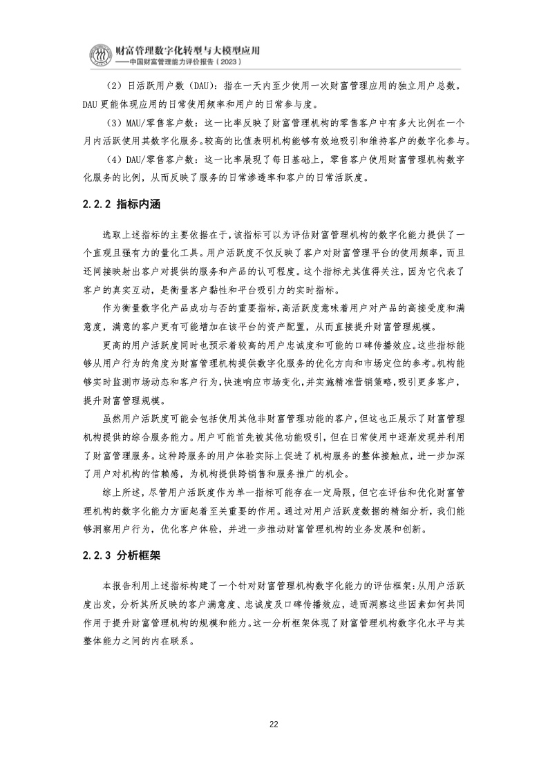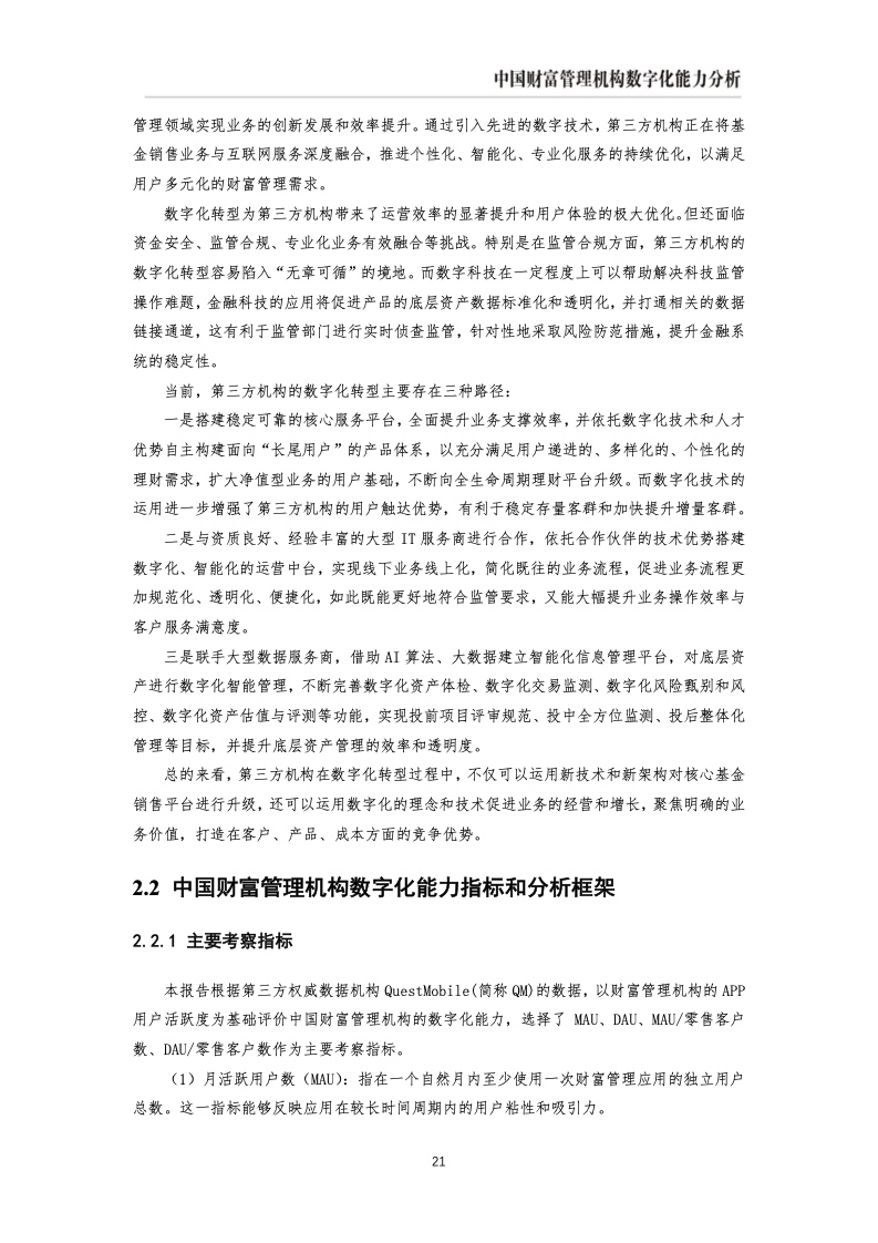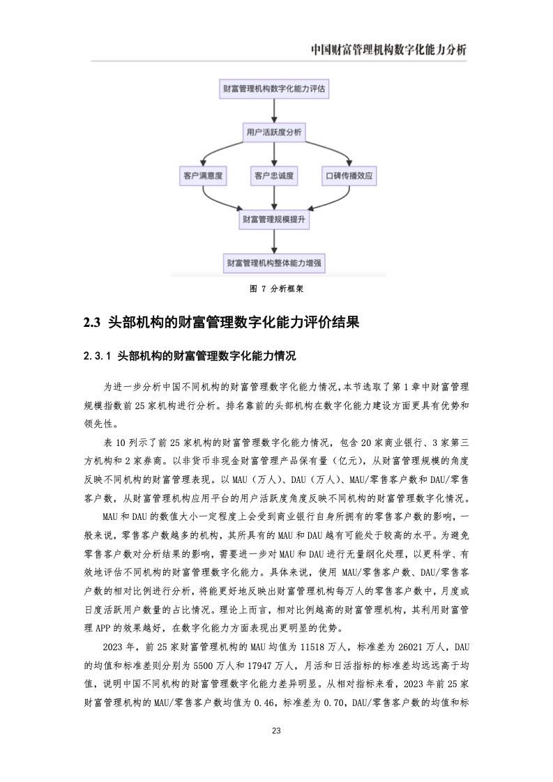 第二部分着眼于财富管理行业数字化的现状和趋势,提出中国财富管理机构数字化能 力指标,并对业内各类型头部机构的数字化能力建设进行深入分析。对财富管理机构而言, 数字化转型重塑了行业传统的经营运作模式。这一过程从满足客户综合需求出发,不仅在产 品和服务上实现创新,更推动机构在运营和管理层面的重构,使其财富管理能力有条件发生 质的飞跃。目前部分头部机构的数字化转型已初显优势,线上触达和个性化自助定制服务将 大量多层次线上客户流量有效转化为存量。具体我们将基于财富管理机构 APP 用户的月活跃 程度(MAU)和日活跃程度(DAU)指标来评估财富管理机构数字化转型程度和数字化服务能 力,并构建核心分析评价体系。我们发现,财富管理机构的相对 MAU 指标(MAU/零售客户数)、 相对 DAU 指标(DAU/零售客户数)与非货币非现金财富管理产品保有量(亿元)之间均具有明显的正向相关关系,财富管理机构的数字化能力是其财富管理规模和综合能力的重要影响 因素。具有更高用户活跃度水平的财富管理机构,往往具有更高的财富管理规模,在财富管 理领域处于靠前地位。