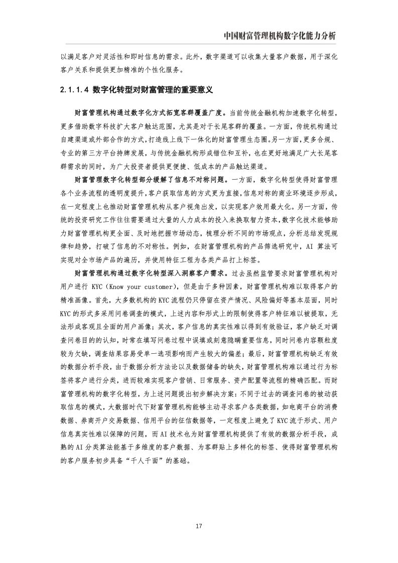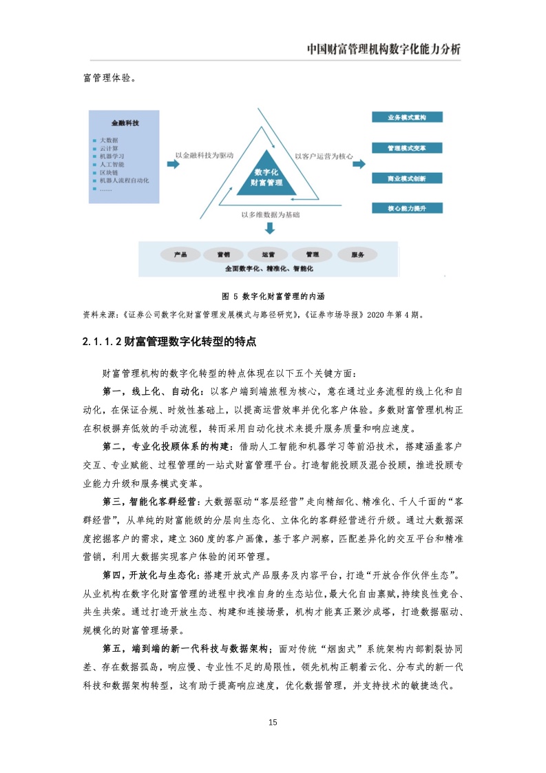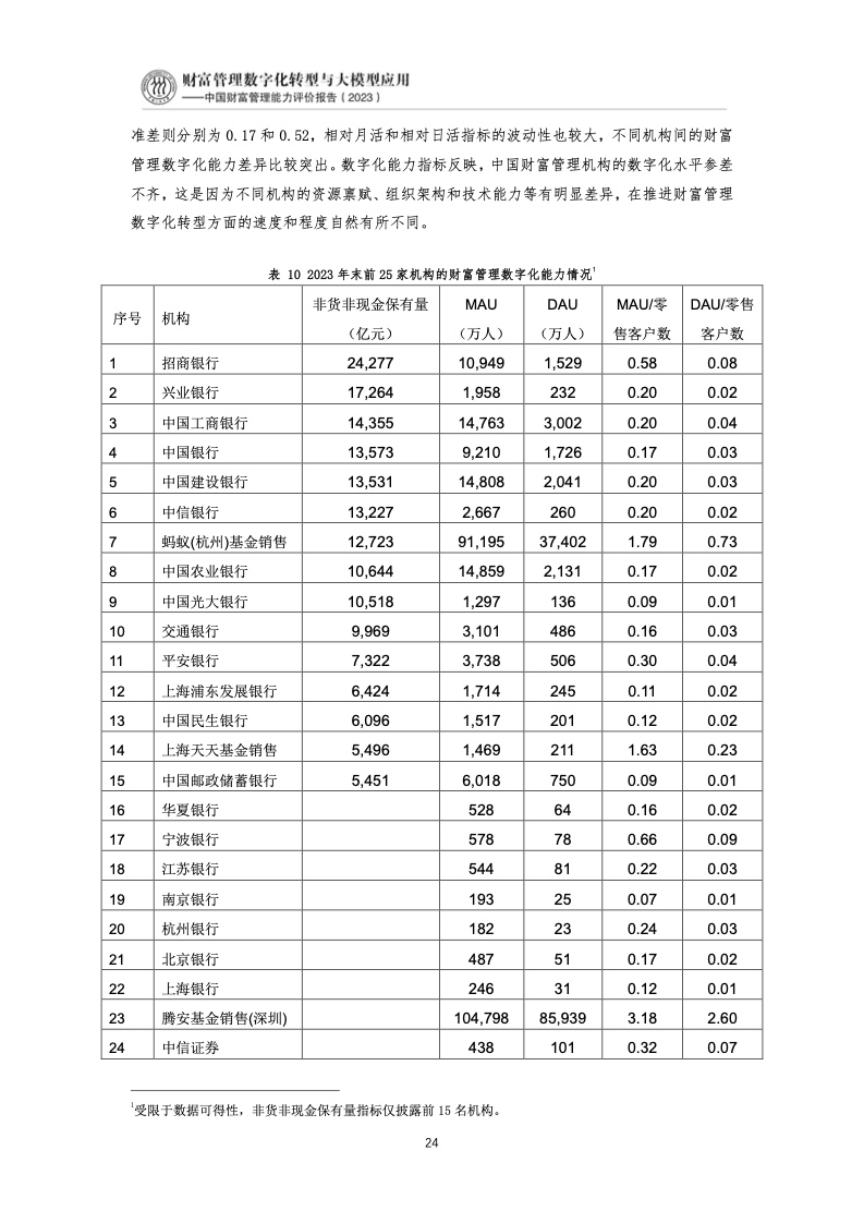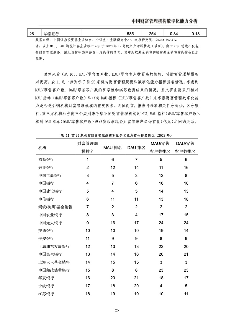 第二部分着眼于财富管理行业数字化的现状和趋势,提出中国财富管理机构数字化能 力指标,并对业内各类型头部机构的数字化能力建设进行深入分析。对财富管理机构而言, 数字化转型重塑了行业传统的经营运作模式。这一过程从满足客户综合需求出发,不仅在产 品和服务上实现创新,更推动机构在运营和管理层面的重构,使其财富管理能力有条件发生 质的飞跃。目前部分头部机构的数字化转型已初显优势,线上触达和个性化自助定制服务将 大量多层次线上客户流量有效转化为存量。具体我们将基于财富管理机构 APP 用户的月活跃 程度(MAU)和日活跃程度(DAU)指标来评估财富管理机构数字化转型程度和数字化服务能 力,并构建核心分析评价体系。我们发现,财富管理机构的相对 MAU 指标(MAU/零售客户数)、 相对 DAU 指标(DAU/零售客户数)与非货币非现金财富管理产品保有量(亿元)之间均具有明显的正向相关关系,财富管理机构的数字化能力是其财富管理规模和综合能力的重要影响 因素。具有更高用户活跃度水平的财富管理机构,往往具有更高的财富管理规模,在财富管 理领域处于靠前地位。