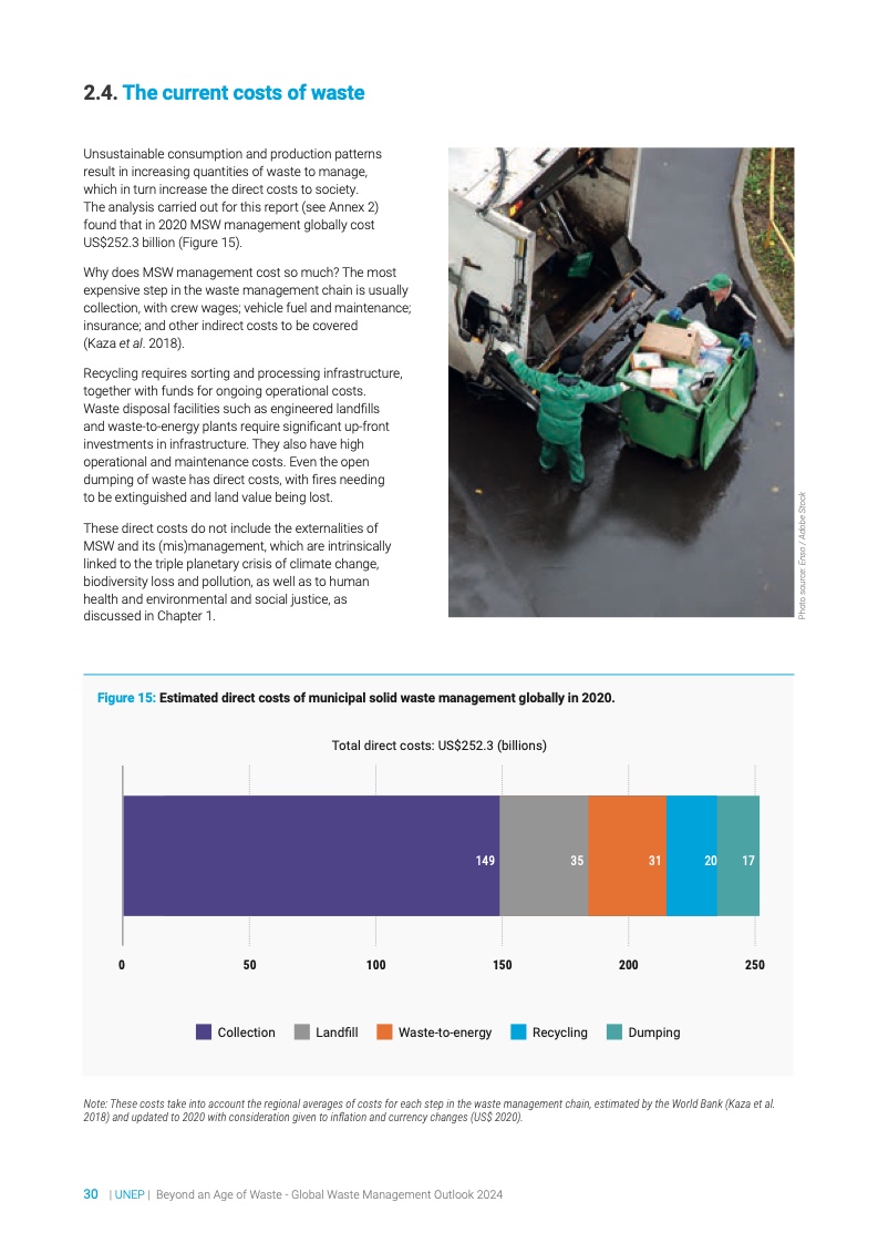 采用循环经济模式管理城市固体废物也能够大力节约成本。如果保持目前的废物管理方法,到2050年,每年将花费超过4170亿美元,与2020年相比增加了1650亿美元。如果采用循环经济模式,以减少废物并增加回收,预估成本将低于每年2550亿美元。