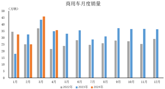 2024年4月,商用车产销分别完成35.8万辆和35.7万辆,环比分别下降18.3%和22%,同比分别增长0.8%和2.8%。