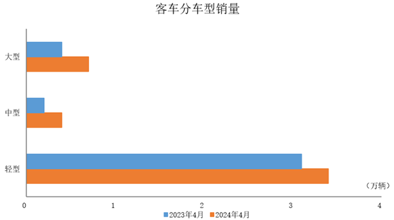 2024年1-4月,客车产销分别完成15.9万辆和15.8万辆,同比分别增长11.4%和14.7%。与上年同期相比,三大类客车品种产销均呈不同程度增长,其中中型客车增速最为显著。