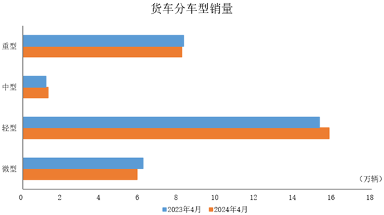 2024年4月,货车产销分别完成31.2万辆和31.3万辆,环比分别下降19.5%和22.8%,产量同比下降0.6%、销量同比增长1%。与上月相比,四大类货车品种产销均呈不同程度下降;与上年同期相比,轻型货车产销小幅增长,重型货车产销呈不同程度下降,中型货车产量下降、销量增长,微型货车产量增长、销量下降。