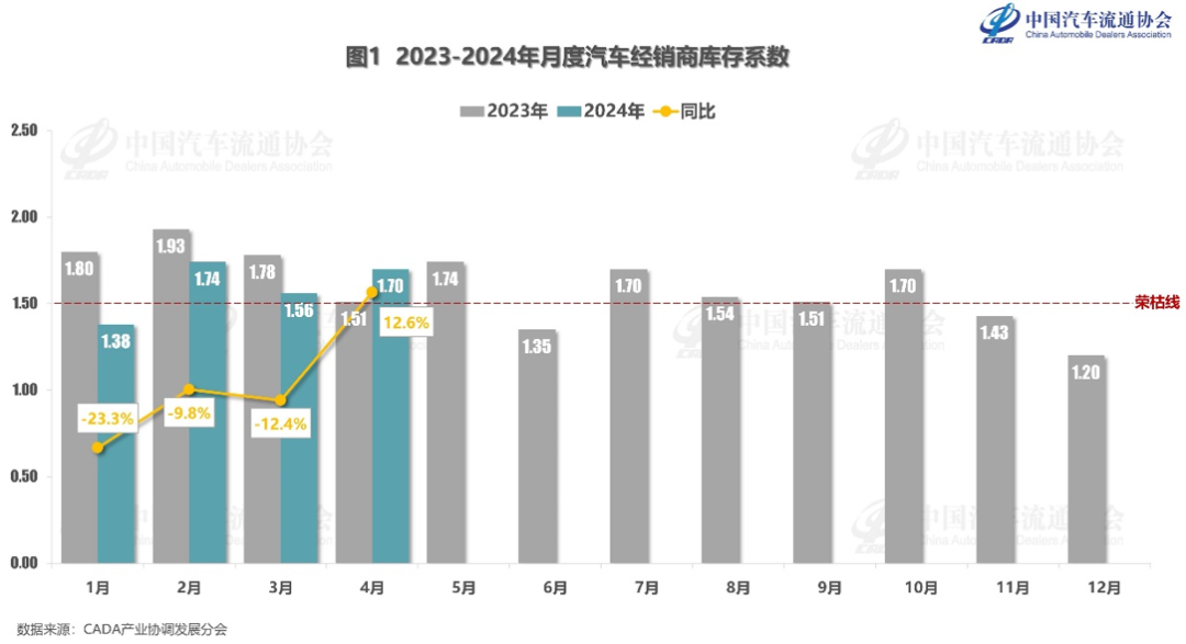 2024年5月10日,中国汽车流通协会发布2024年4月份“汽车经销商库存”调查结果:4月份汽车经销商综合库存系数为1.70,环比上升9.0%,同比上升12.6%,库存水平位于警戒线以上,经销商库存压力上升。