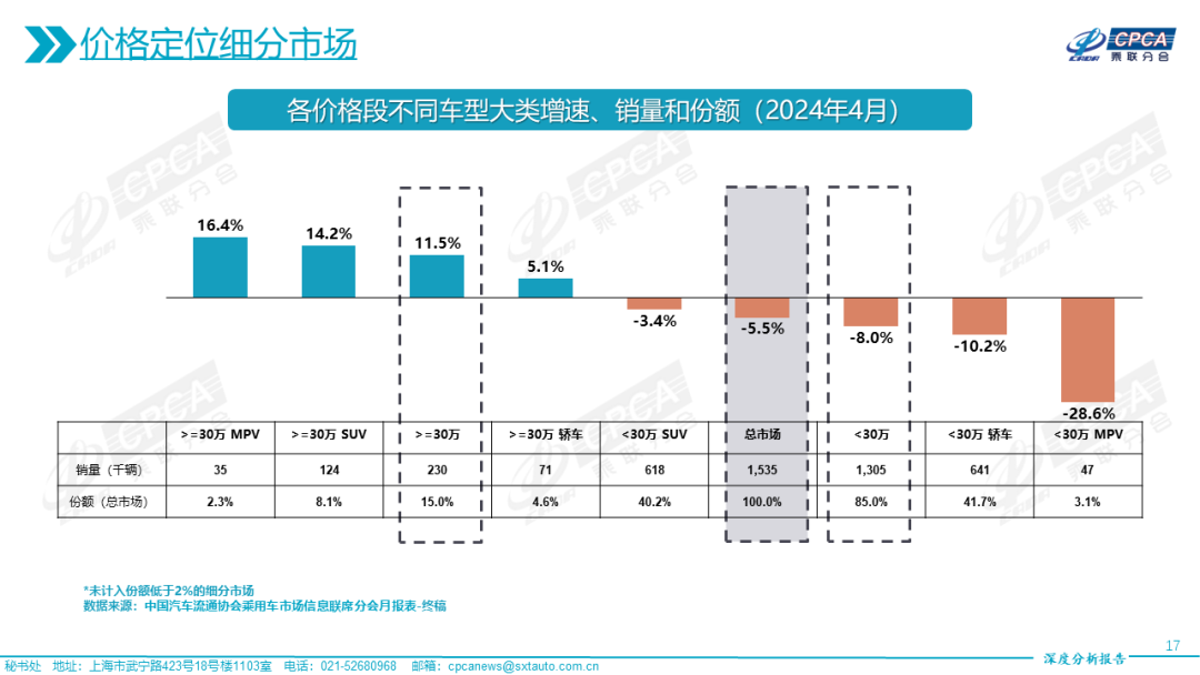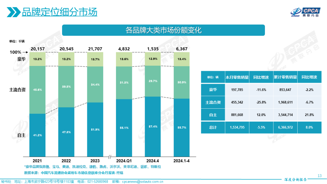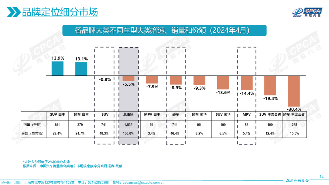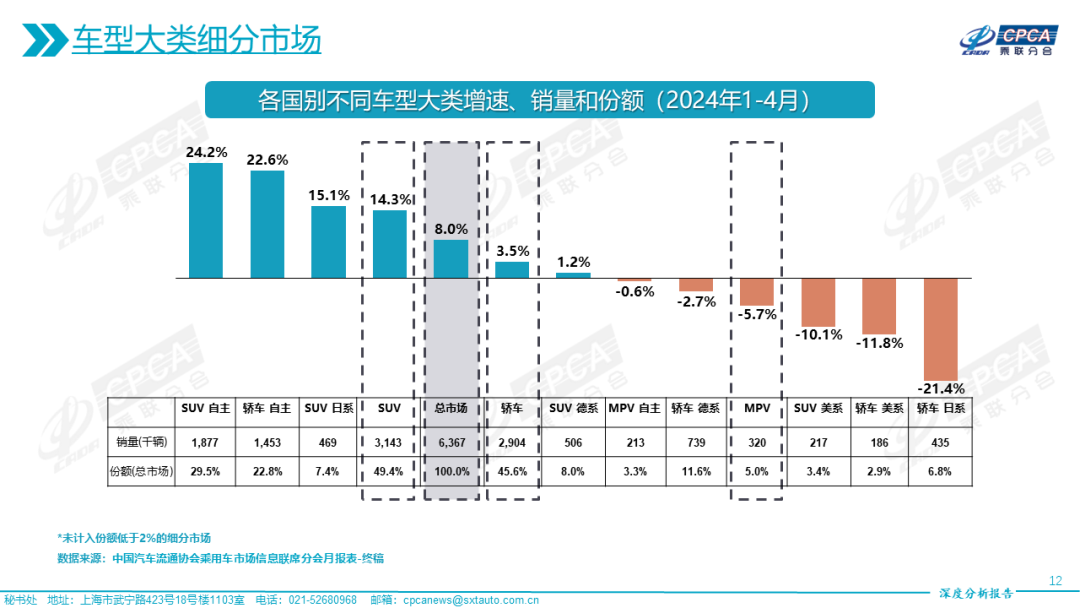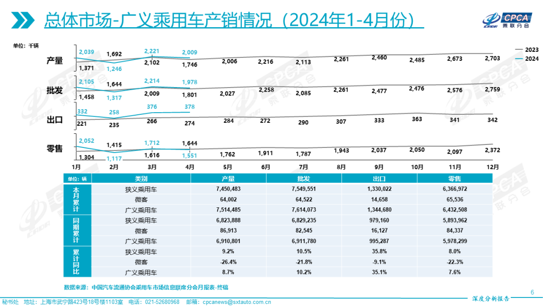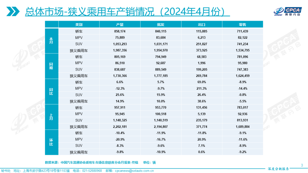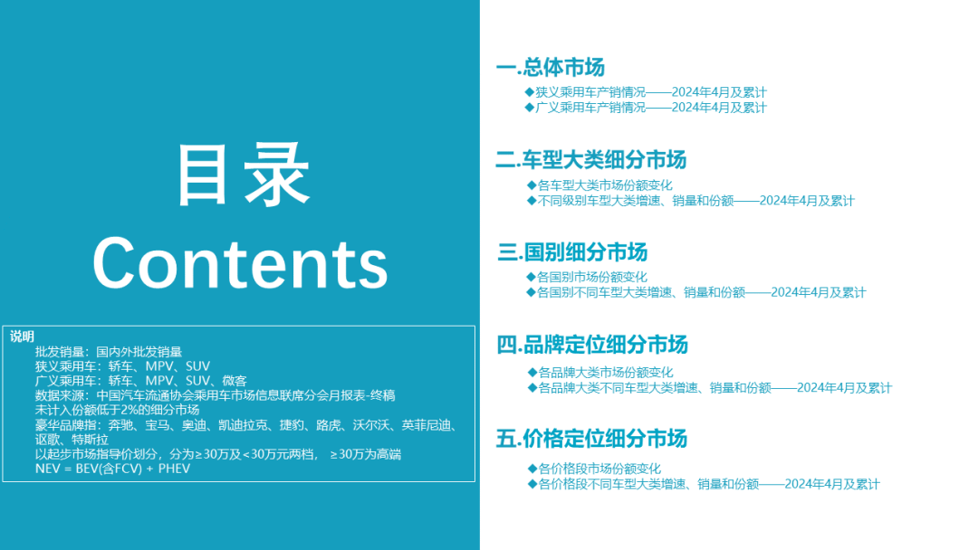 中国汽车流通协会:2024年4月份全国乘用车市场深度分析报告 一、总体市场 二、车型大类细分市场 三、国别细分市场 四、品牌定位细分市场 五、价格定位细分市场 说明 批发销量:国内外批发销量 狭义乘用车:轿车、MPV、SUV 广义乘用车:轿车、MPV、SUV、微客 数据来源:中国汽车流通协会乘用车市场信息联席分会月报表-终稿 未计入份额低于2%的细分市场 豪华品牌指:奔驰、宝马、奥迪、凯迪拉克、捷豹、路虎、沃尔沃、英菲尼迪、讴歌、特斯拉 以起步市场指导价划分:分为≥30万及<30万元两档, ≥30万为高端 NEV=BEV含(FCV)+PHEV 更多阅读:中国汽车流通协会:2020年3月份国内狭义乘用车市场销量达104.5万辆 同比下降40.4%中国汽车流通协会:2020年3月份全国乘用车市场分析中国汽车流通协会:2020年2月份全国乘用车市场深度分析中国汽车流通协会:2020年2月份全国乘用车市场分析中国汽车流通协会:2020年1月份全国乘用车市场深度分析中国汽车流通协会: 2020年3月份全国乘用车市场深度分析报告中国汽车流通协会:2020年9月份全国乘用车市场深度分析报告中国汽车流通协会: 2023年10月份全国乘用车市场分析中国汽车流通协会:2021年2月份全国乘用车市场分析中国汽车流通协会:2019年11月份全国乘用车市场分析中国汽车流通协会:2023年4月份全国乘用车市场深度分析报告中国汽车流通协会:2022年11月份全国乘用车市场分析中国汽车流通协会:2022年11月份全国乘用车市场深度分析报告中国汽车流通协会: 2020年5月份全国乘用车市场分析中国汽车流通协会:2020年6月份全国乘用车市场深度分析报告