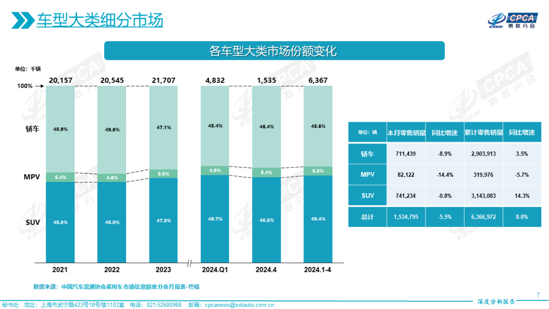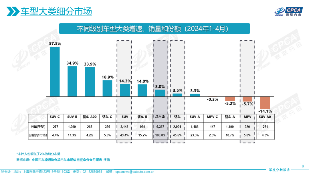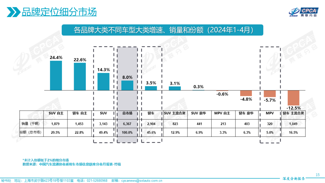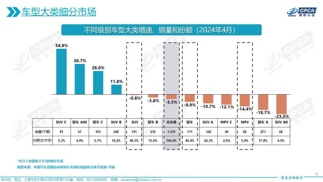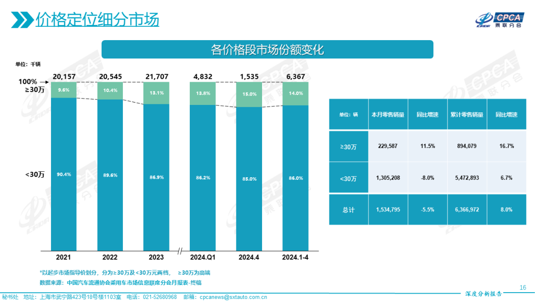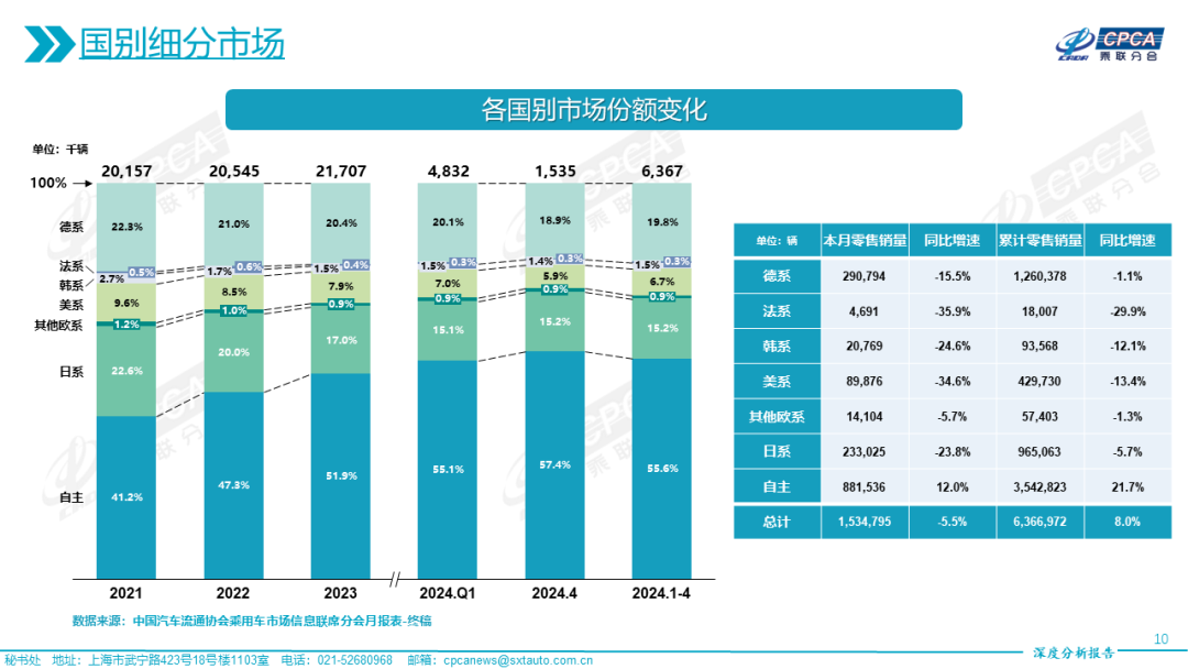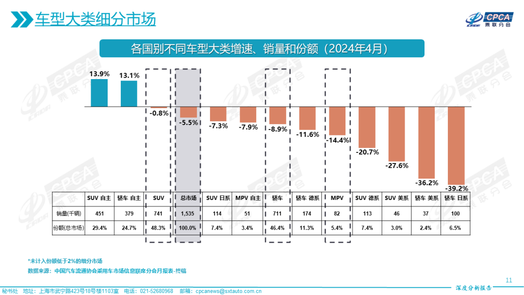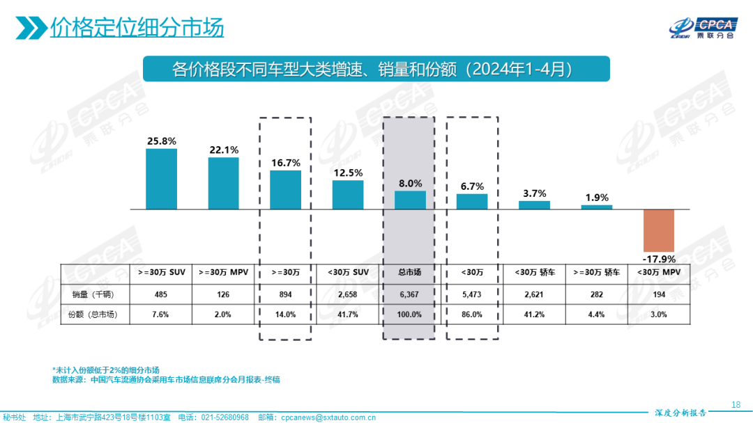 中国汽车流通协会:2024年4月份全国乘用车市场深度分析报告 一、总体市场 二、车型大类细分市场 三、国别细分市场 四、品牌定位细分市场 五、价格定位细分市场 说明 批发销量:国内外批发销量 狭义乘用车:轿车、MPV、SUV 广义乘用车:轿车、MPV、SUV、微客 数据来源:中国汽车流通协会乘用车市场信息联席分会月报表-终稿 未计入份额低于2%的细分市场 豪华品牌指:奔驰、宝马、奥迪、凯迪拉克、捷豹、路虎、沃尔沃、英菲尼迪、讴歌、特斯拉 以起步市场指导价划分:分为≥30万及<30万元两档, ≥30万为高端 NEV=BEV含(FCV)+PHEV 更多阅读:中国汽车流通协会:2020年3月份国内狭义乘用车市场销量达104.5万辆 同比下降40.4%中国汽车流通协会:2020年3月份全国乘用车市场分析中国汽车流通协会:2020年2月份全国乘用车市场深度分析中国汽车流通协会:2020年2月份全国乘用车市场分析中国汽车流通协会:2020年1月份全国乘用车市场深度分析中国汽车流通协会: 2020年3月份全国乘用车市场深度分析报告中国汽车流通协会:2020年9月份全国乘用车市场深度分析报告中国汽车流通协会: 2023年10月份全国乘用车市场分析中国汽车流通协会:2021年2月份全国乘用车市场分析中国汽车流通协会:2019年11月份全国乘用车市场分析中国汽车流通协会:2023年4月份全国乘用车市场深度分析报告中国汽车流通协会:2022年11月份全国乘用车市场分析中国汽车流通协会:2022年11月份全国乘用车市场深度分析报告中国汽车流通协会: 2020年5月份全国乘用车市场分析中国汽车流通协会:2020年6月份全国乘用车市场深度分析报告