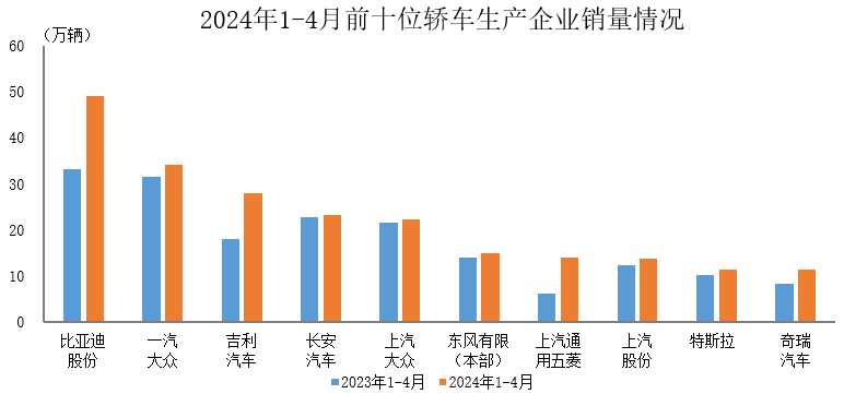 中汽协: 2024年1-4月前十位轿车生产企业销售情况简析 据中国汽车工业协会统计分析,2024年1-4月,销量排名前十位的轿车生产企业共销售222.5万辆,占轿车销售总量的67.8%。 在上述十家企业中,与上年同期相比,十家企业销量均呈不同程度增长,其中上汽通用五菱增速最为显著。 更多阅读:中国汽车工业协会:2023年1-3月前十位轿车生产企业销售情况简析中汽协:2021年11月份主要汽车企业销量数据中汽协:2021年1-7月汽车销量排名前十企业简析中汽协:2021年1-5月汽车商品进出口总额接近900亿美元中汽协:2024年1-5月前十位汽车生产企业(集团)销售情况简析中汽协:2024年1-4月前十位MPV生产企业销售情况简析中汽协:2021年上半年汽车制造业营业收入超过4万亿元中汽协:2022年1-2月汽车类零售额同比呈小幅增长中汽协:2021年上半年销量前十SUV生产企业简析中汽协:2021年上半年前十家汽车生产企业出口量排名中汽协: 2021年上半年销量前十MPV生产企业简析中汽协:2021年上半年前十位轿车品牌销量排名中汽协:2021年4月中国品牌乘用车共销售71.9万辆 同比增长34.8%中汽协:2020年12月前十位SUV品牌销量排名中汽协:2021年上半年前十位轿车品牌销量排名
