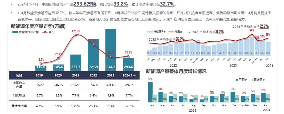 - 新能源汽车产量,1-4月同比增长33.2%,增速高于汽车市场整体7.7%的增幅。