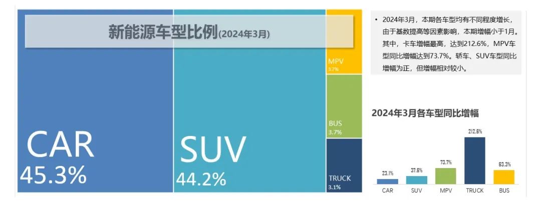 2024年3月,CAR占比45.3%,相比同期下滑4.23个百分点;SUV、MPV份额达到44.2%和3.7%;客车、卡车份额分别为3.7%和3.1%。