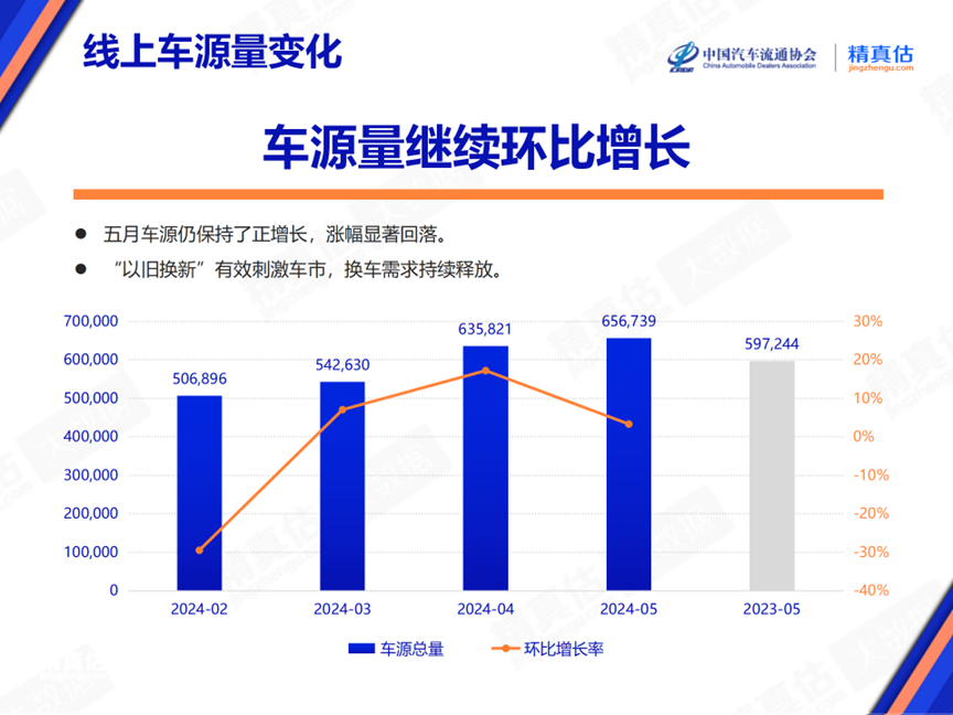 月度车源量艰难的维持了增长态势,这背后是用户的换车需求与“以旧换新”政策的结合。全国各省市发布了具体的置换补贴方案,落地速度较快,这一系列补贴方案改变了市场的终端行情价格,并将持续至下半年。二手车价格下跌对车商构成伤害,但亏损或微利也要继续经营,快速周转已经是二手市场参与者的共识。