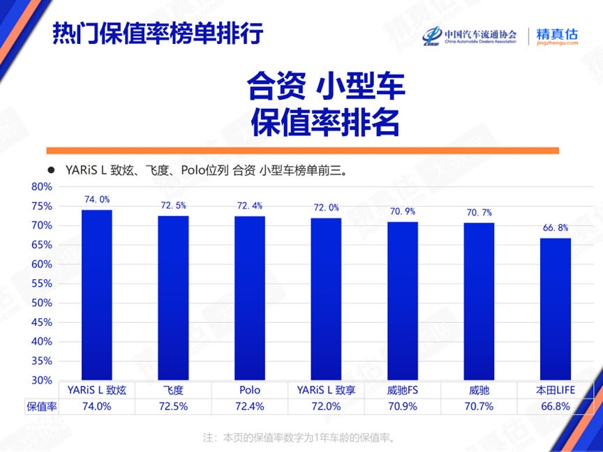 现阶段的小型车市场受新能源车型冲击较大,合资车型中还是以日系为主。YARiS L 致炫、飞度虽然销量下滑,但依然保持保值率榜单的第一第二名。Polo作为小型车市场的鼻祖级车型,和飞度相爱相杀多年,凭借本身过硬的素质以微弱劣势排名第三。