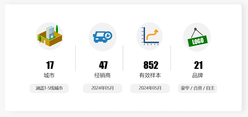 《报告》显示,2024年5月,汽车销售服务口碑指数为99.08分,环比提升0.01分,同比提升2.56分。本月数据覆盖了17个1~5线城市,47家经销商,21个品牌的852个有效样本量。