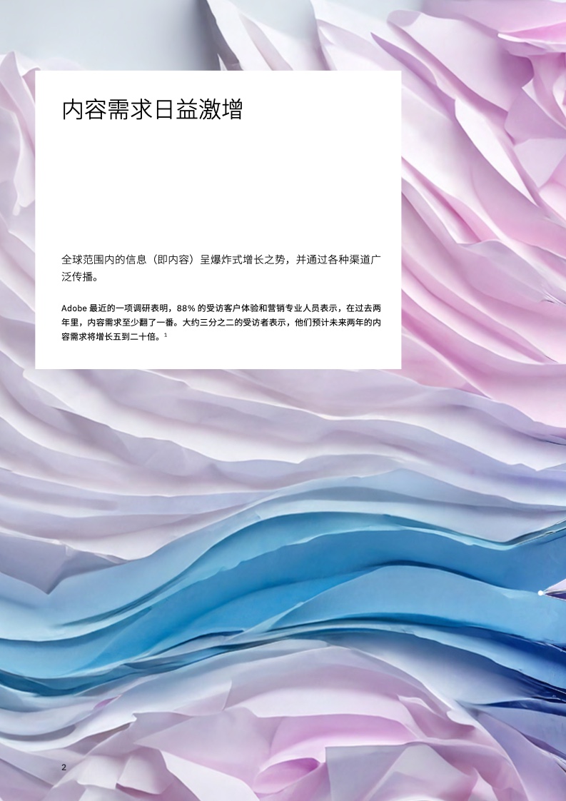 Adobe 最近的一项调研表明,88% 的受访客户体验和营销专业人员表示,在过去两年里,内容需求至少翻了一番。大约三分之二的受访者表示,他们预计未来两年的内容需求将增长五到二十倍。