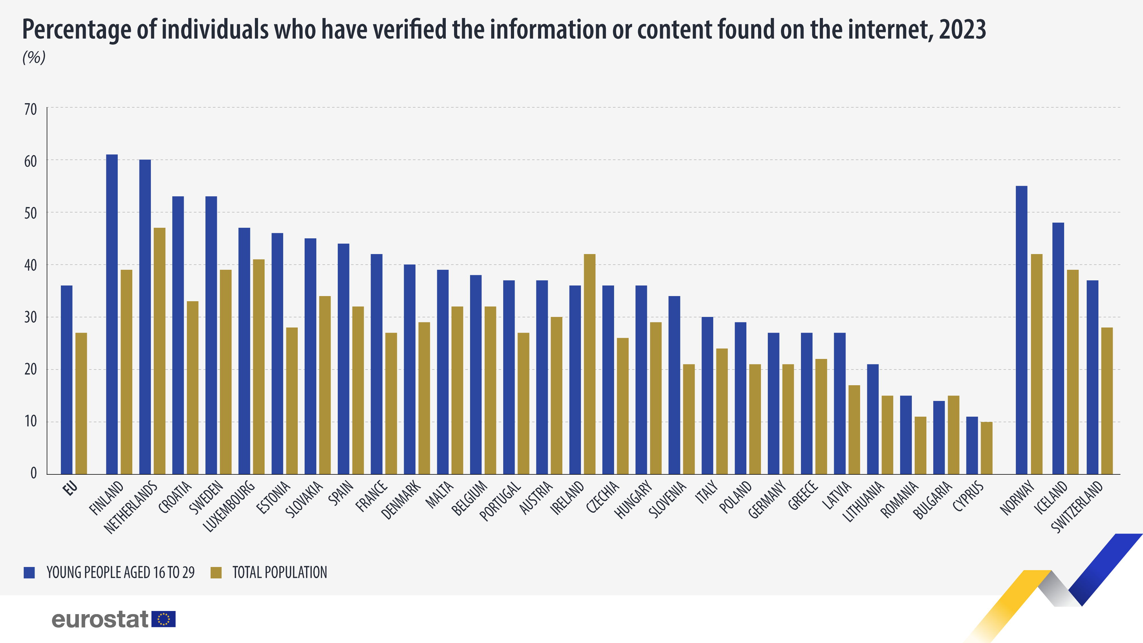 在4个欧盟国家中,核实在线内容的年轻人比例超过50%:芬兰(61%)、荷兰(60%)、克罗地亚和瑞典(均为53%)均超过平均值。