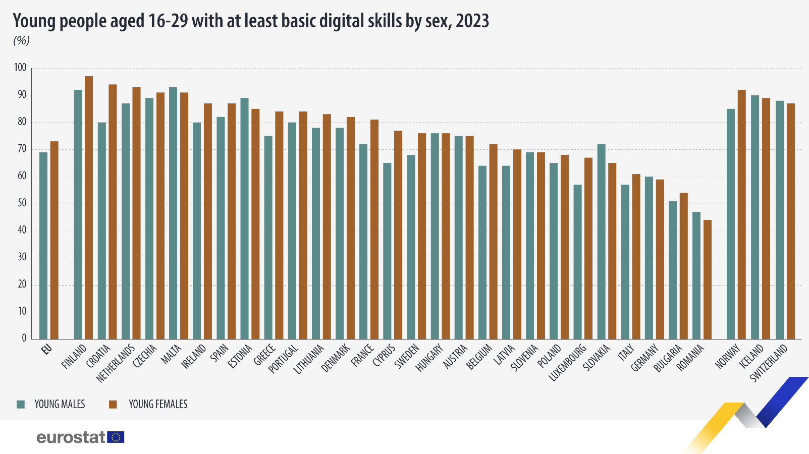 2023年,在欧盟国家,16-29岁的年轻女性(73%)拥有基本数字技能的比例高于年轻男性(69%)。