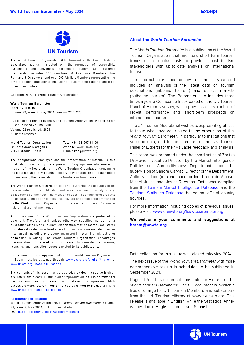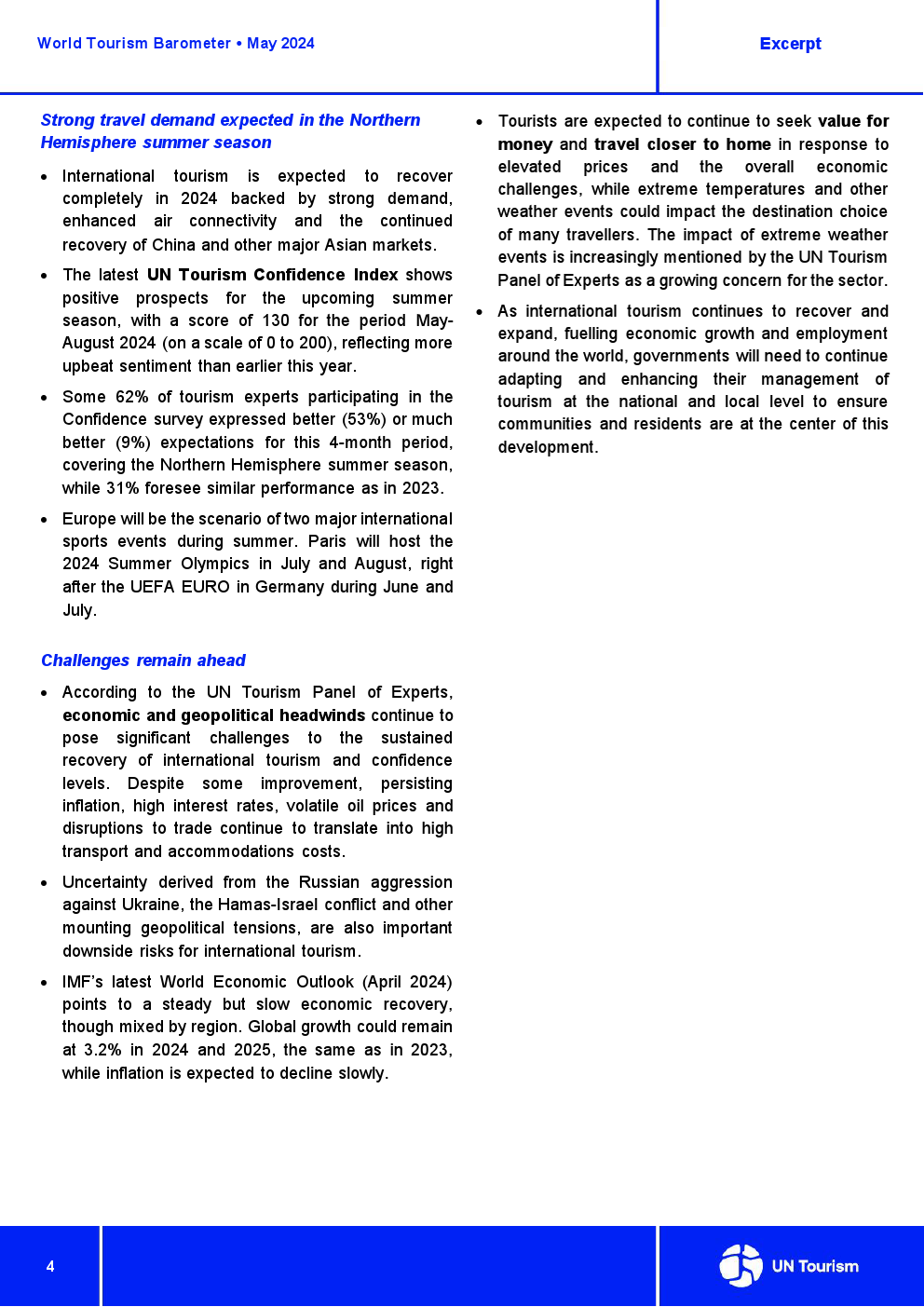 最新的联合国旅游组织信心指数显示了即将到来的夏季旅游的积极前景,2024年5月至8月期间的得分为130(从0到200),反映出比今年早些时候更乐观的情绪。在参与信心调查的旅游专家中有约62%对涵盖北半球夏季的这4个月表示了好(53%)或更好(9%)的预期;31%的人预计其表现将与2023年相似。