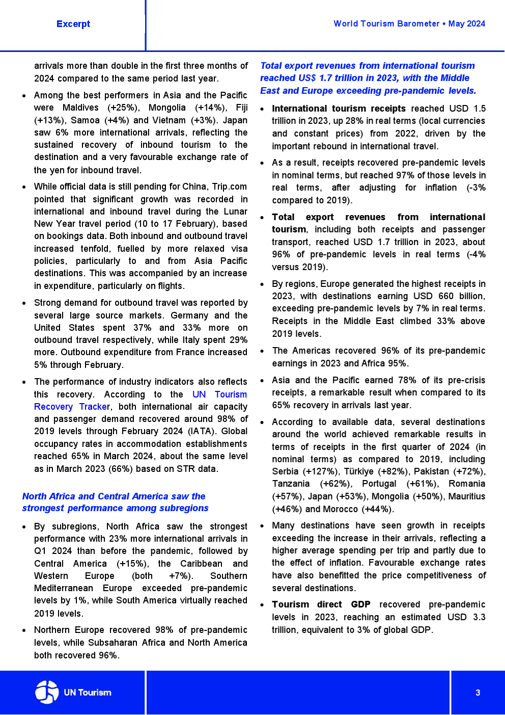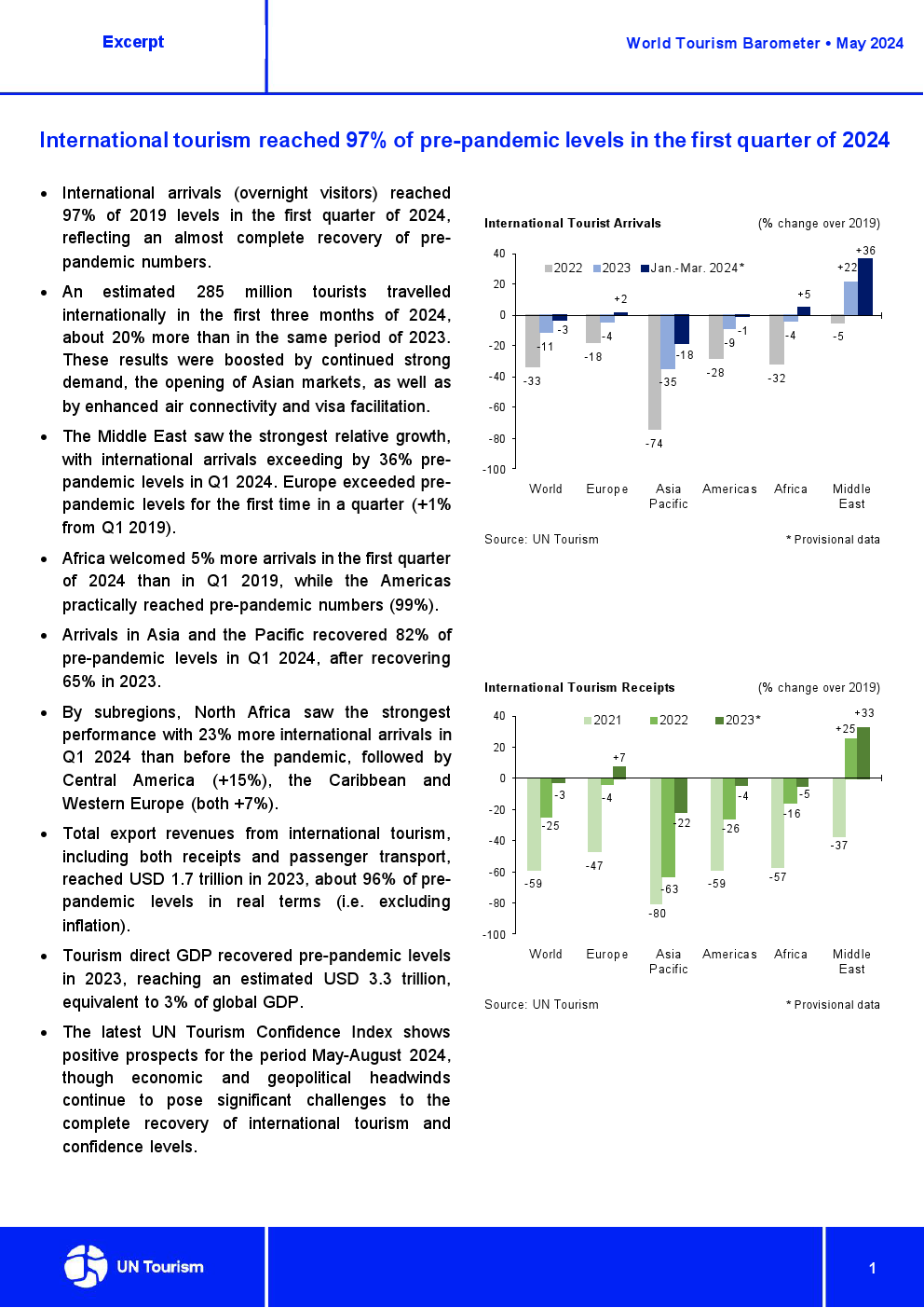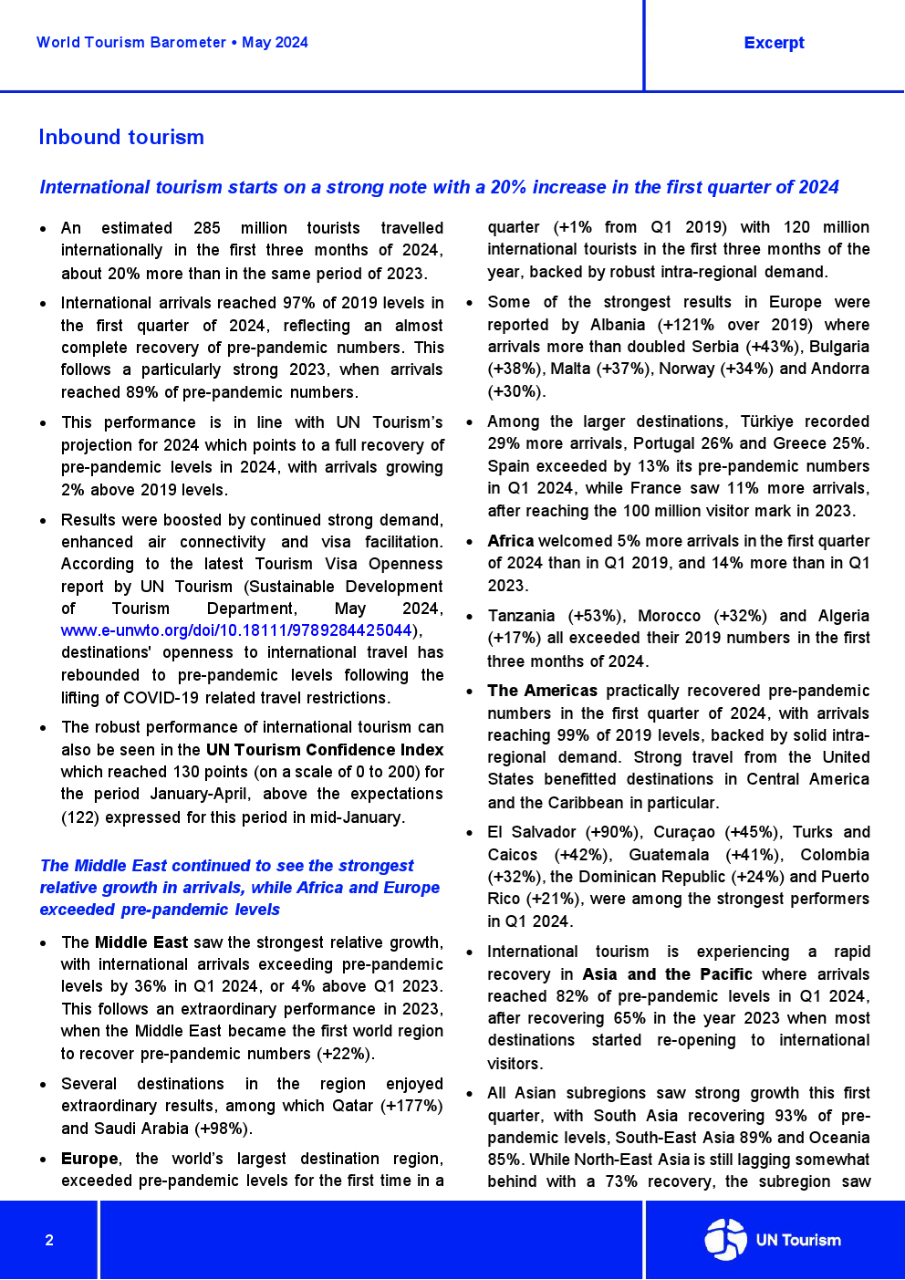中东地区的相对增长最为强劲,2024年第一季度国际入境人数超过疫情前水平36%,比2023年第一季度高出4%。