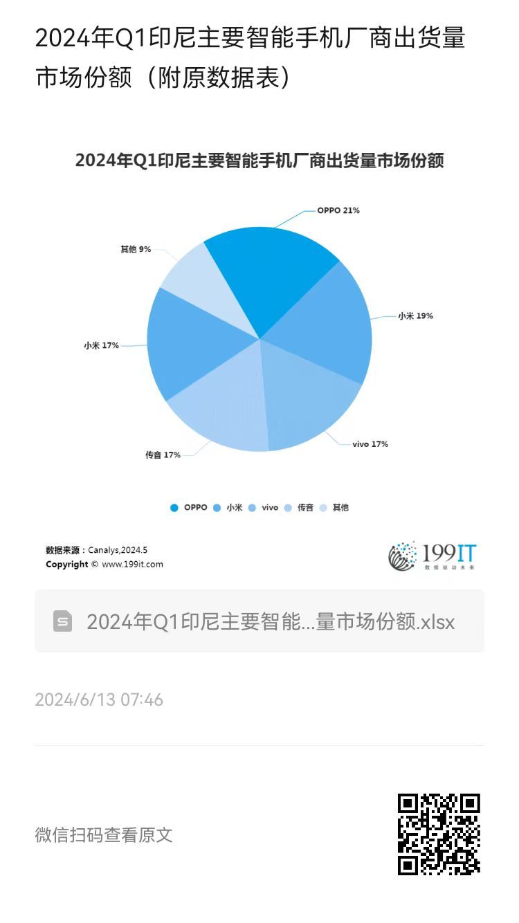 2024年Q1印尼主要智能手机厂商出货量市场份额(附原数据表) ​​​