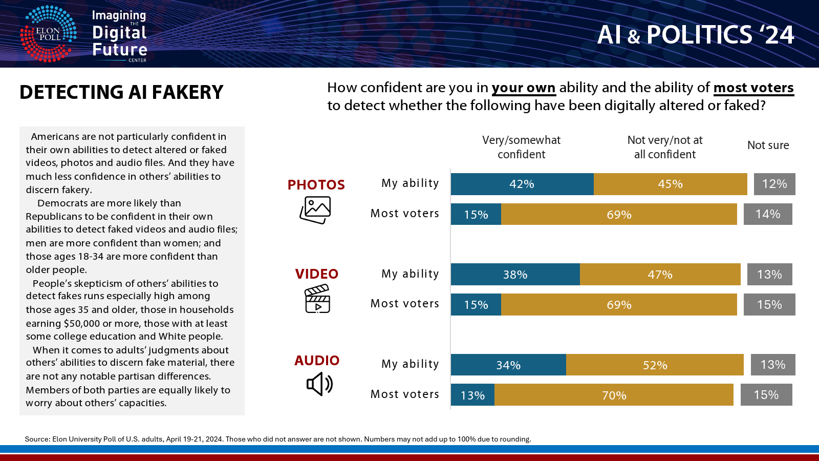 美国人对人工智能系统的使用和影响的担忧发生在充满挑战和混乱的新闻和信息环境中。52%的美国人不相信他们能检测出篡改或伪造的视听材料;47%的人不相信他们能发现被篡改的视频;45%的人不相信自己能识别出假照片。