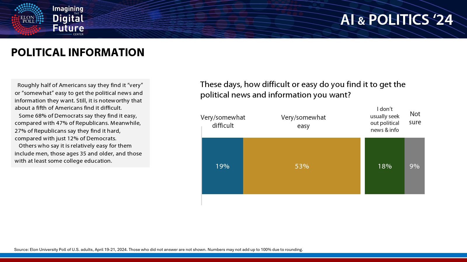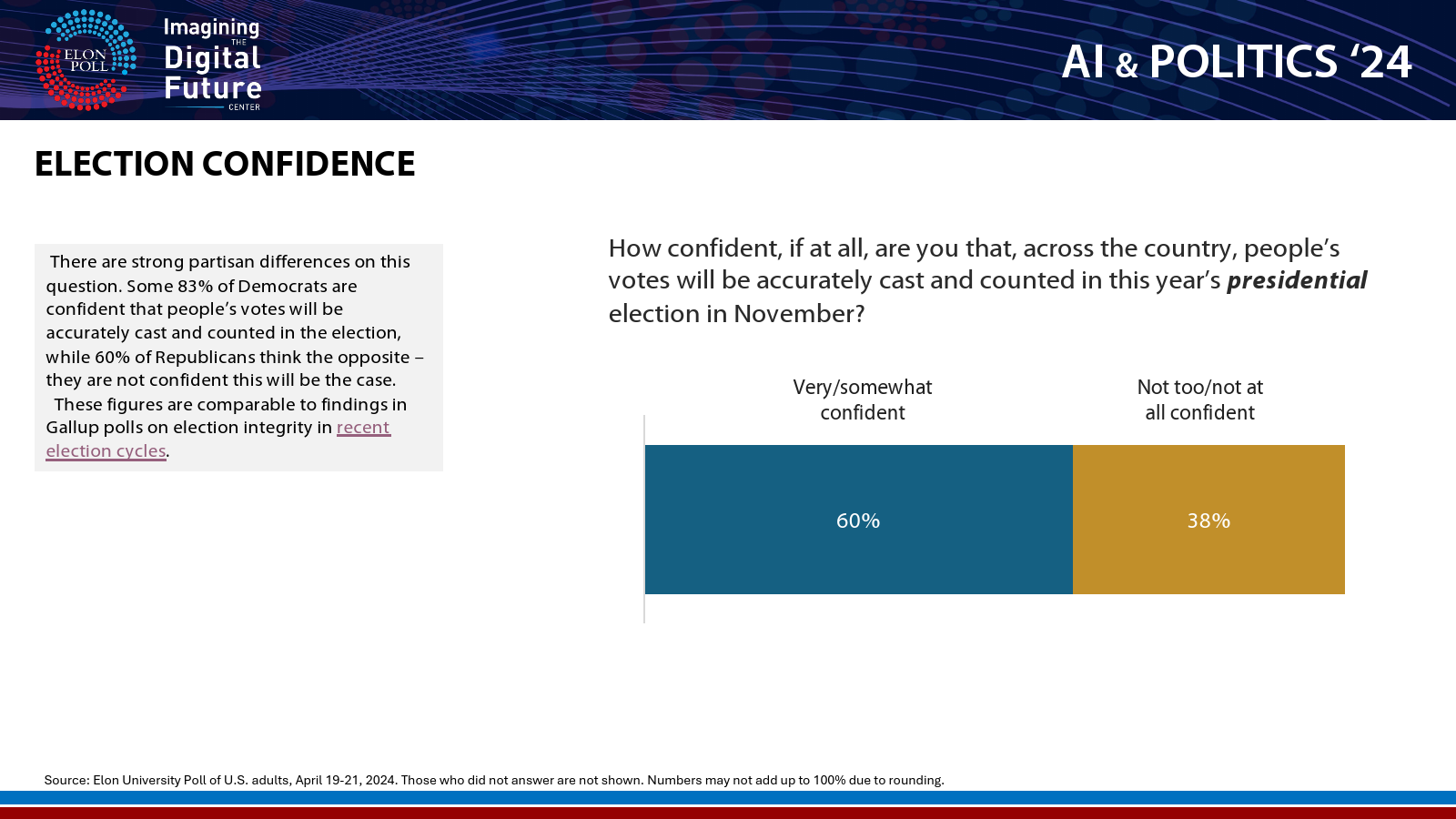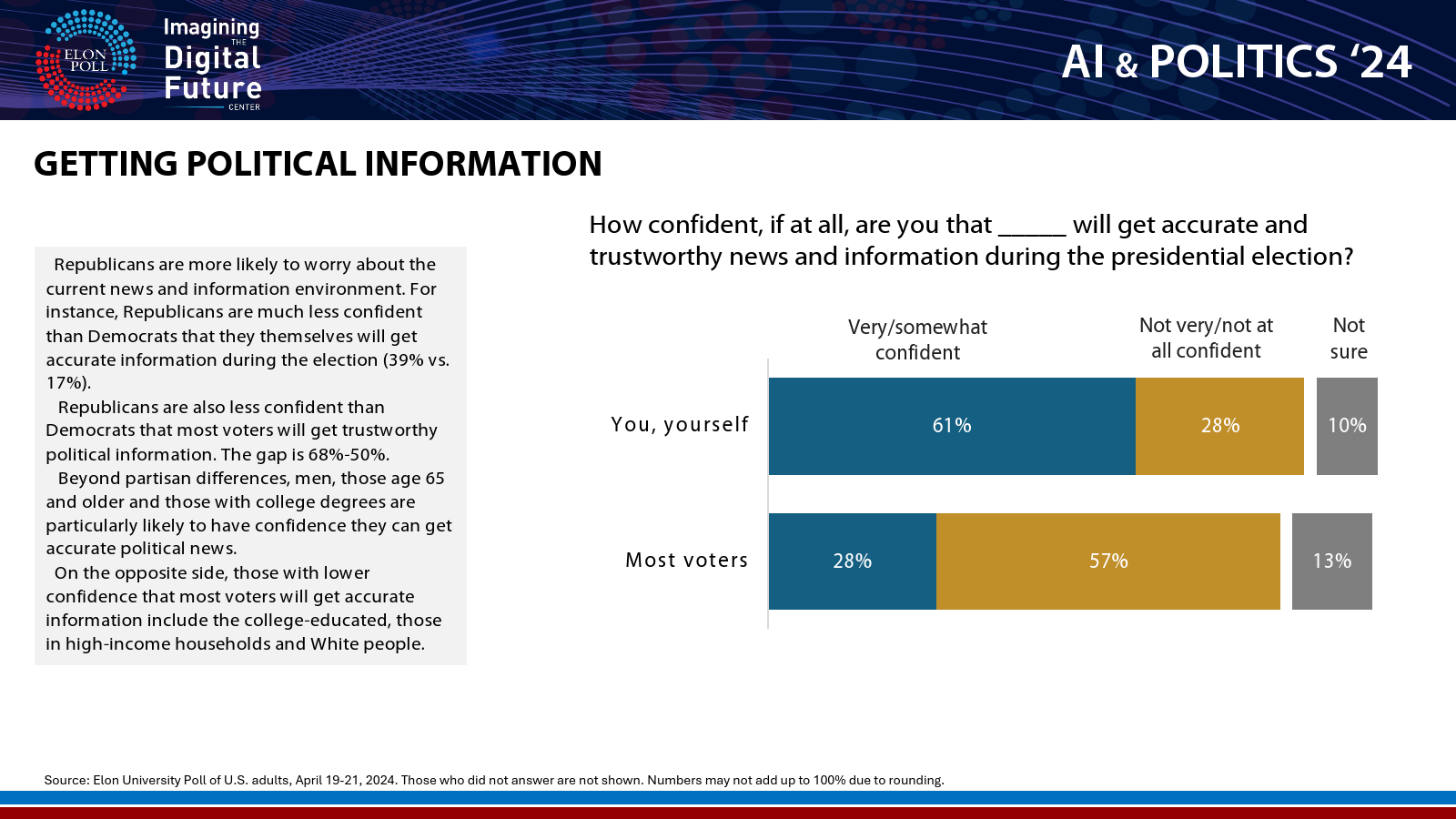 美国人还担心政治的整体新闻和信息环境。约61%的成年人表示,他们“非常”或“有点”有信心在选举期间获得准确可信的信息。28%的人“不太”或“根本不”相信会出现这种情况;10%的人不确定。57%的美国人不相信其他美国人会在选举期间获得准确可靠的信息。28%的美国人相信大多数选民会在选举期间获得准确和可信的信息。
