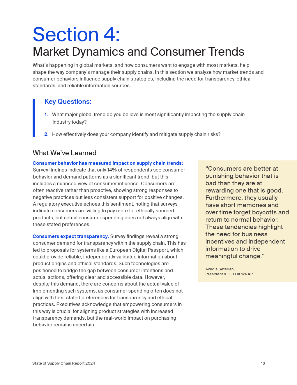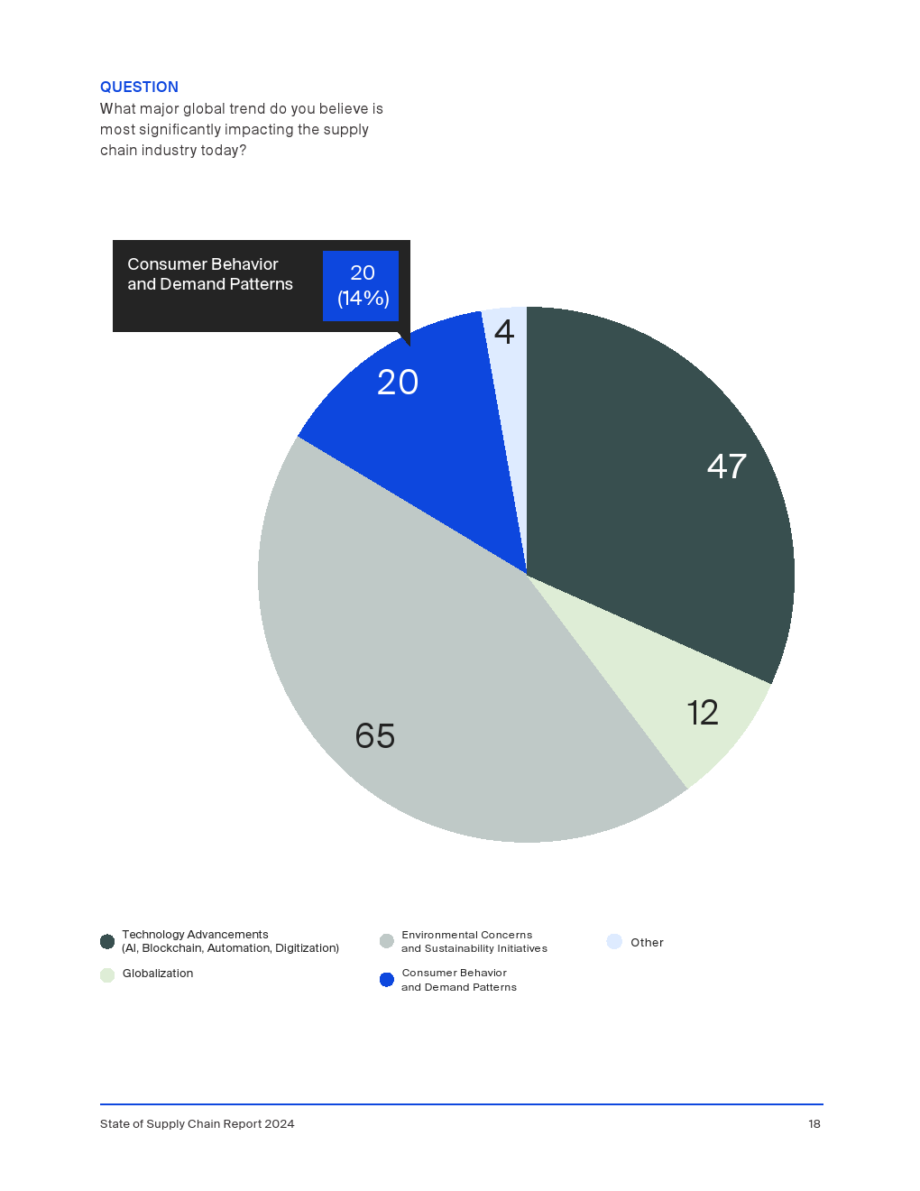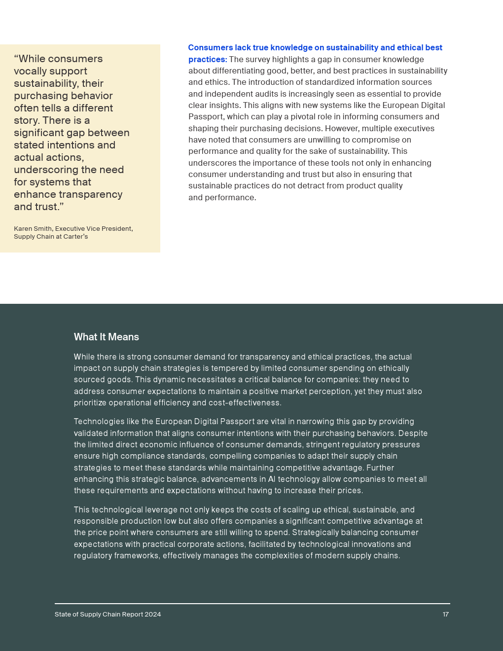 消费者的期望与他们的行为不匹配:消费者对透明度和道德标准的需求影响供应链战略,但只是在一定程度上。只有14%的受访者认为消费者行为是一种重要的趋势,部分原因是大多数消费者不愿意或无法为负责任采购的商品支付溢价。