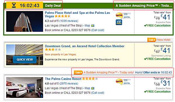 Expedia的酒店搜索结果页面突出显示一个配备计时器的“每日特价”优惠,此外还有一个专利创新产品“秒杀惊喜价”,给予客户机会难得的感觉。如果某个产品的优惠在24小时内结束,在该产品页面的下方,他们会提醒客户要“赶紧预订!”。