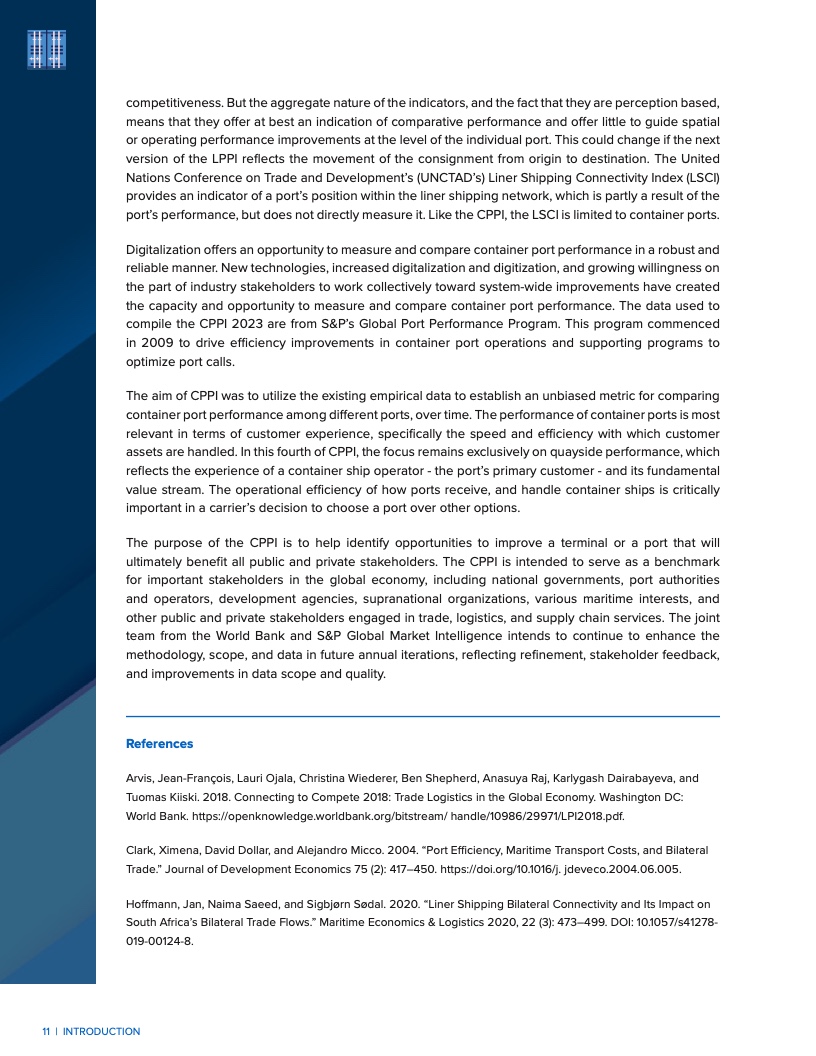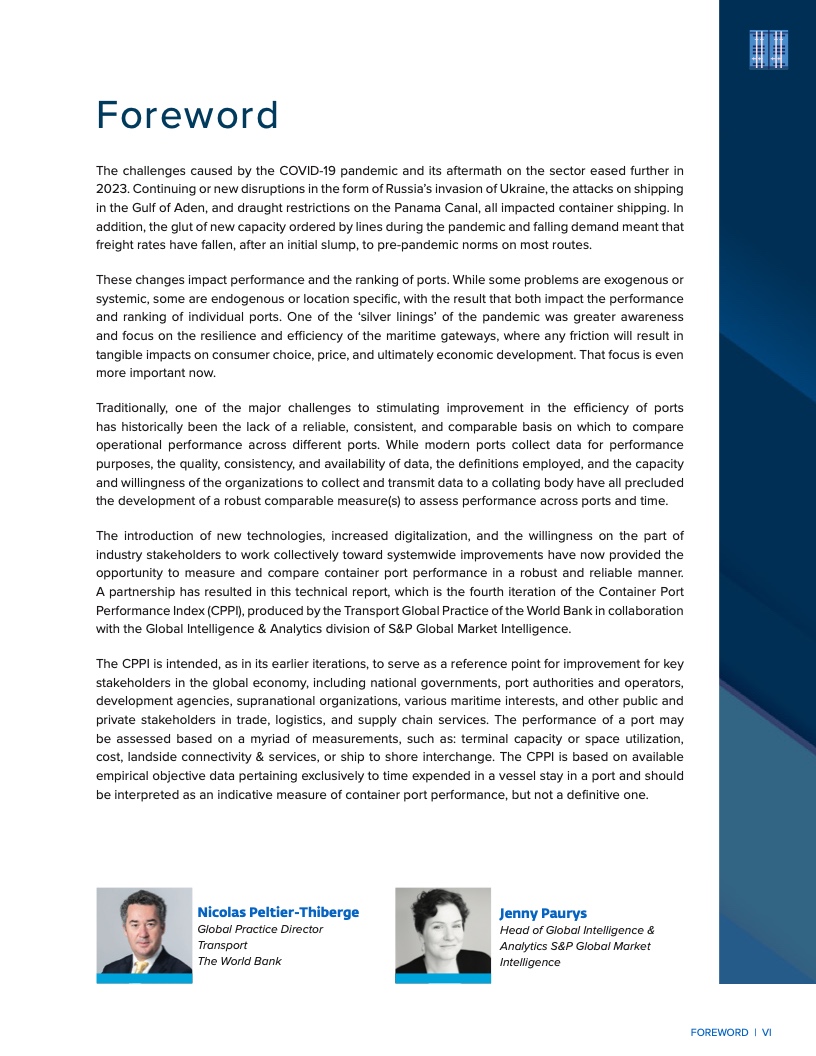 第四期CPPI报告由世界银行和标普全球市场财智联合编制。报告基于迄今为止最为庞大的海运数据集:2023年完整日历年度内,船舶停靠超过18.2万次,集装箱移动量达到2.382 亿次,吞吐量约达 3.81 亿标箱(TEU)。鉴于全球超过80%的商品贸易通过海上运输,港口的韧性、效率和整体绩效对全球市场和经济发展具有重大影响。
