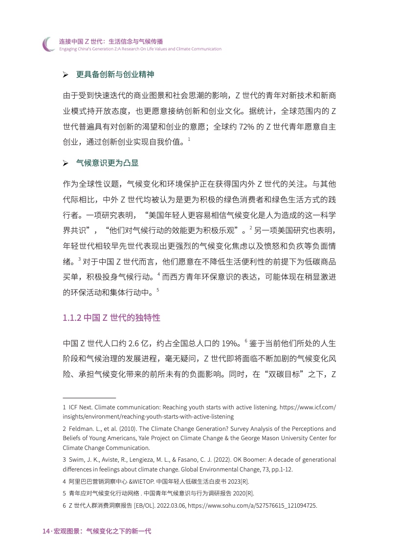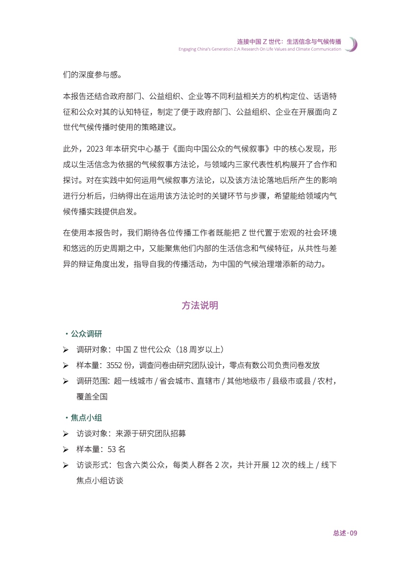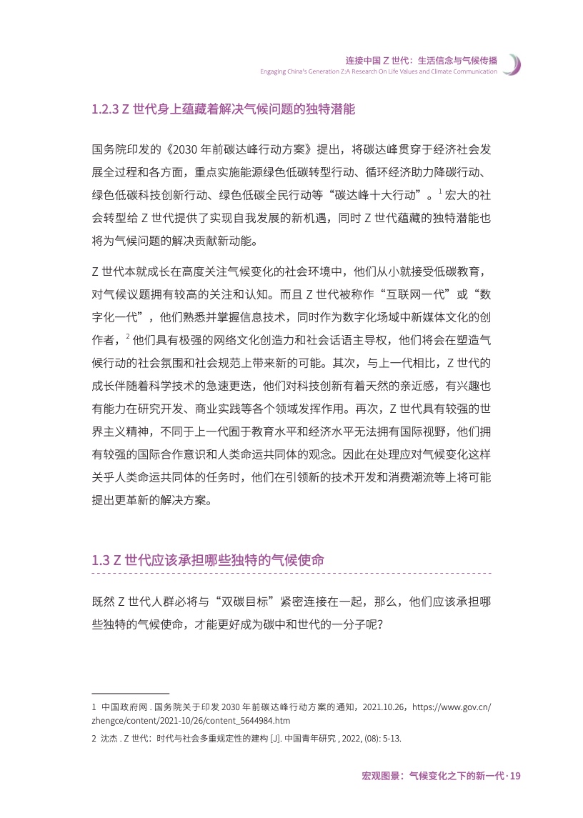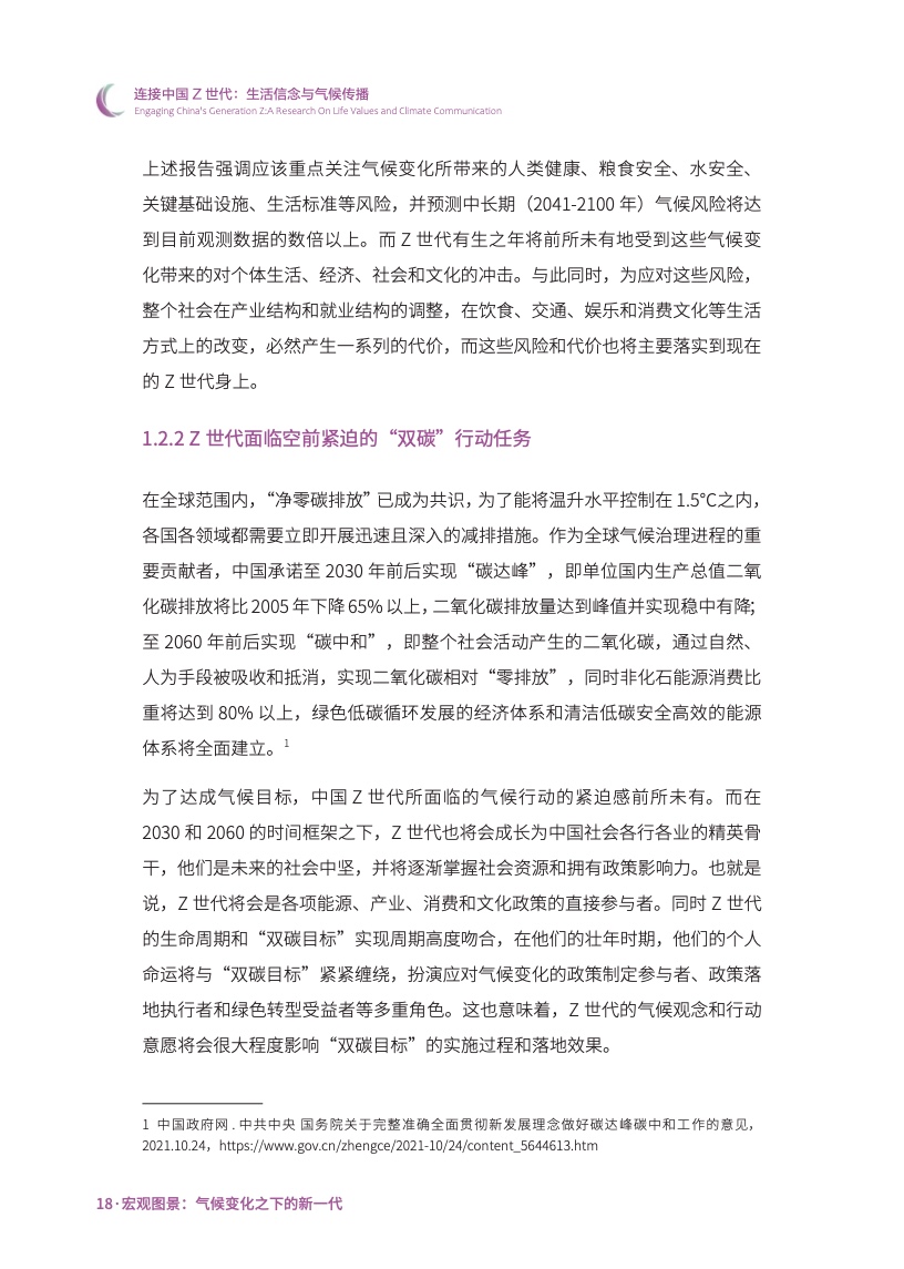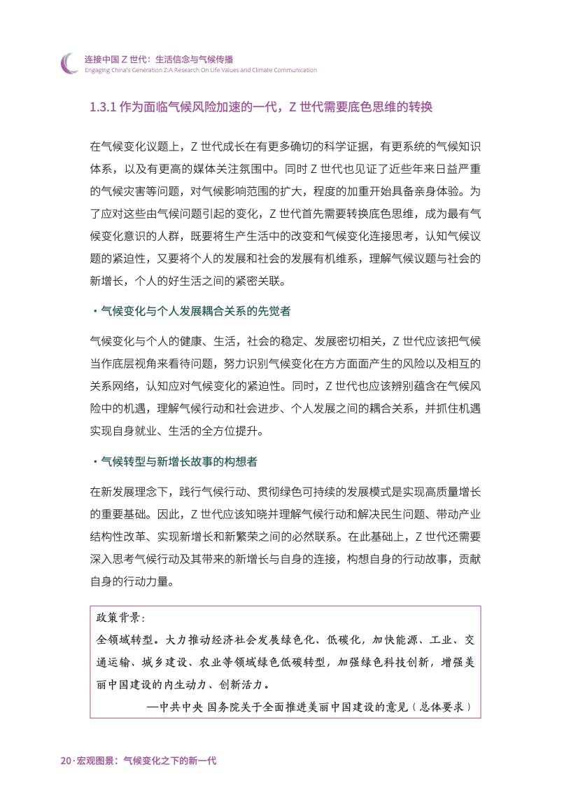 气候传播的不足导致气候议题难以进入 Z 世代的生活方式和人生规划的考量当 中。换句话说,领域内亟需导入对 Z 世代全面的洞察和崭新的方法论,来与 Z 世代建立更深度的连接,激发他们身上蕴藏的独特潜能,撬动他们引领气候行动 的创变。由此本报告延续了《面向中国公众的气候叙事》的方法论,以生活信念 作为公众洞察的底层逻辑,并将关注点转向中国 Z 世代,致力于: