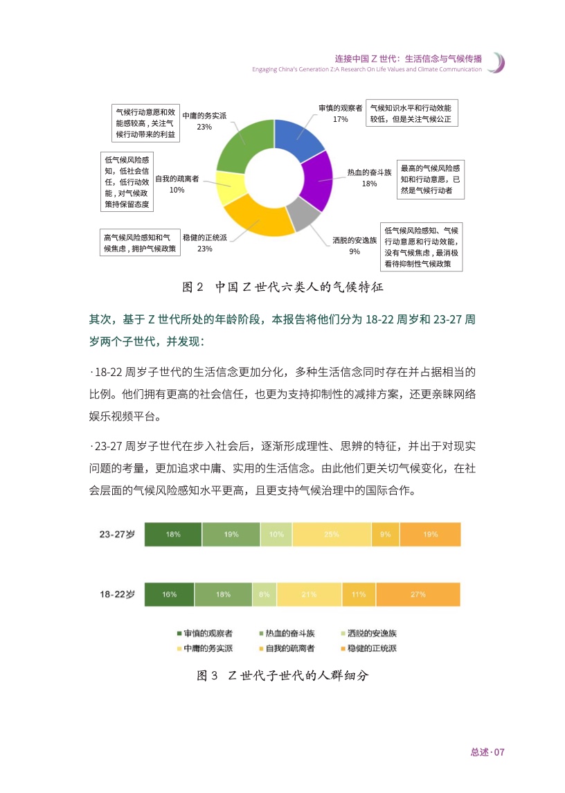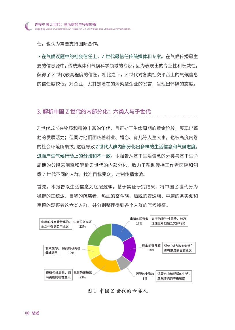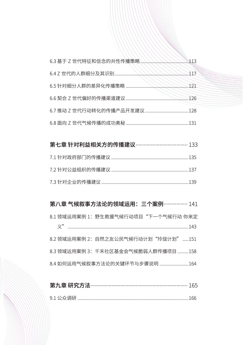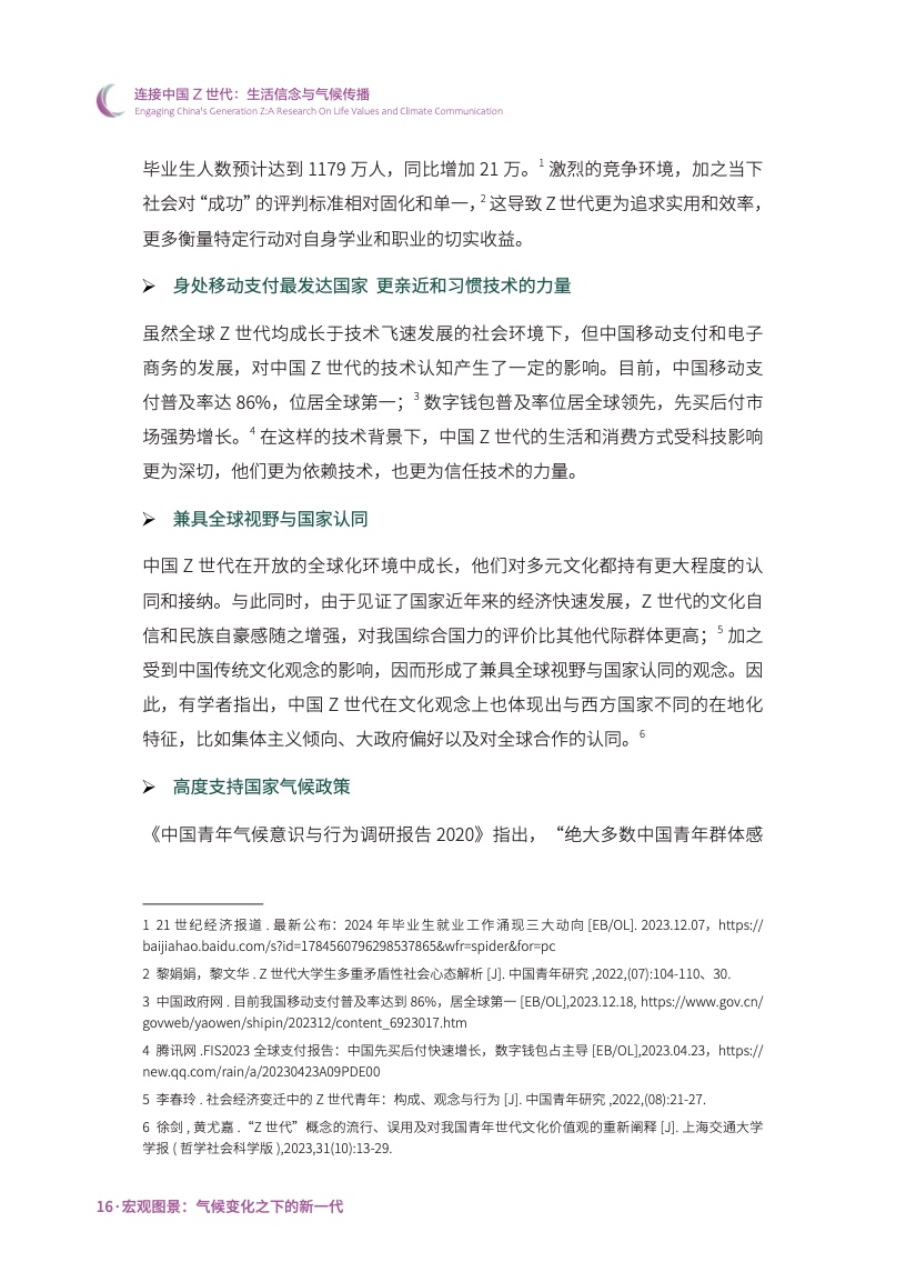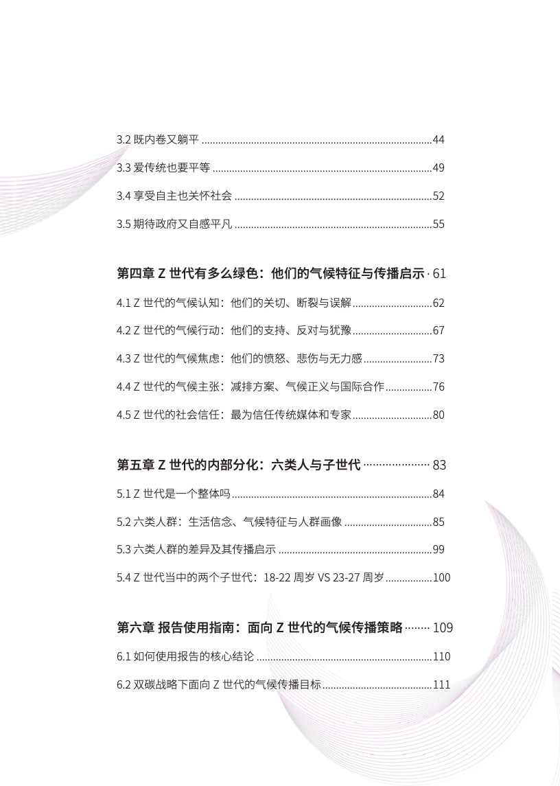 气候传播的不足导致气候议题难以进入 Z 世代的生活方式和人生规划的考量当 中。换句话说,领域内亟需导入对 Z 世代全面的洞察和崭新的方法论,来与 Z 世代建立更深度的连接,激发他们身上蕴藏的独特潜能,撬动他们引领气候行动 的创变。由此本报告延续了《面向中国公众的气候叙事》的方法论,以生活信念 作为公众洞察的底层逻辑,并将关注点转向中国 Z 世代,致力于: