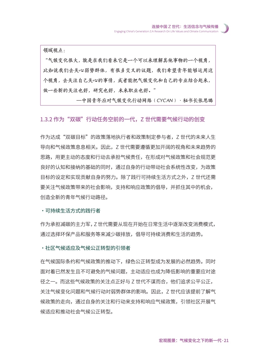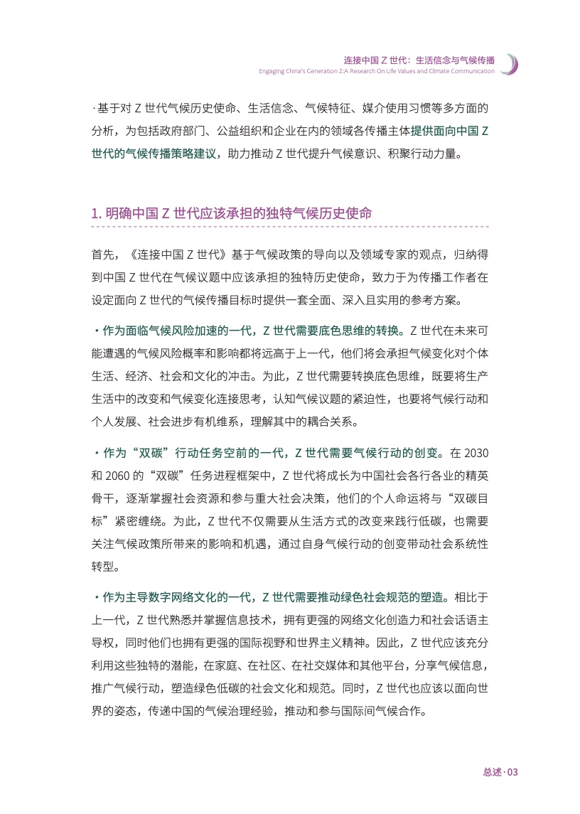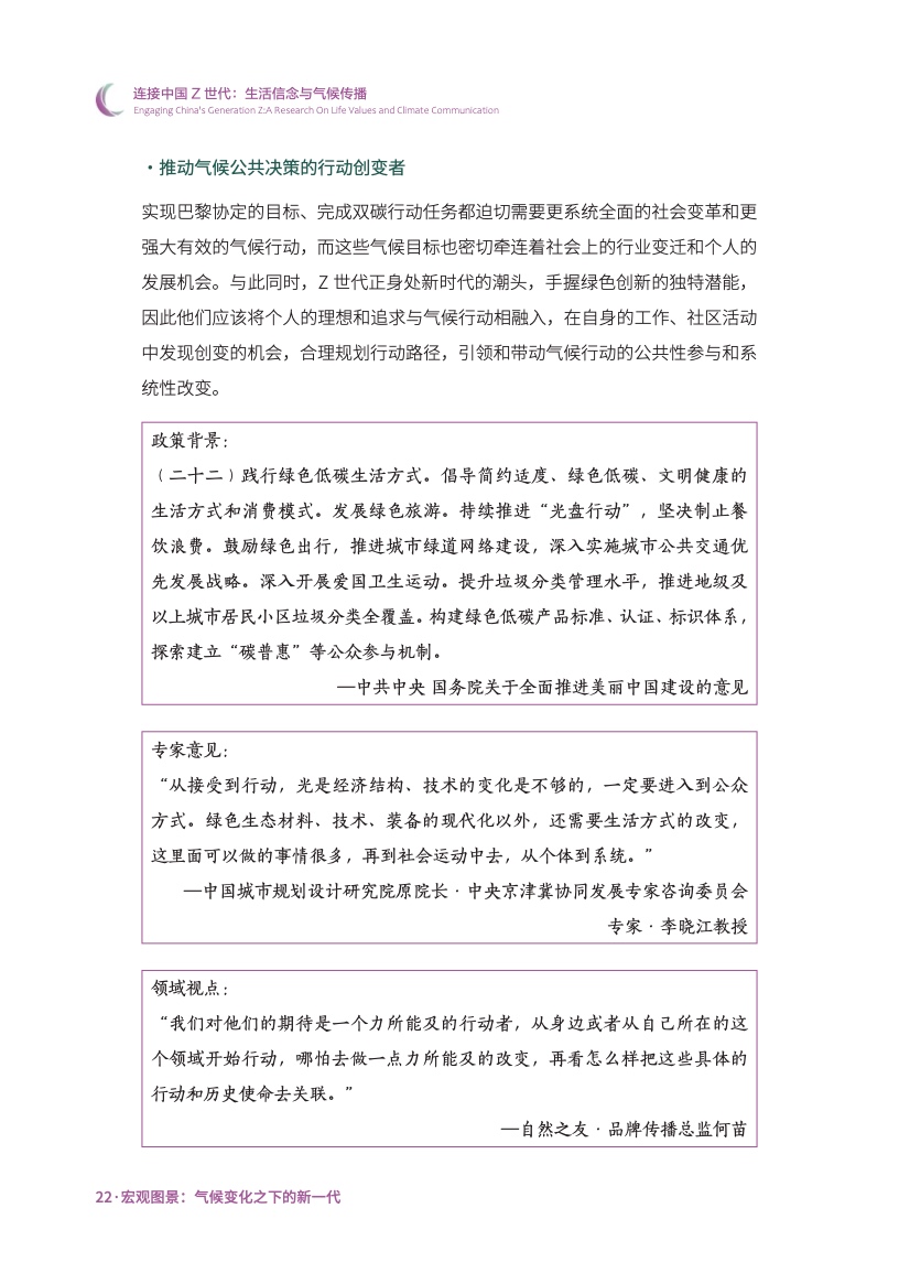·通过分析宏观政策趋势和对于领域专家及实践者的访谈,提供对中国 Z 世代肩 负的气候历史使命和传播目标的深入剖析;