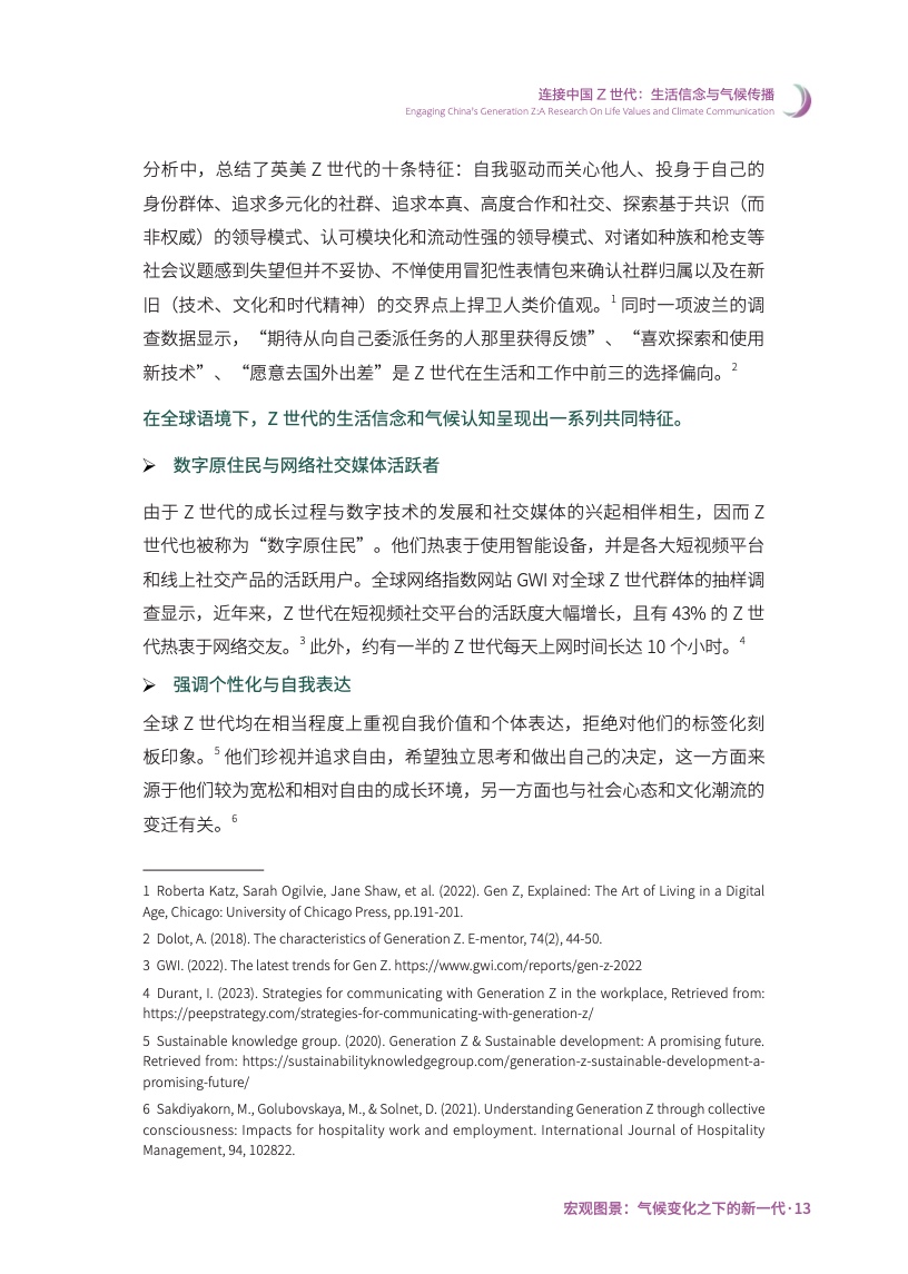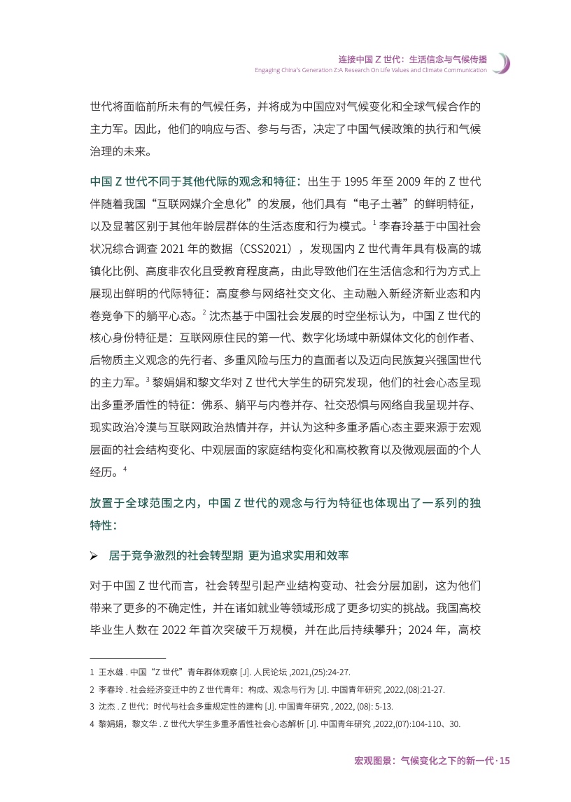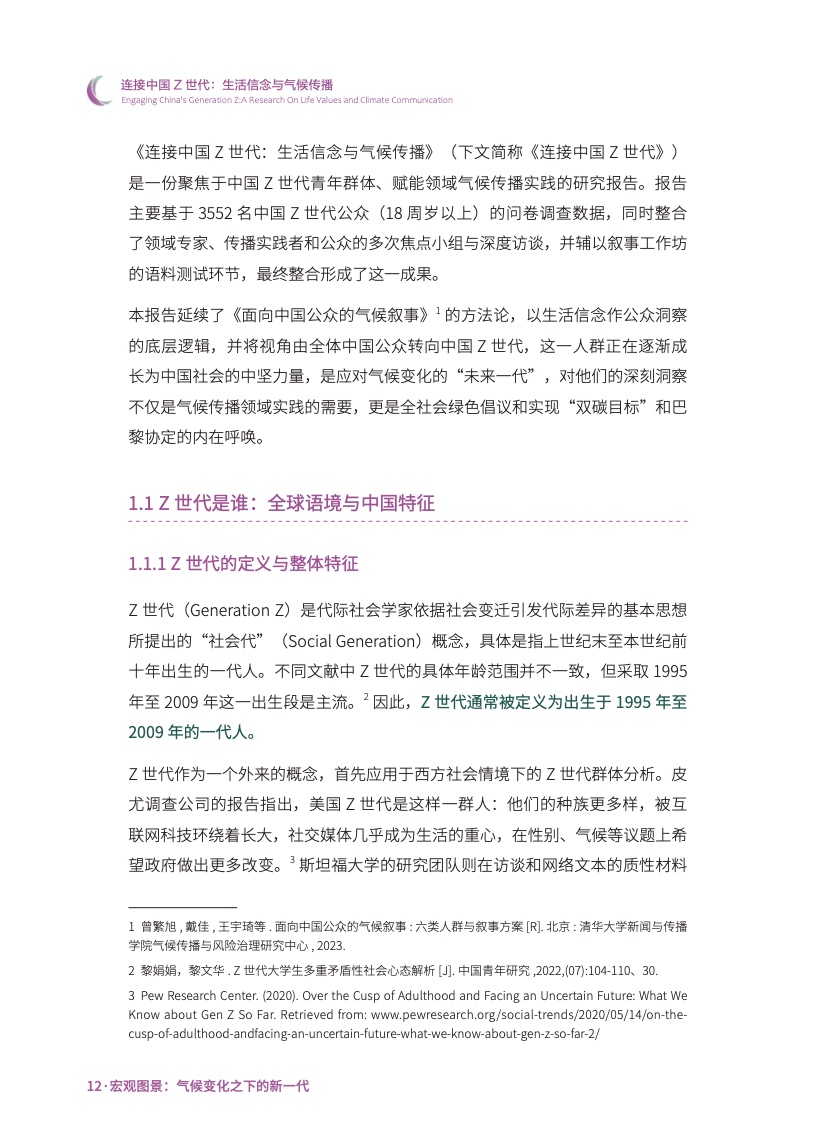 《连接中国 Z 世代:生活信念与气候传播》是一份聚焦于中国 Z 世代青年群体、 旨在赋能领域气候传播实践的研究报告。Z 世代通常是指 1995 年至 2009 年出 生的一代人,他们见证了气候变化对人类影响的逐渐加速,并正在逐渐成长为 社会的中坚力量。因此,他们的气候意识更为凸显,气候行动也将更具影响力。当前国际气候传播学界与业界都逐渐把目光投向了 Z 世代人群,积极探讨如何 通过传播来改变他们对气候议题的认知、态度和行动,进而推动气候目标的达成。